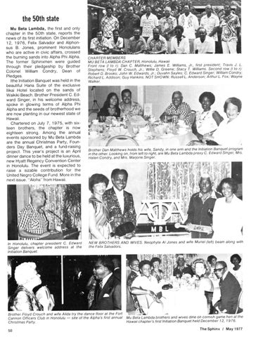 the 50th state Mu Beta Lambda, the first and only chapter in the 50th state, reports the news of its first initiation. On December 12, 1976, Felix Salvador and Alphonsus B. Jones, prominent Honolulans who are active in civic affairs, crossed the burning sands into Alpha Phi Alpha. The former Sphinxmen were guided through their pledgeship by Brother Colonel William Condry, Dean of Pledges. Ithe Initiation Banquet was held in the beautiful Hana Suite of the exclusive llikai Hotel located on the sands of Waikiki Beach. Brother President C. Edward Singer, in his welcome address, spoke in glowing terms of Alpha Phi Alpha and the seeds of brotherhood we are now planting in our newest state of Hawaii. Chartered on July 7, 1975, with sixteen brothers, the chapter is now eighteen strong. Among the annual events sponsored by Mu Beta Lambda are the annual Christmas Party, Founders Day Banquet, and a fund-raising project. This year's project is an April dinner dance to be held at the luxurious, new Hyatt Regency Convention Center in Honolulu. The event is expected to raise a sizable contribution for the United Negro College Fund. More in the next issue. "Aloha" from Hawaii.