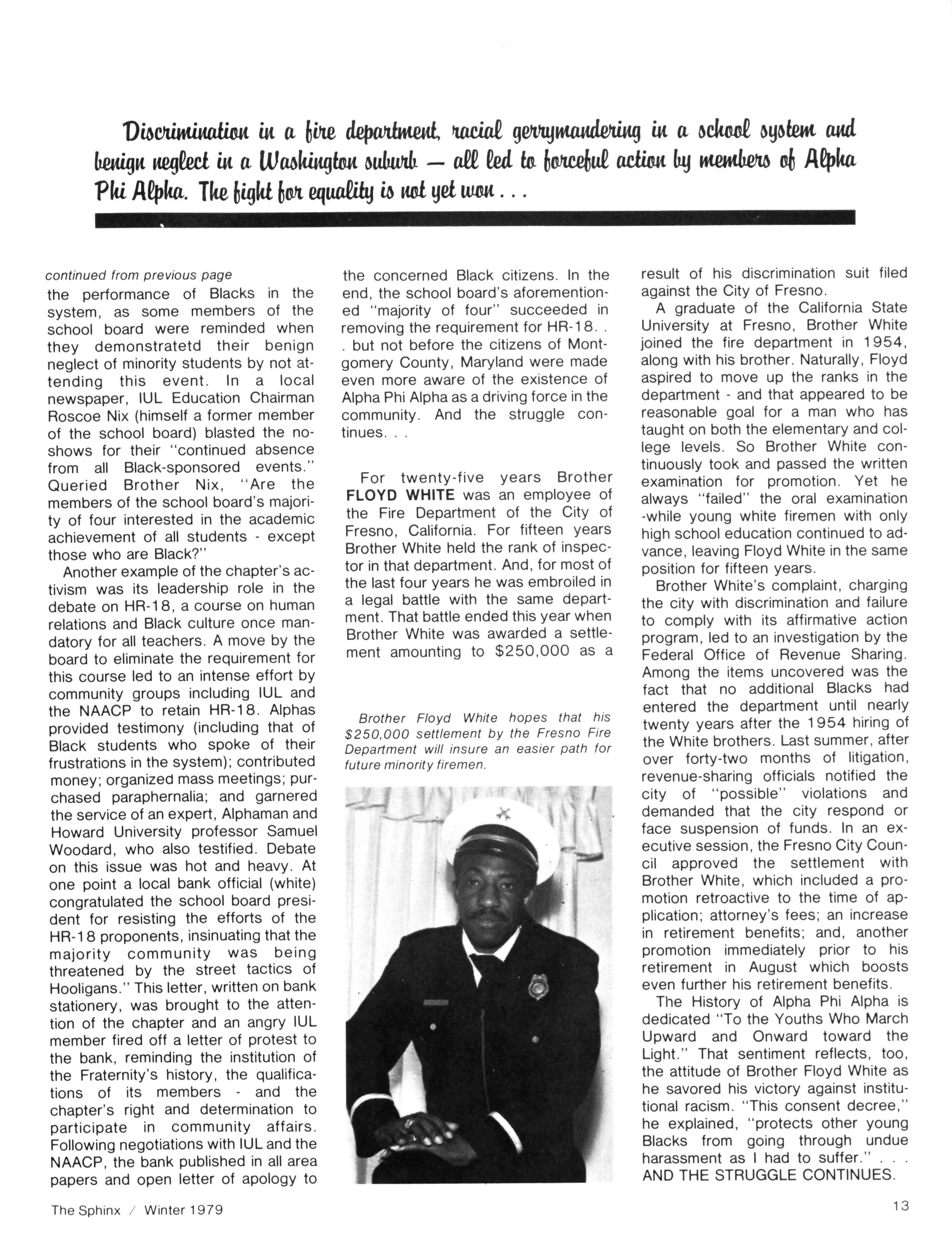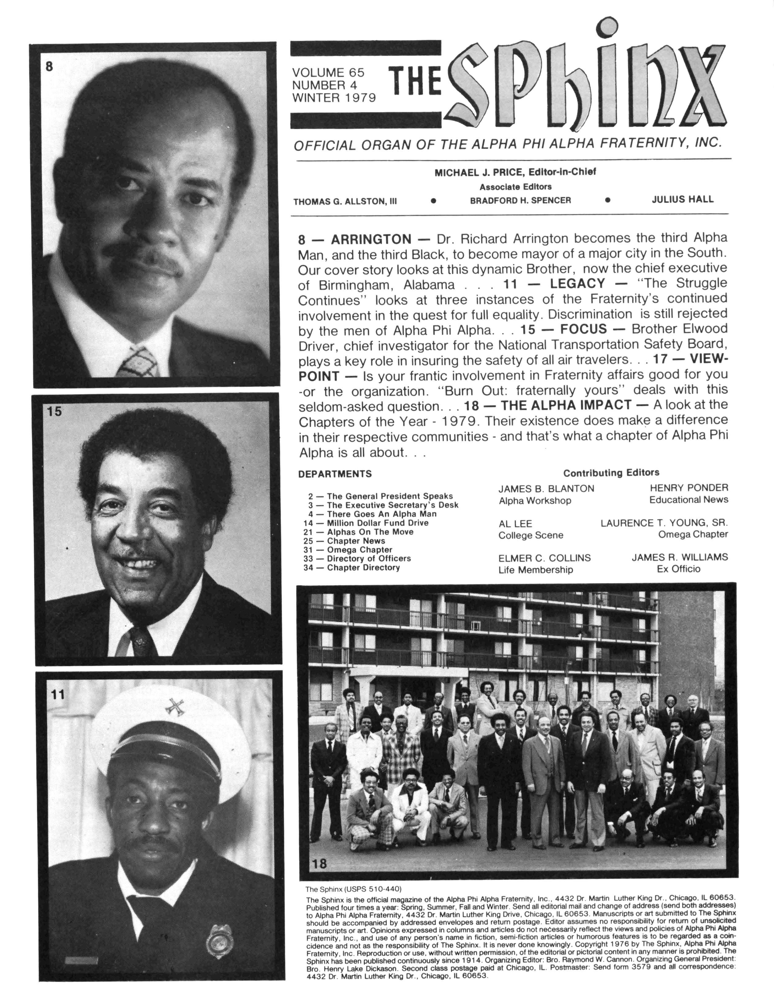 8 _ ARRINGTON — Dr Richard Arrington becomes the third Alpha Man, and the third Black, to become mayor of a major city in the South Our cover story looks at this dynamic Brother, now the chief executive of Birmingham, Alabama .. . 11 — LEGACY — "The Struggle Continues" looks at three instances of the Fraternity's continued involvement in the quest for full equality Discrimination is still rejected by the men of Alpha Phi Alpha 15 — FOCUS — Brother Elwood Driver, chief investigator for the National Transportation Safety Board, plays a key role in insuring the safety of all air travelers 17 — VIEWPOINT — Is your frantic involvement in Fraternity affairs good for you -or the organization "Burn Out: fraternally yours" deals with this seldom-asked question. . . 18 — THE ALPHA IMPACT — A look at the Chapters of the Year - 1979 Their existence does make a difference in their respective communities - and that's what a chapter of Alpha Phi Alpha is all about