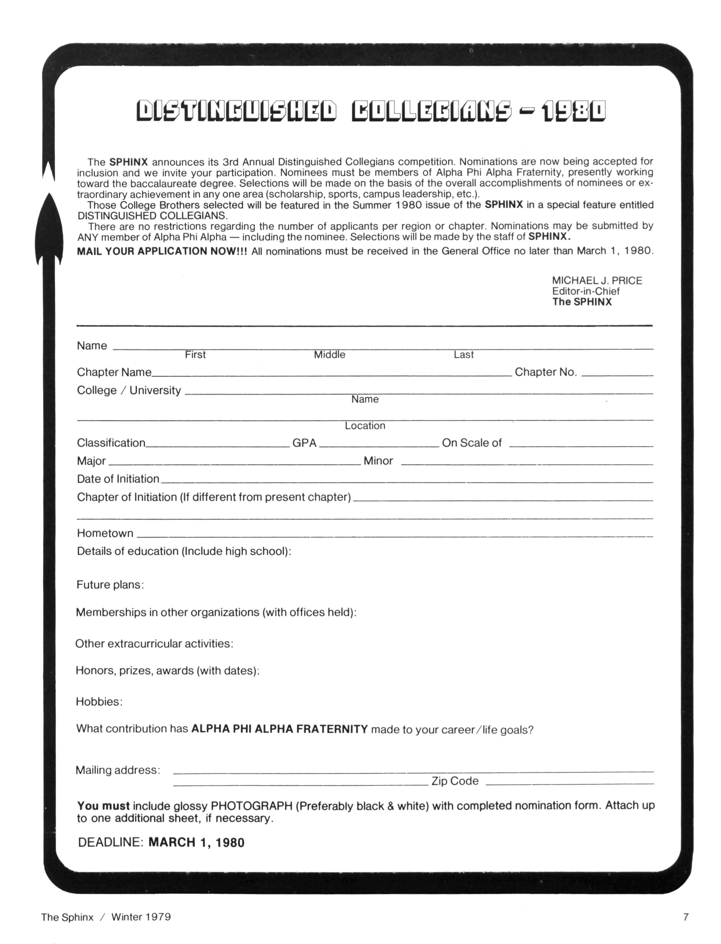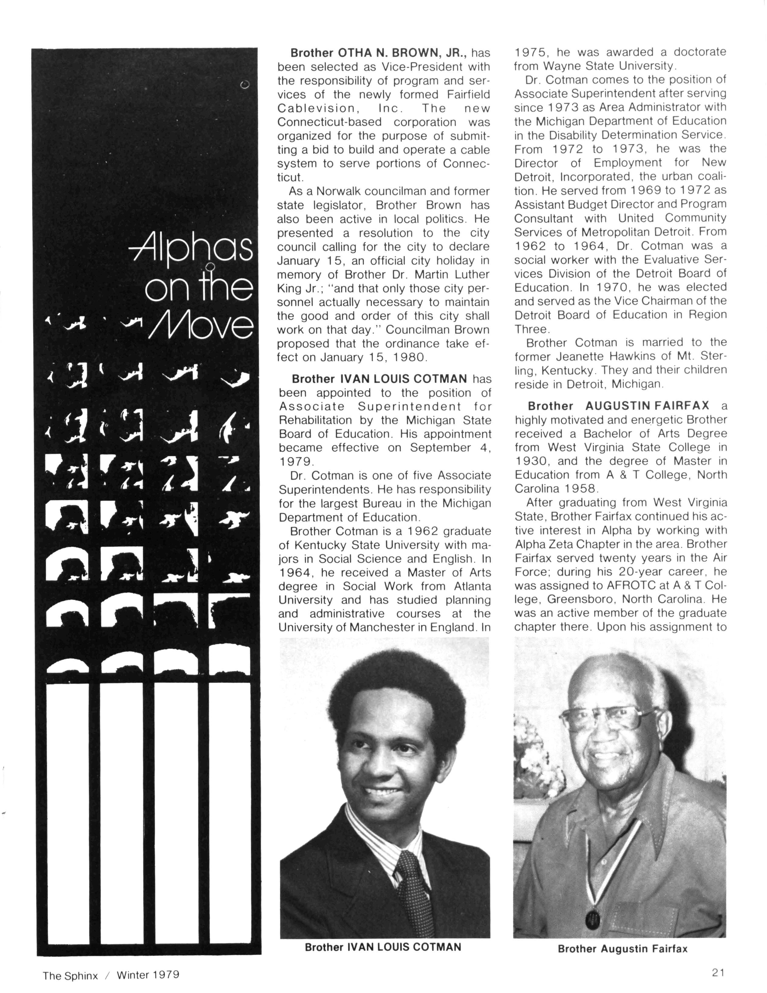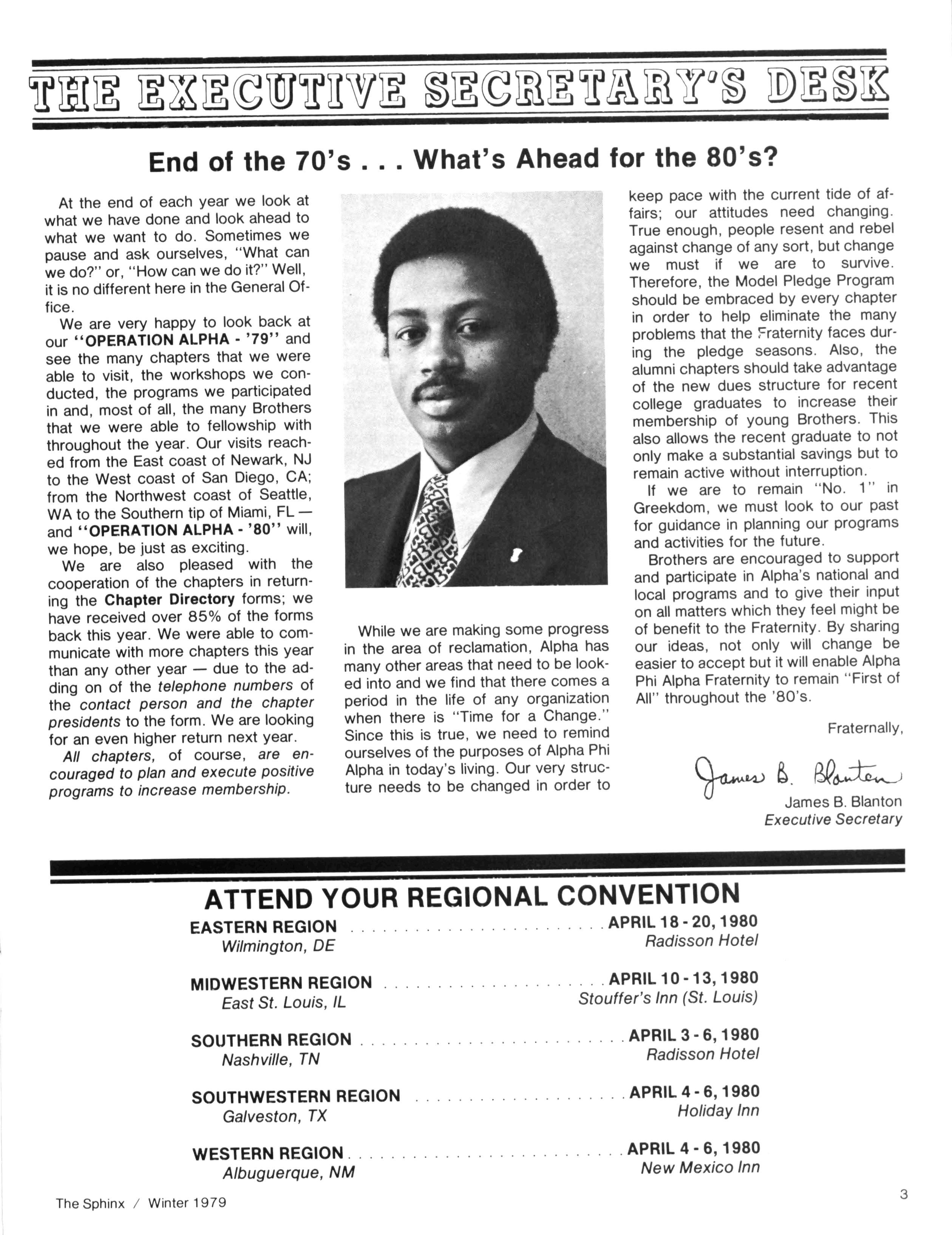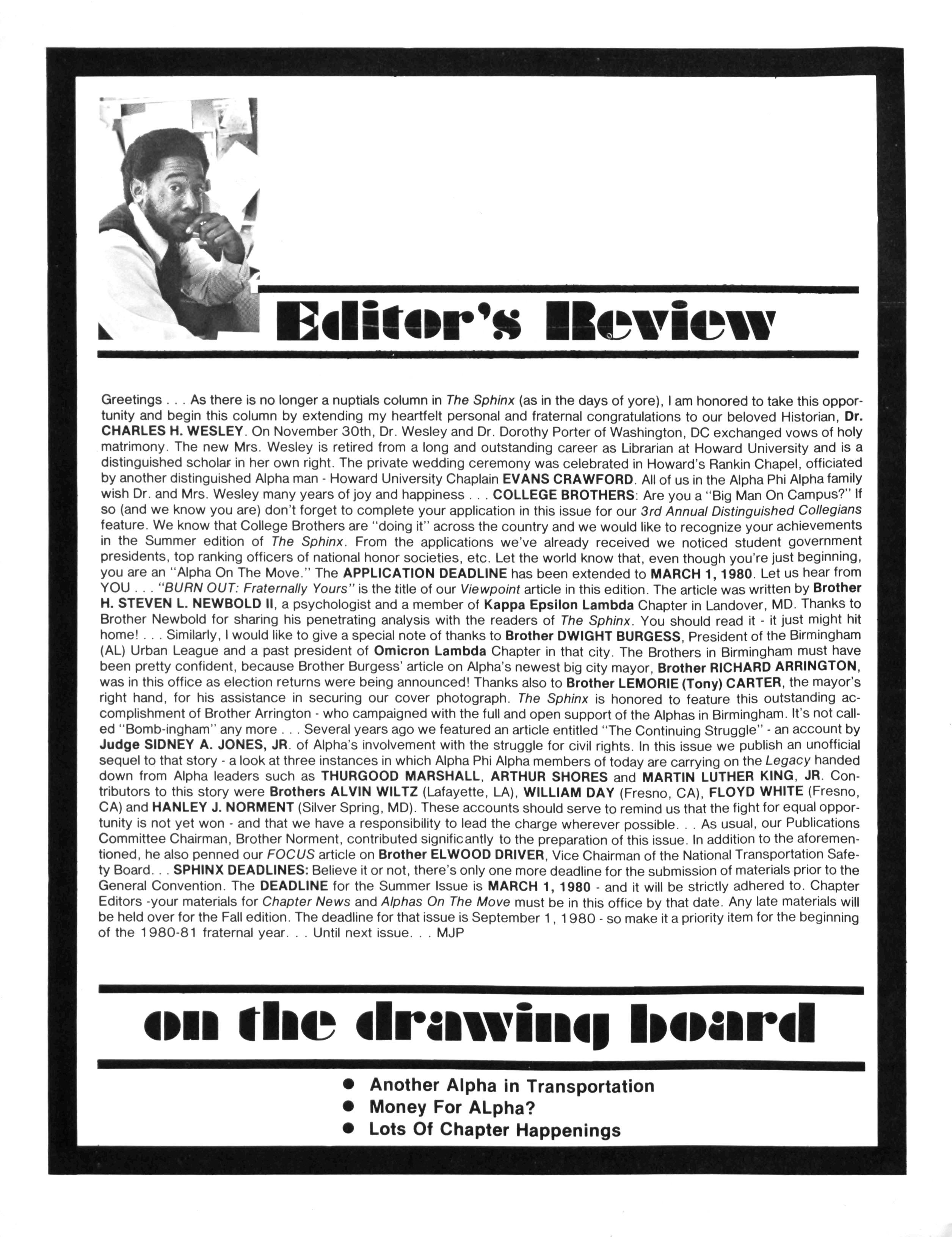 Greetings ... As there is no longer a nuptials column in The Sphinx (as in the days of yore), Iam honored to take this opportunity and begin this column by extending my heartfelt personal and fraternal congratulations to our beloved Historian, Dr CHARLES H. WESLEY. On November 30th, Dr Wesley and Dr Dorothy Porter of Washington, DC exchanged vows of holy matrimony The new Mrs Wesley is retired from a long and outstanding career as Librarian at Howard University and is a distinguished scholar in her own right The private wedding ceremony was celebrated in Howard's Rankin Chapel, officiated by another distinguished Alpha man - Howard University Chaplain EVANS CRAWFORD All of us in the Alpha Phi Alphafamily wish Dr and Mrs Wesley many years of joy and happiness COLLEGE BROTHERS: Are you a "Big Man On Campus?" If so (and we know you are) don't forget to complete your application in this issue for our 3rd Annual Distinguished Collegians feature We know that College Brothers are "doing it" across the country and we would like to recognize your achievements in the Summer edition of The Sphinx. From the applications we've already received we noticed student government presidents, top ranking officers of national honor societies, etc Let the world know that, even though you're just beginning, you are an "Alpha On The Move." The APPLICATION DEADLINE has been extended to MARCH 1,1980. Let us hear from YOU "BURN OUT: Fraternally Yours" is the title of our Viewpoint article in this edition The article was written by Brother H. STEVEN L. NEWBOLD II, a psychologist and a member of Kappa Epsilon Lambda Chapter in Landover, MD Thanks to Brother Newbold for sharing his penetrating analysis with the readers of The Sphinx. You should read it - it just might hit home! Similarly, Iwould like to give a special note of thanks to Brother DWIGHT BURGESS, President of the Birmingham (AL) Urban League and a past president of Omicron Lambda Chapter in that city. The Brothers in Birmingham must have been pretty confident, because Brother Burgess' article on Alpha's newest big city mayor, Brother RICHARD ARRINGTON, was in this office as election returns were being announced! Thanks also to Brother LEMORIE (Tony) CARTER, the mayor's right hand, for his assistance in securing our cover photograph The Sphinx is honored to feature this outstanding accomplishment of Brother Arrington -who campaigned with the full and open support of the Alphas in Birmingham It's not called "Bomb-ingham" any more Several years ago we featured anarticle entitled "The Continuing Struggle" -anaccount by Judge SIDNEY A. JONES, JR. of Alpha's involvement with the struggle for civil rights In this issue we publish an unofficial sequel to that story -alook at three instances in which Alpha Phi Alpha members of today are carrying on the Legacy handed down from Alpha leaders such as THURGOOD MARSHALL, ARTHUR SHORES and MARTIN LUTHER KING, JR. Contributors to this story were Brothers ALVIN WILTZ (Lafayette, LA), WILLIAM DAY (Fresno, CA), FLOYD WHITE (Fresno, CA) and HANLEY J NORMENT (Silver Spring, MD) These accounts should serve to remind us that the fight for equal opportunity is not yet won - and that we have a responsibility to lead the charge wherever possible As usual, our Publications Committee Chairman, Brother Norment, contributed significantly to the preparation of this issue In addition to the aforementioned, he also penned our FOCUS article on Brother ELWOOD DRIVER, Vice Chairman of the National Transportation Safety Board SPHINX DEADLINES: Believe it or not, there's only one more deadline for the submission of materials prior to the General Convention The DEADLINE for the Summer Issue is MARCH 1, 1980 - and it will be strictly adhered to Chapter Editors -your materials for Chapter News and Alphas On The Move must be in this office by that date. Any late materials will be held over for the Fall edition The deadline for that issue is September 1, 1980 -so make it apriority item for the beginning of the 1980-81 fraternal year. . . Until next issue. . . MJP