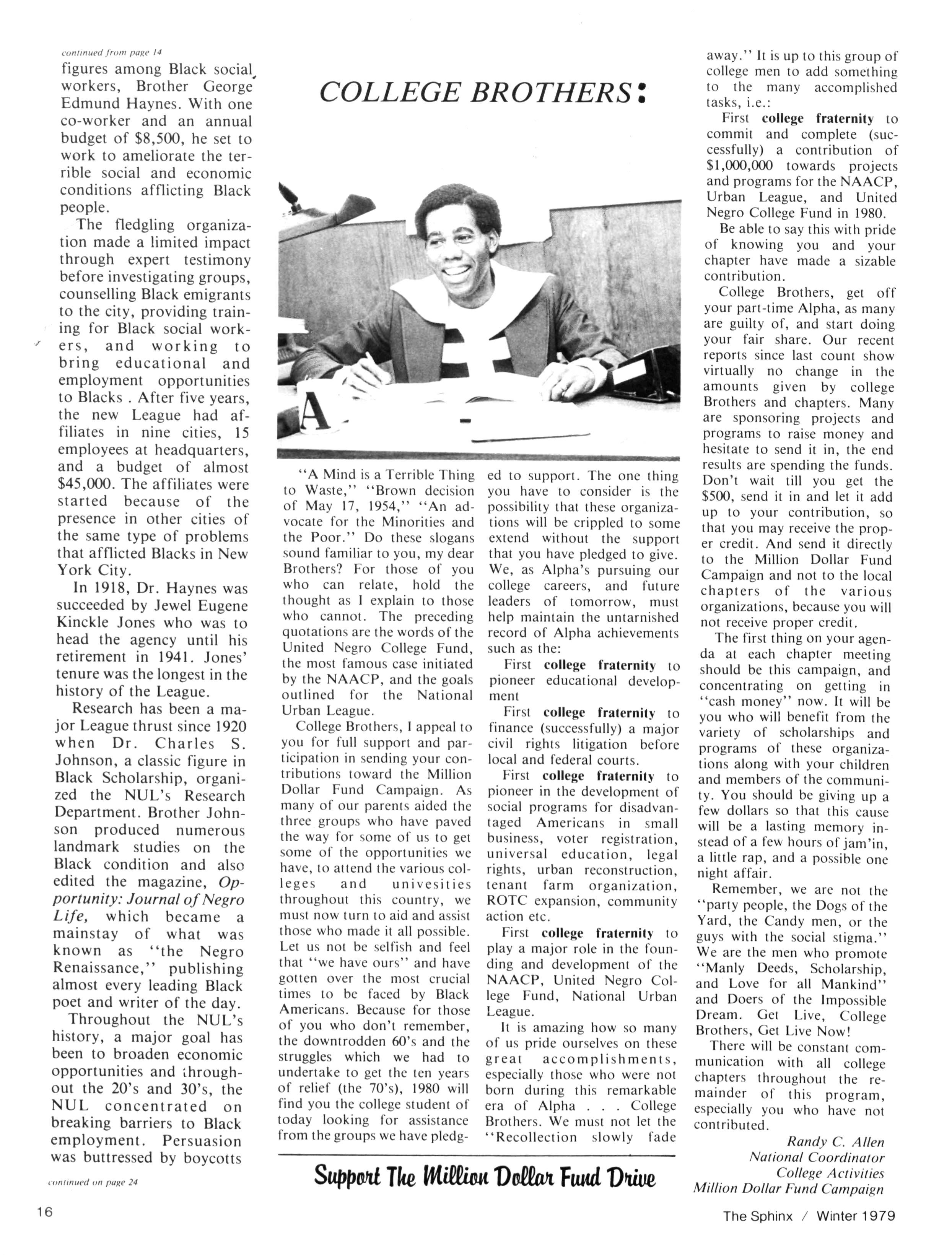 Prior to the 1979 General Convention, we outlined to the Brotherhood a primary challenge facing Alpha Phi Alpha - the need for an expanded financial base for essential Fraternity operations Topping our list of concerns was the need to expand the national headquarters staff to meet the needs of our growing organization and the call to build up the Fraternity's program budget. At the last convention, we presented specific proposals designed to remedy these and other shortcomings and thus strengthen our organization