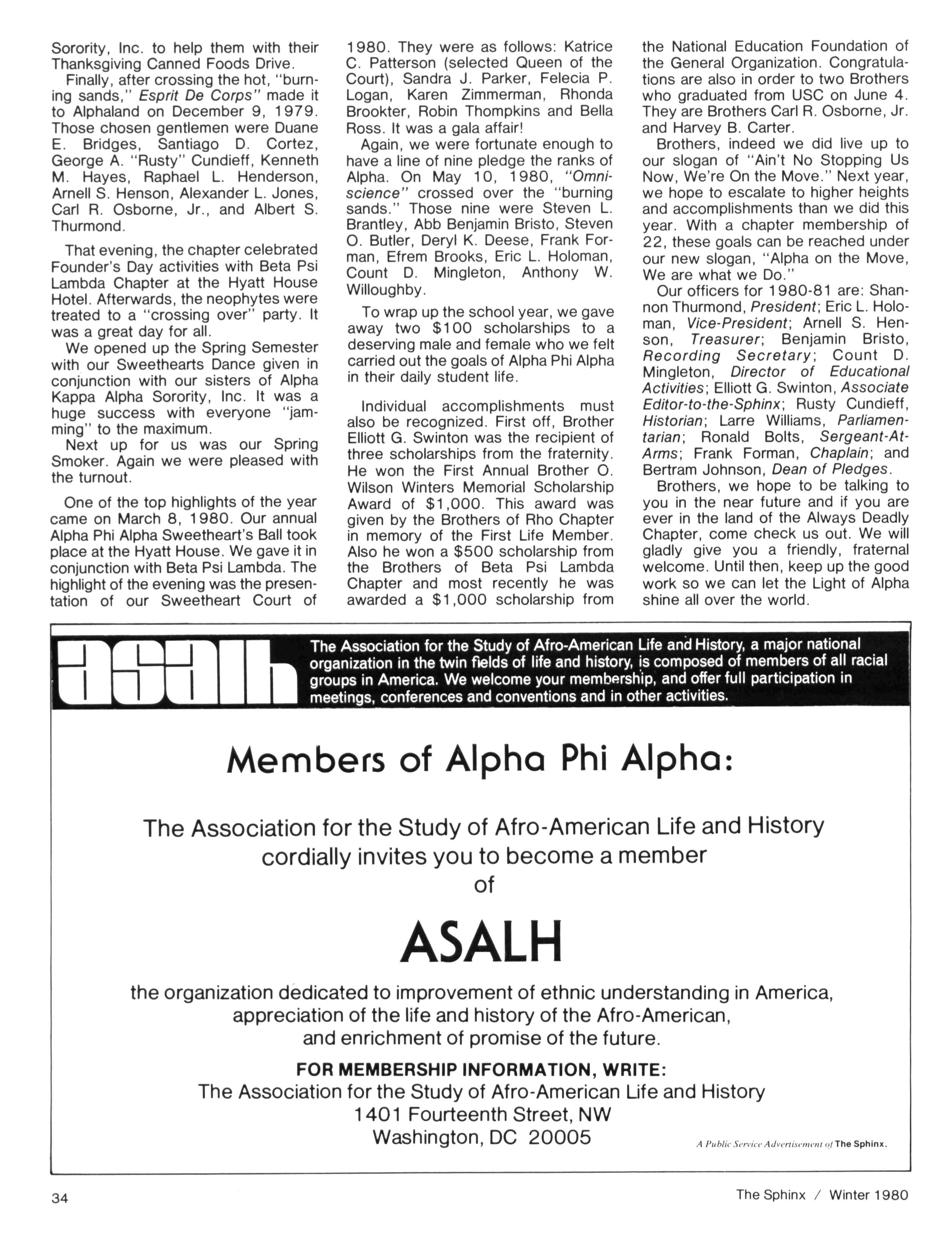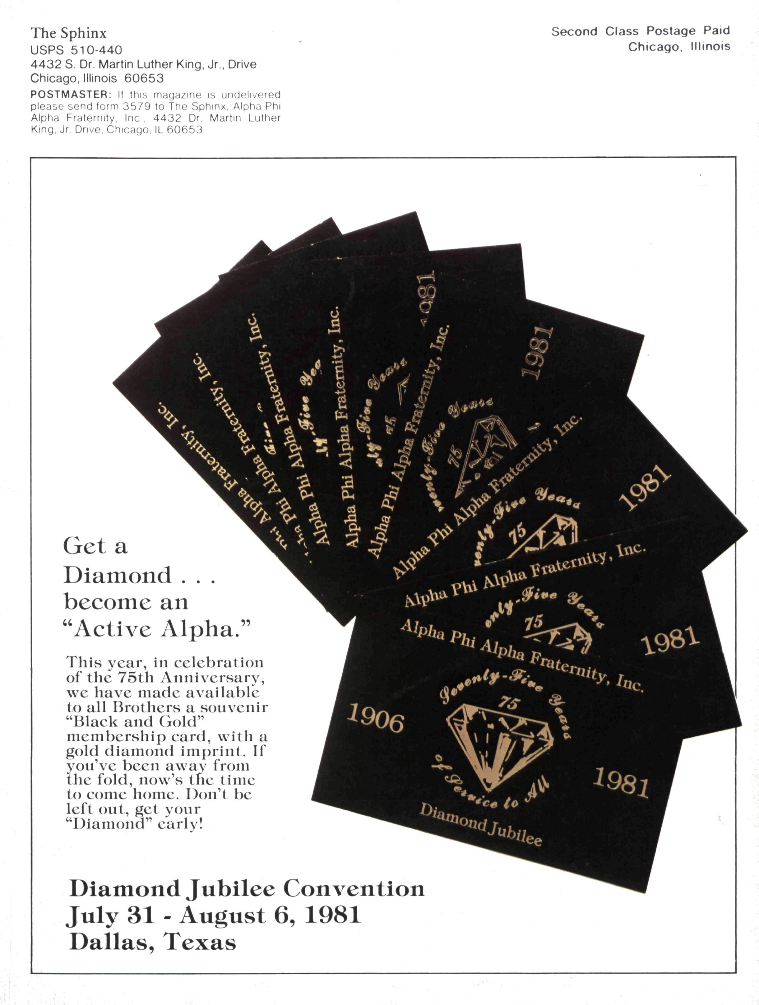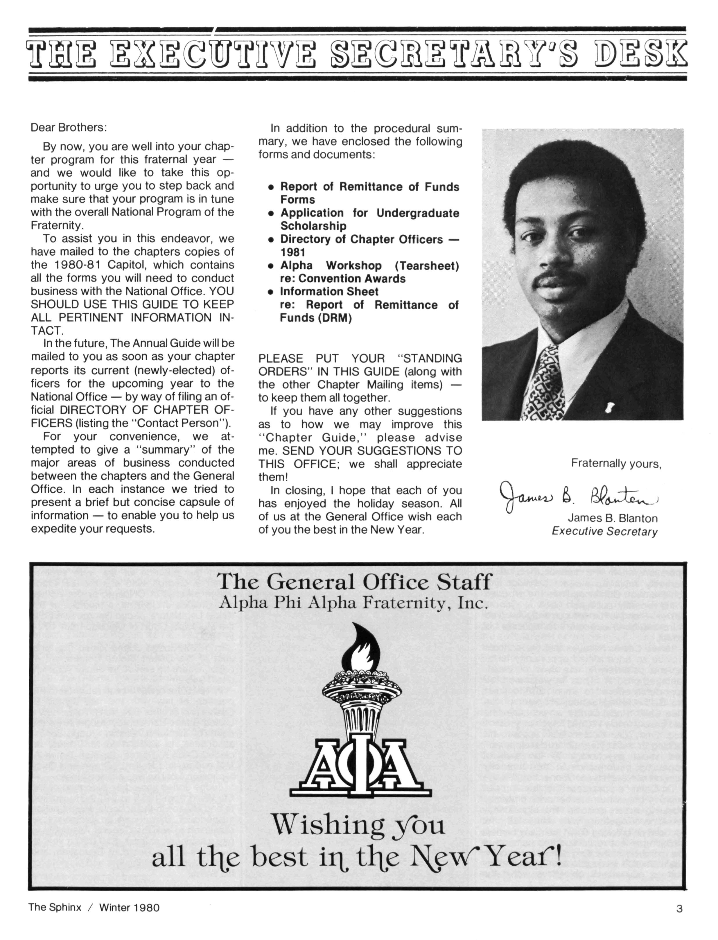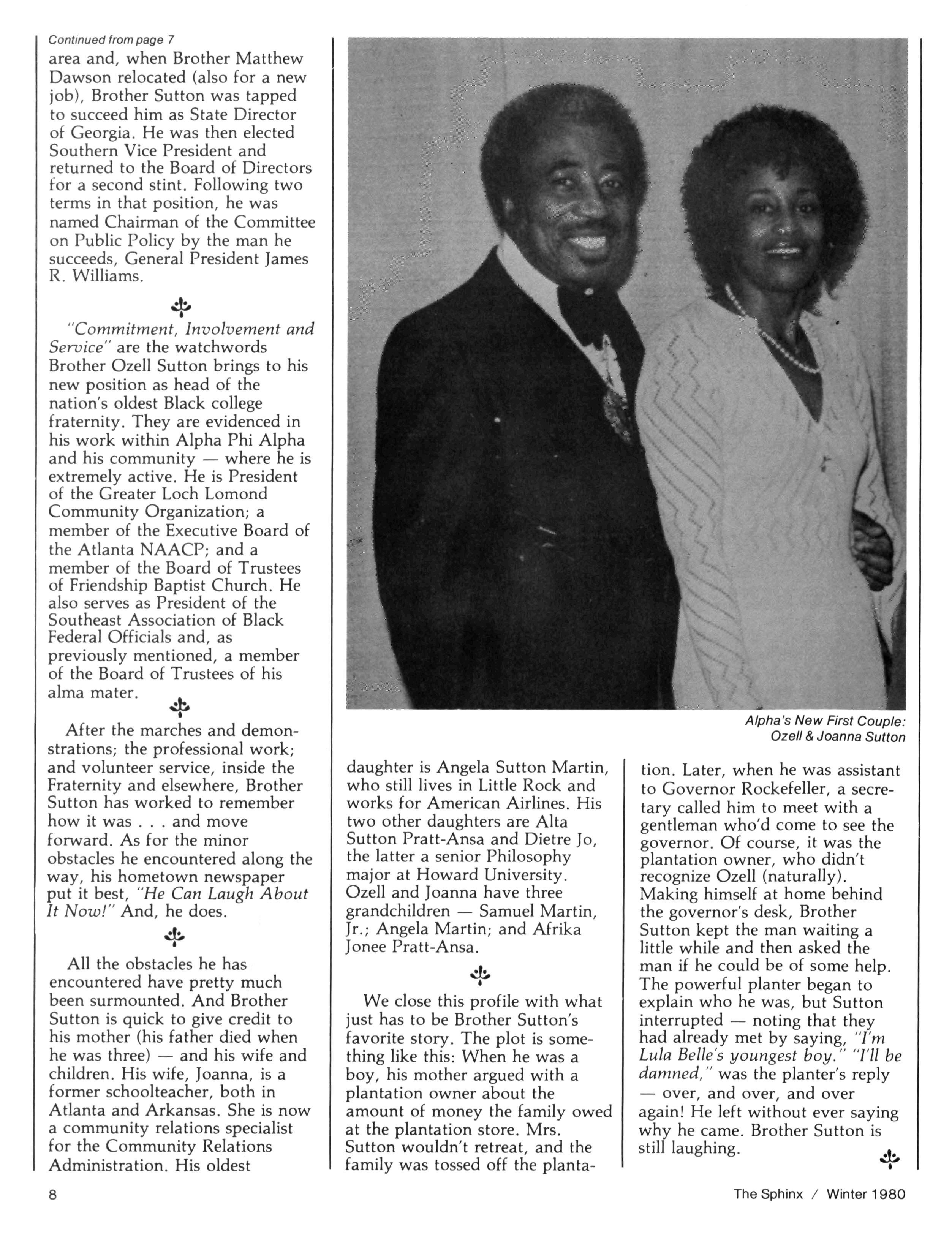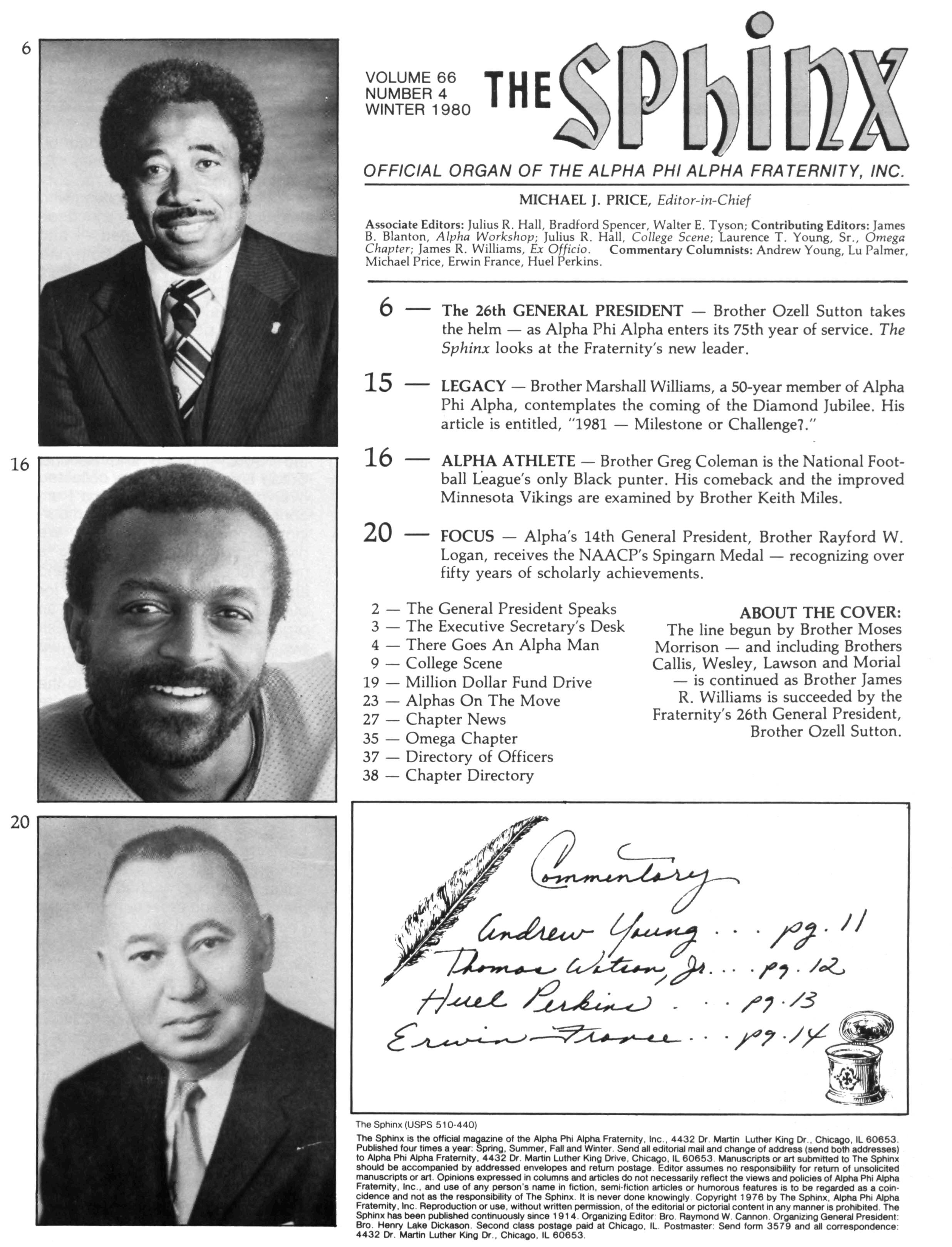 DEADLINE: The deadline for the Summer 1981 issue (the last prior to the General Convention) is MARCH 1,1981 Our cover story for this issue, naturally, is a profile of Alpha's 26th General President, Brother OZELL SUTTON. My thanks to Brother Sutton for his cooperation in preparing this feature —and Associate Editor BRADFORD SPENCER for penning a fine article 7987 — Milestone or Challenge is the title of our thought-provoking Legacy feature Brother MARSHALL WILLIAMS shares with us his insight (always brilliant) into what our 75th Anniversary should mean for individual Brothers and the Fraternity ... In Focus, we honor Brother RAYFORD W. LOGAN, the Past General President who received the 1980 Spingam Medal from the NAACP We salute that organization for chosing a truly deserving recipient We would like to thank all those who expressed their appreciation for our new Commentary section This issue contains articles by Brothers ANDREW YOUNG, HUEL PERKINS and ERWIN A FRANCE; along with a timely Viewpoint piece by Brother THOMAS S. WATSON, JR. Don't miss the exciting Alpha Athletes feature on Minnesota Vikings stalwart GREG COLEMAN. The article was submited by Brother KEITH A. MILES, son of the inimitable "Moses G." Look forward to more super articles by this talented young journalist College Scene Editor JULIUS HALL will be pleased to know that he's getting rave reviews from all corners His article in this issue should continue that trend IMPORTANT MATERIALS: This issue also includes a number of inserts for your convenience These include the Resume Form for use in the 14th Annual Alpha Job Fair and Placement Program; Undergraduate Scholarship applications; and nomination forms for the 1981 edition of Distinguished Collegians. P.S Feel free to make copies of these forms if you don't want to tear a page out of the journal.. Until next issue MJP