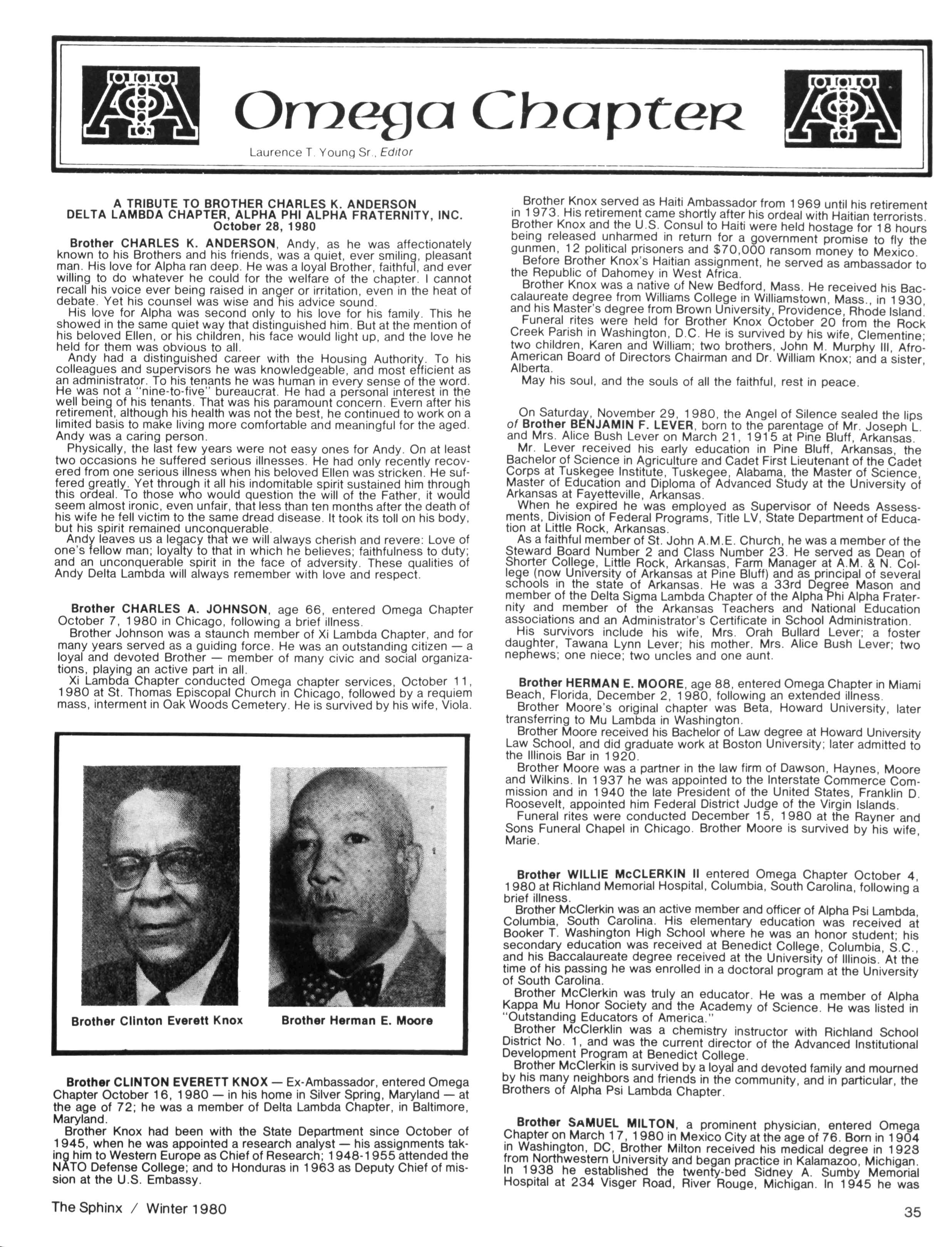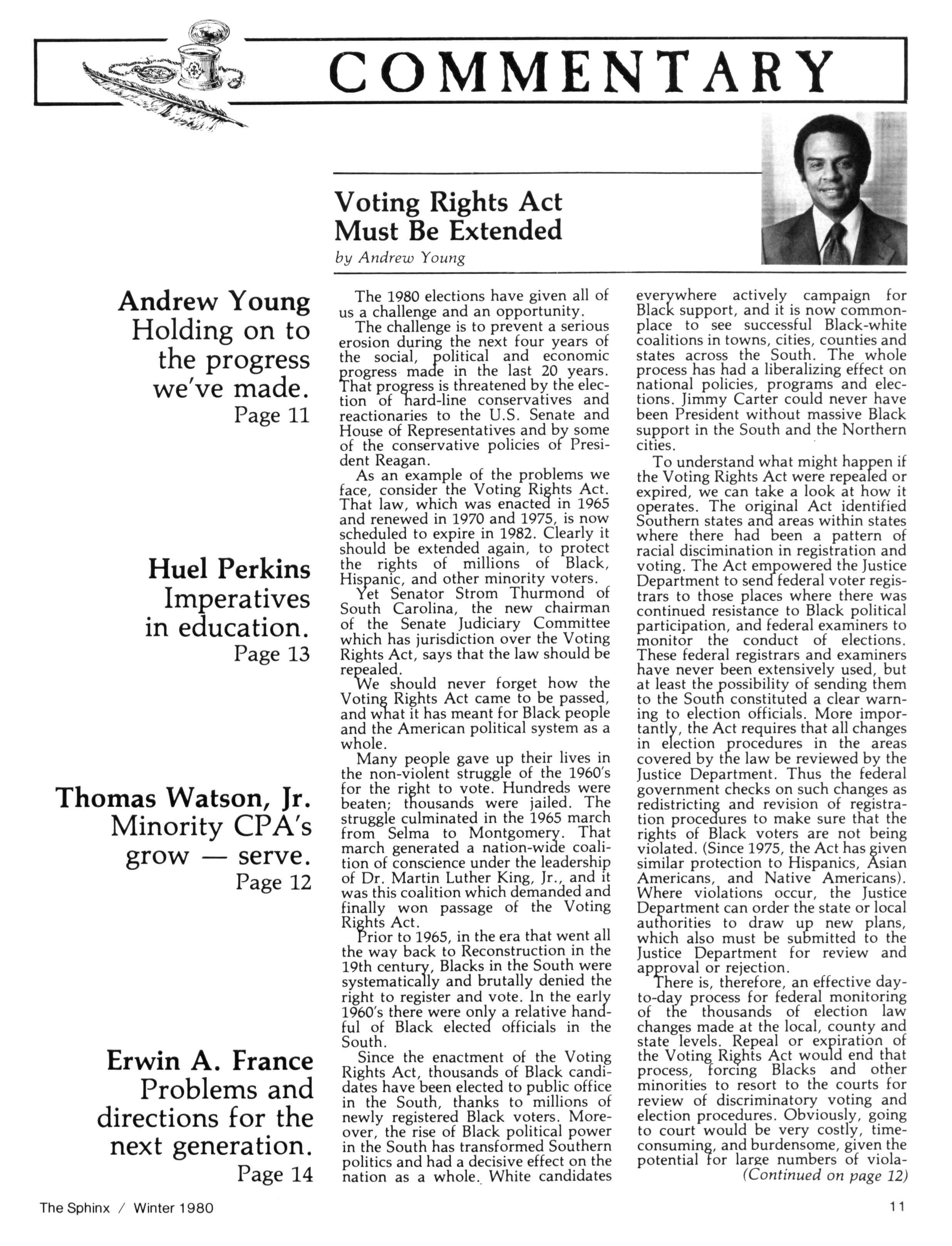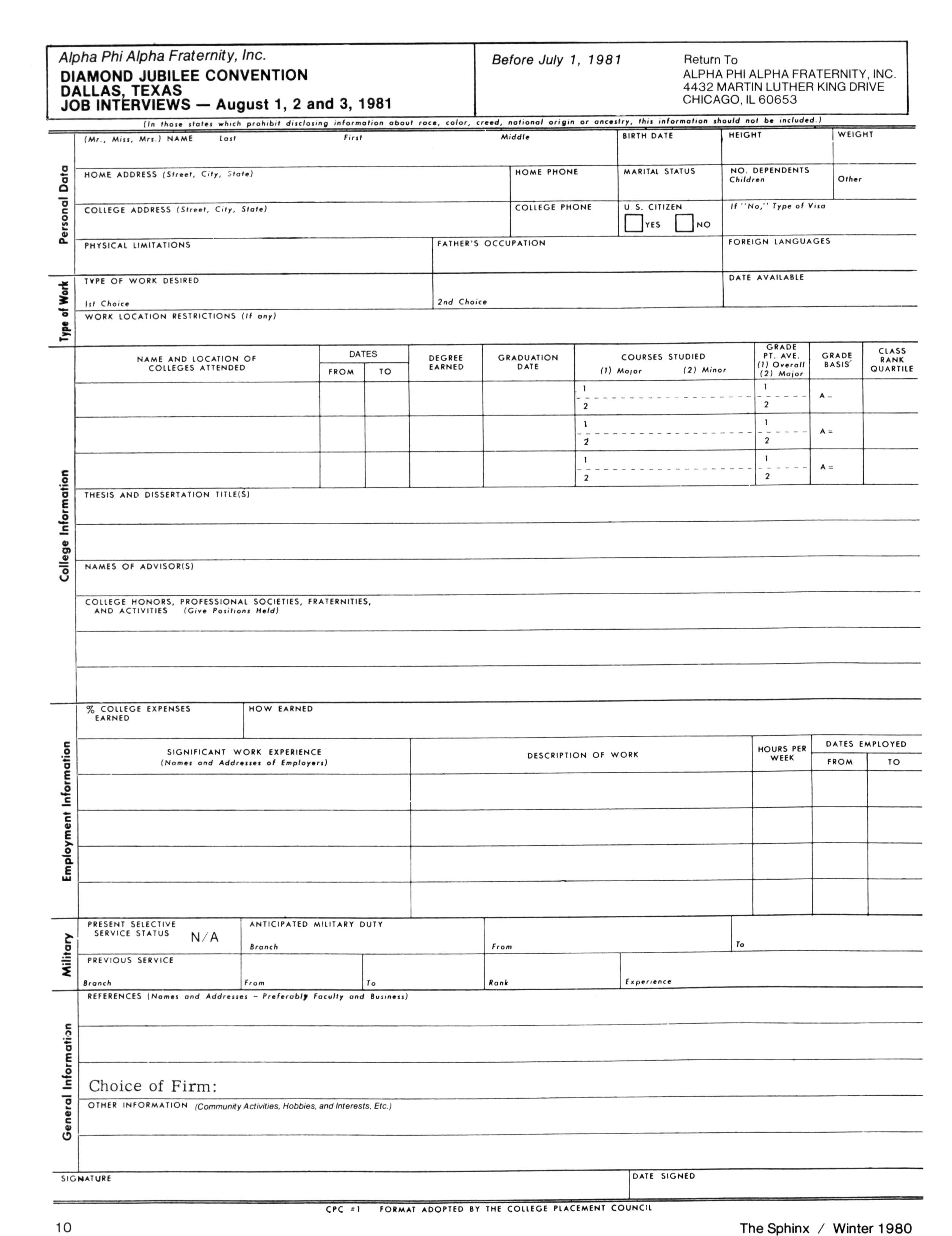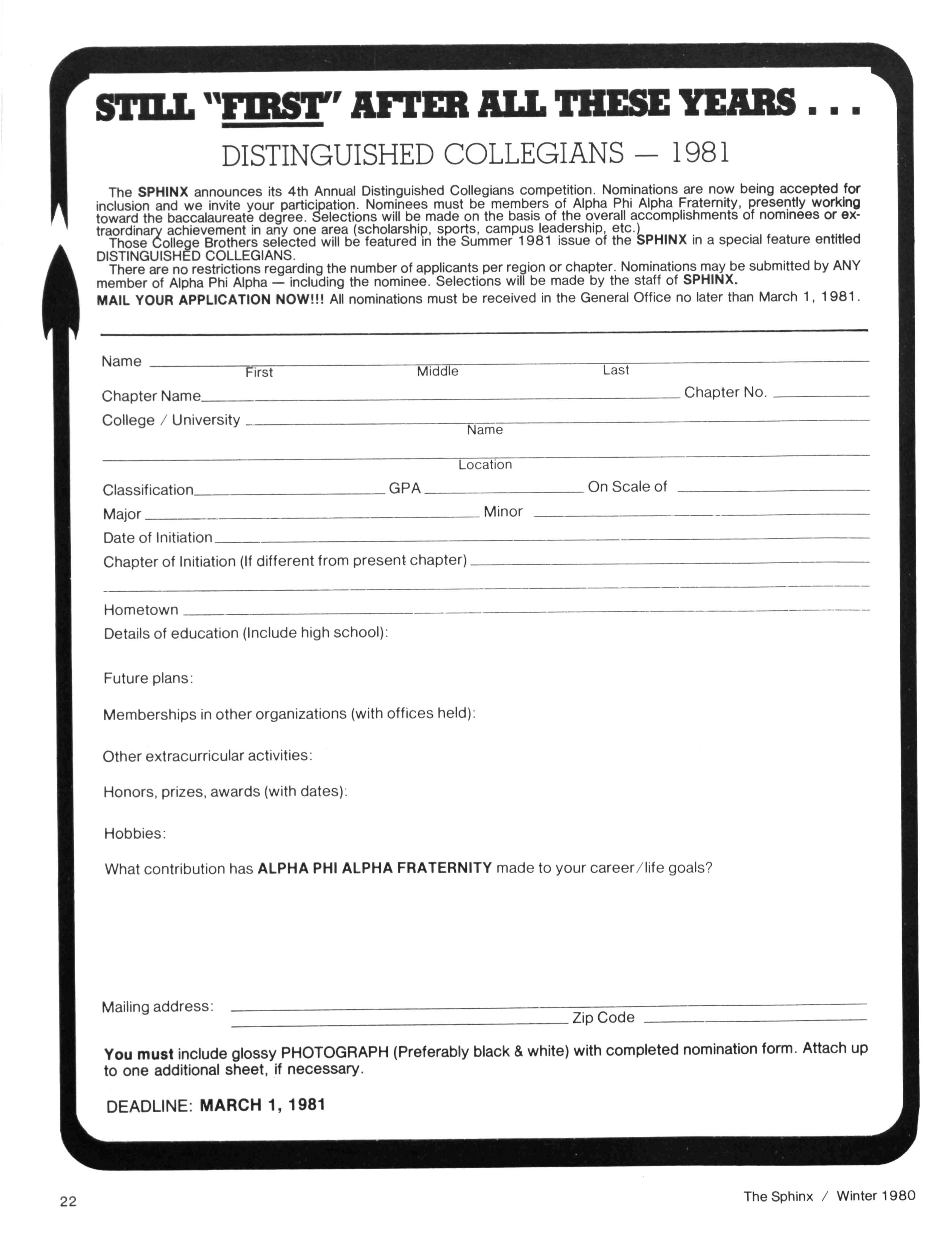DEADLINE: The deadline for the Summer 1981 issue (the last prior to the General Convention) is MARCH 1,1981 Our cover story for this issue, naturally, is a profile of Alpha's 26th General President, Brother OZELL SUTTON. My thanks to Brother Sutton for his cooperation in preparing this feature —and Associate Editor BRADFORD SPENCER for penning a fine article 7987 — Milestone or Challenge is the title of our thought-provoking Legacy feature Brother MARSHALL WILLIAMS shares with us his insight (always brilliant) into what our 75th Anniversary should mean for individual Brothers and the Fraternity ... In Focus, we honor Brother RAYFORD W. LOGAN, the Past General President who received the 1980 Spingam Medal from the NAACP We salute that organization for chosing a truly deserving recipient We would like to thank all those who expressed their appreciation for our new Commentary section This issue contains articles by Brothers ANDREW YOUNG, HUEL PERKINS and ERWIN A FRANCE; along with a timely Viewpoint piece by Brother THOMAS S. WATSON, JR. Don't miss the exciting Alpha Athletes feature on Minnesota Vikings stalwart GREG COLEMAN. The article was submited by Brother KEITH A. MILES, son of the inimitable "Moses G." Look forward to more super articles by this talented young journalist College Scene Editor JULIUS HALL will be pleased to know that he's getting rave reviews from all corners His article in this issue should continue that trend IMPORTANT MATERIALS: This issue also includes a number of inserts for your convenience These include the Resume Form for use in the 14th Annual Alpha Job Fair and Placement Program; Undergraduate Scholarship applications; and nomination forms for the 1981 edition of Distinguished Collegians. P.S Feel free to make copies of these forms if you don't want to tear a page out of the journal.. Until next issue MJP