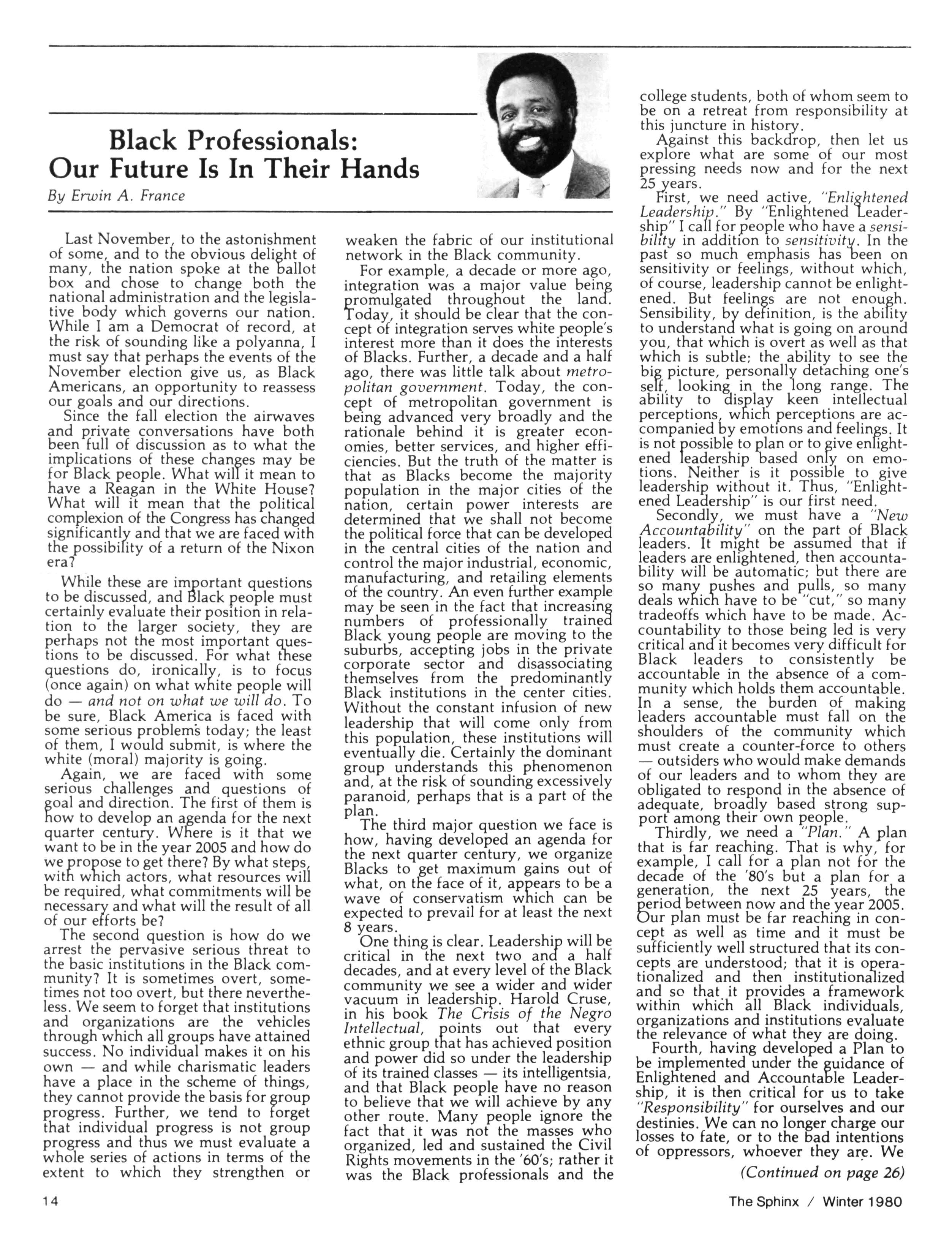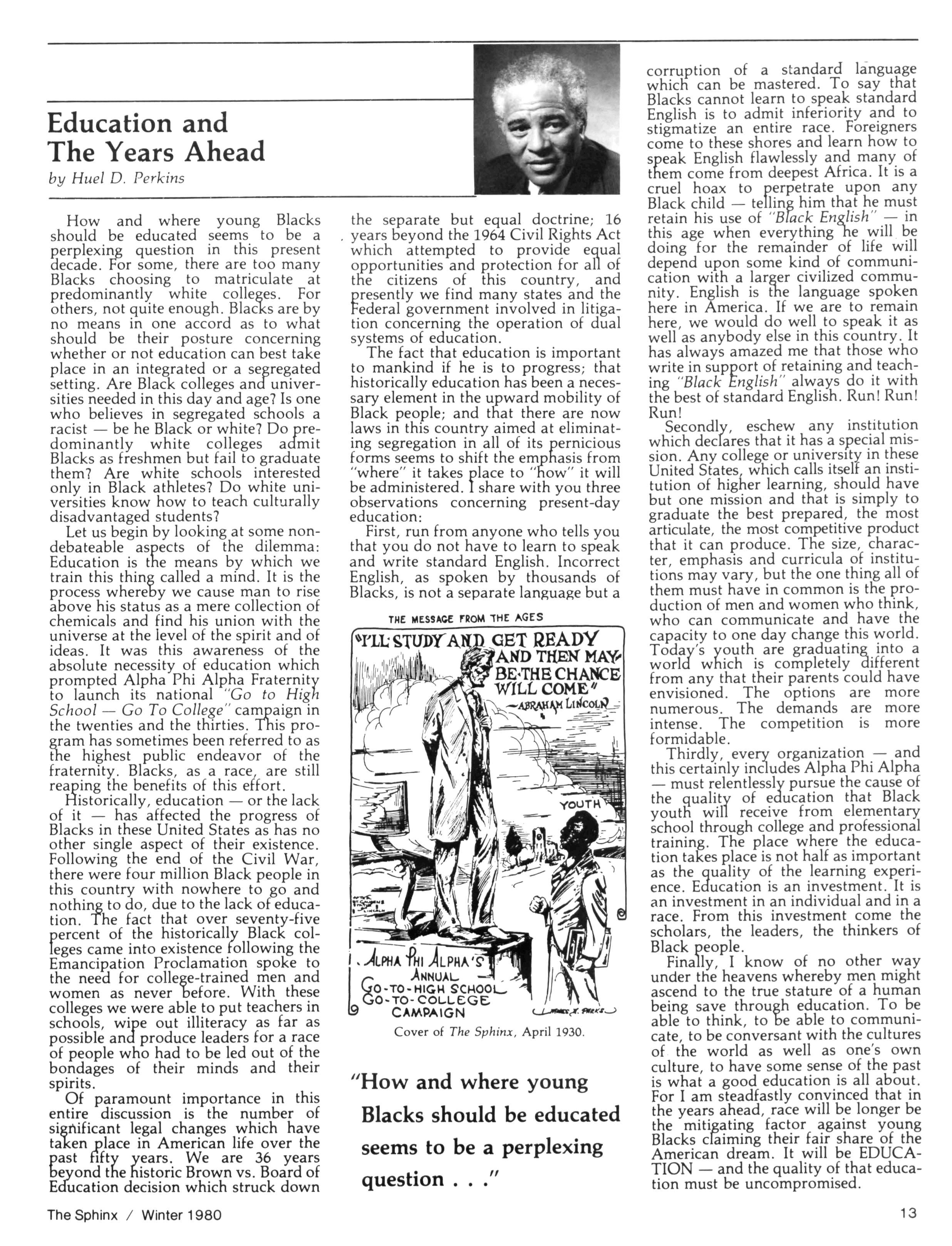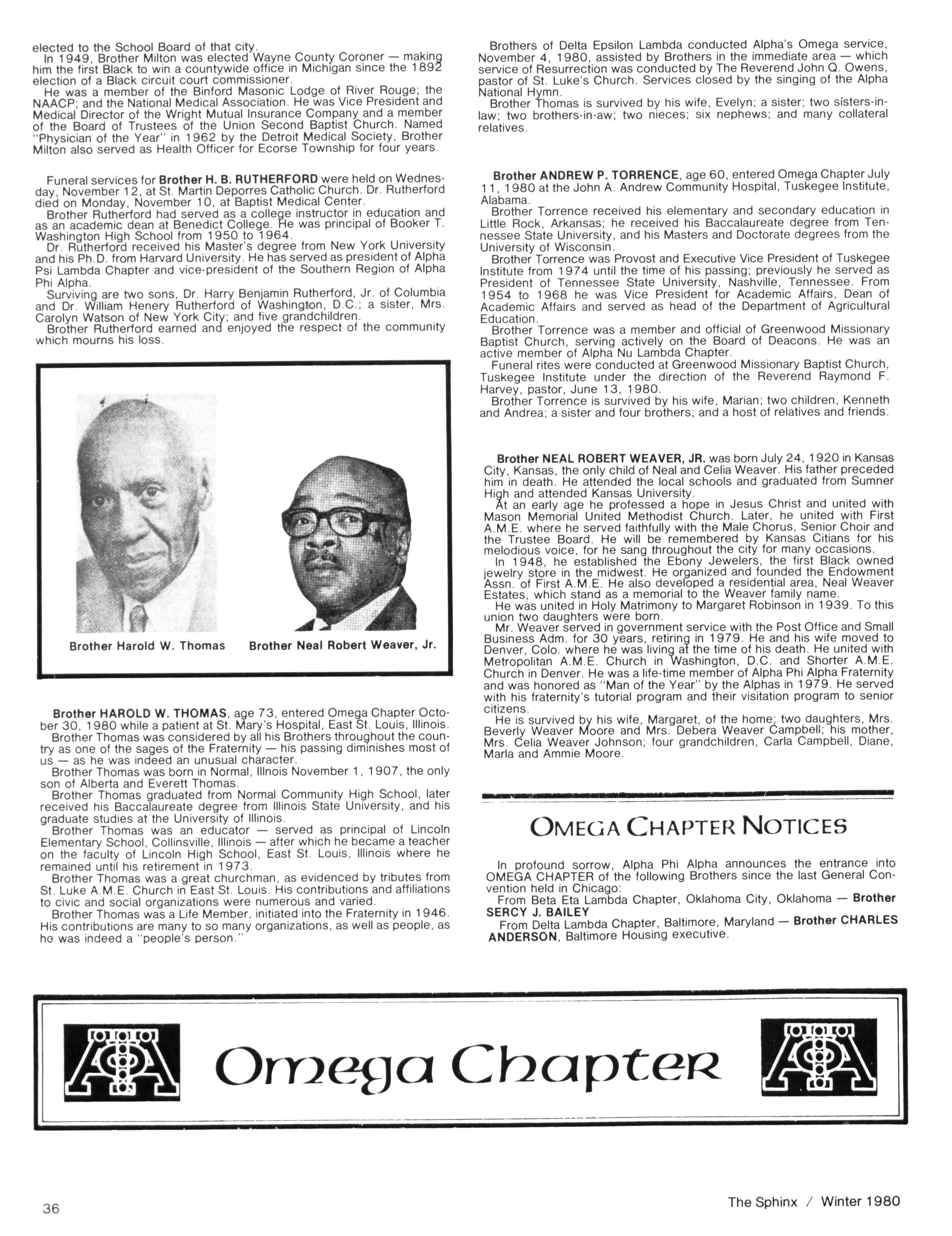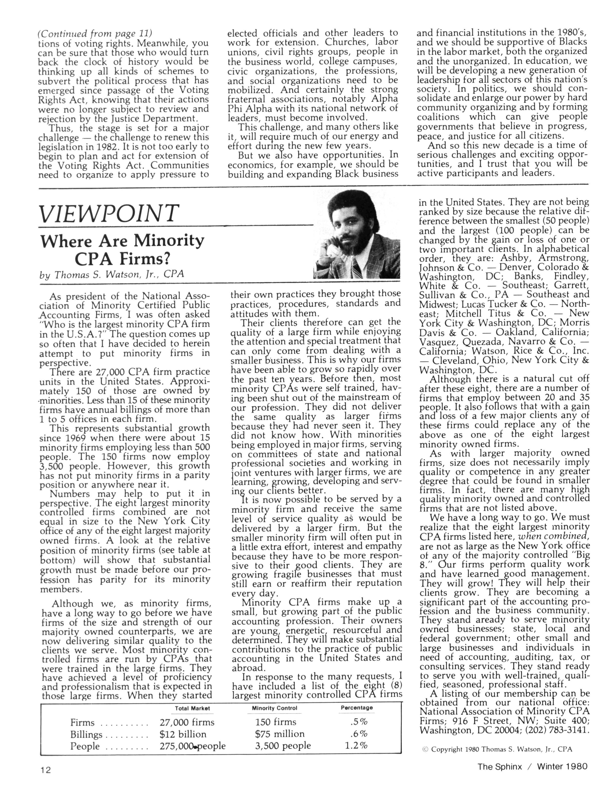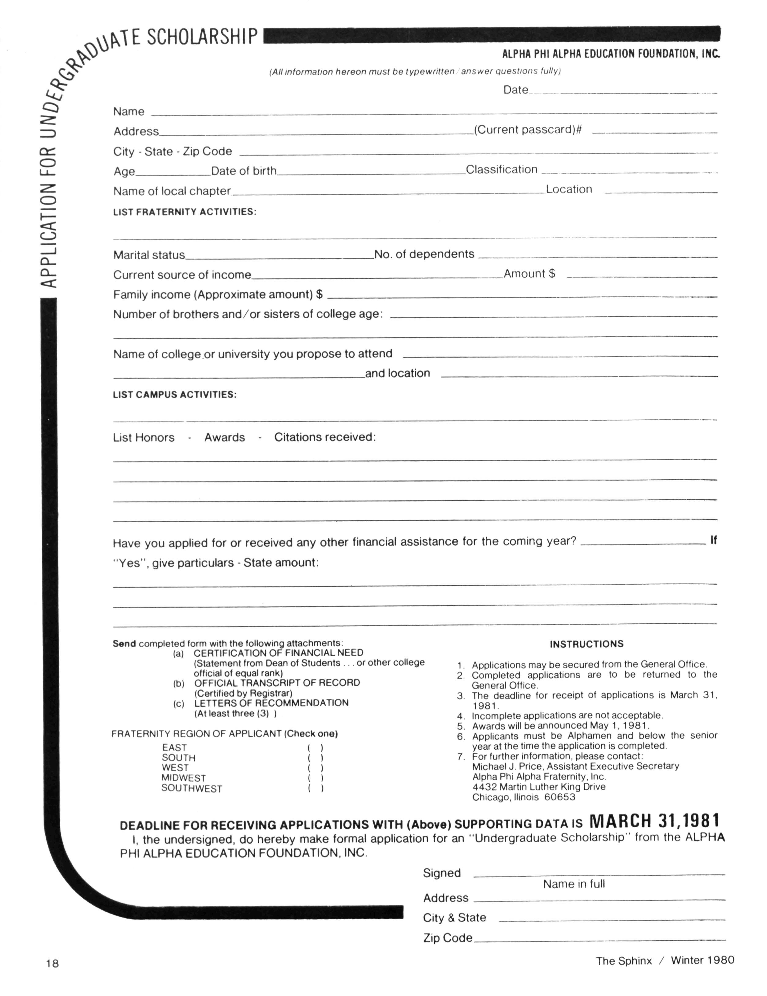DEADLINE: The deadline for the Summer 1981 issue (the last prior to the General Convention) is MARCH 1,1981 Our cover story for this issue, naturally, is a profile of Alpha's 26th General President, Brother OZELL SUTTON. My thanks to Brother Sutton for his cooperation in preparing this feature —and Associate Editor BRADFORD SPENCER for penning a fine article 7987 — Milestone or Challenge is the title of our thought-provoking Legacy feature Brother MARSHALL WILLIAMS shares with us his insight (always brilliant) into what our 75th Anniversary should mean for individual Brothers and the Fraternity ... In Focus, we honor Brother RAYFORD W. LOGAN, the Past General President who received the 1980 Spingam Medal from the NAACP We salute that organization for chosing a truly deserving recipient We would like to thank all those who expressed their appreciation for our new Commentary section This issue contains articles by Brothers ANDREW YOUNG, HUEL PERKINS and ERWIN A FRANCE; along with a timely Viewpoint piece by Brother THOMAS S. WATSON, JR. Don't miss the exciting Alpha Athletes feature on Minnesota Vikings stalwart GREG COLEMAN. The article was submited by Brother KEITH A. MILES, son of the inimitable "Moses G." Look forward to more super articles by this talented young journalist College Scene Editor JULIUS HALL will be pleased to know that he's getting rave reviews from all corners His article in this issue should continue that trend IMPORTANT MATERIALS: This issue also includes a number of inserts for your convenience These include the Resume Form for use in the 14th Annual Alpha Job Fair and Placement Program; Undergraduate Scholarship applications; and nomination forms for the 1981 edition of Distinguished Collegians. P.S Feel free to make copies of these forms if you don't want to tear a page out of the journal.. Until next issue MJP