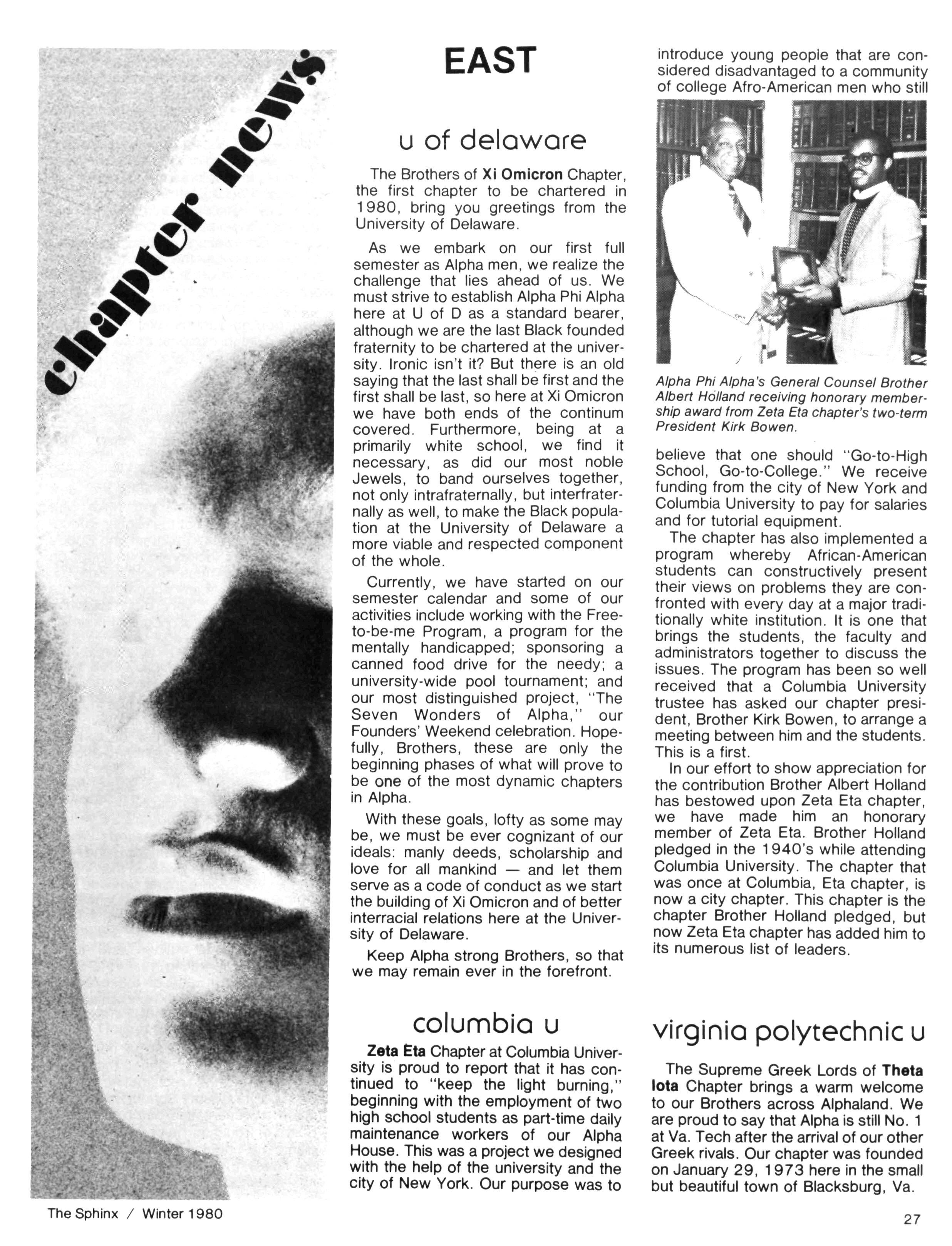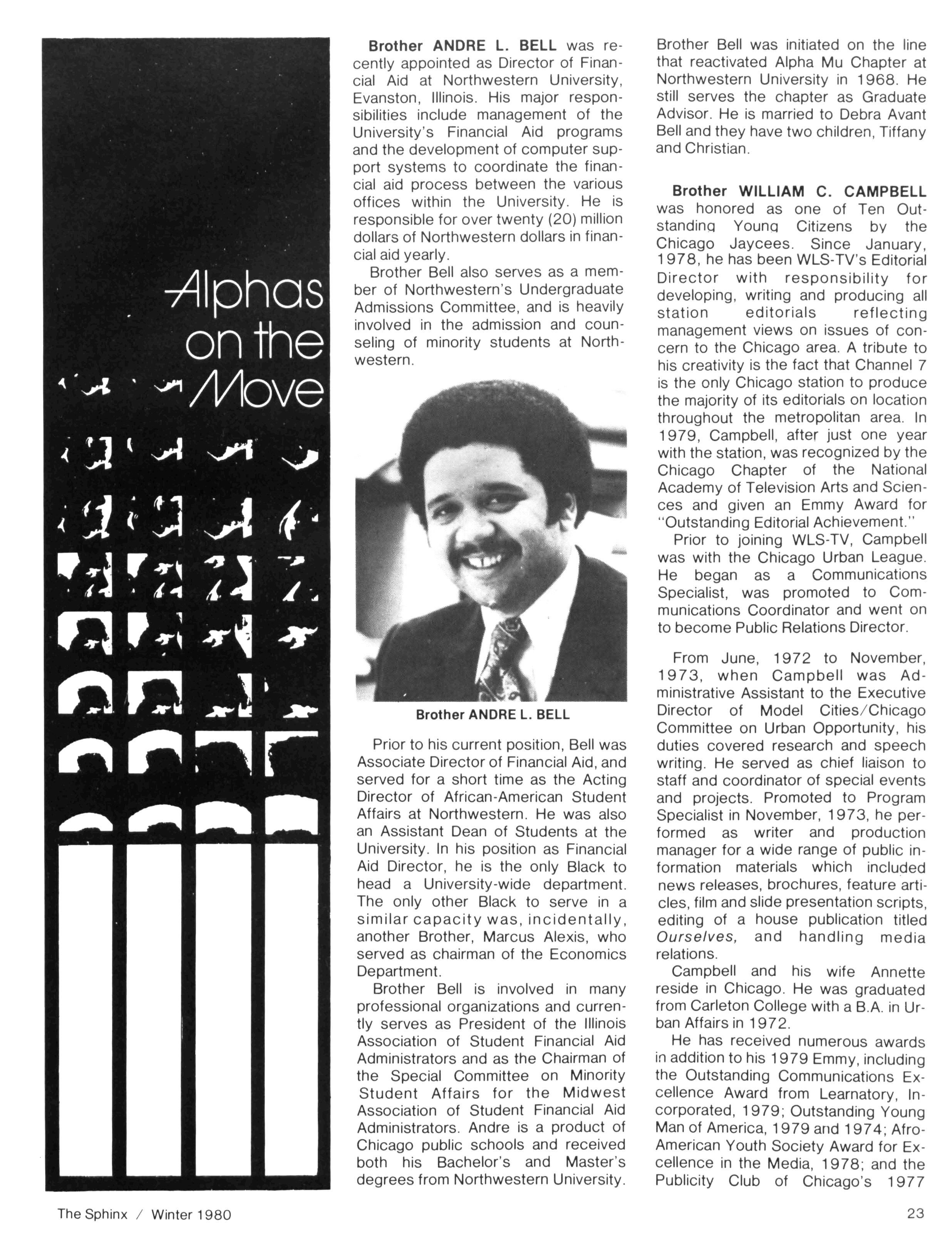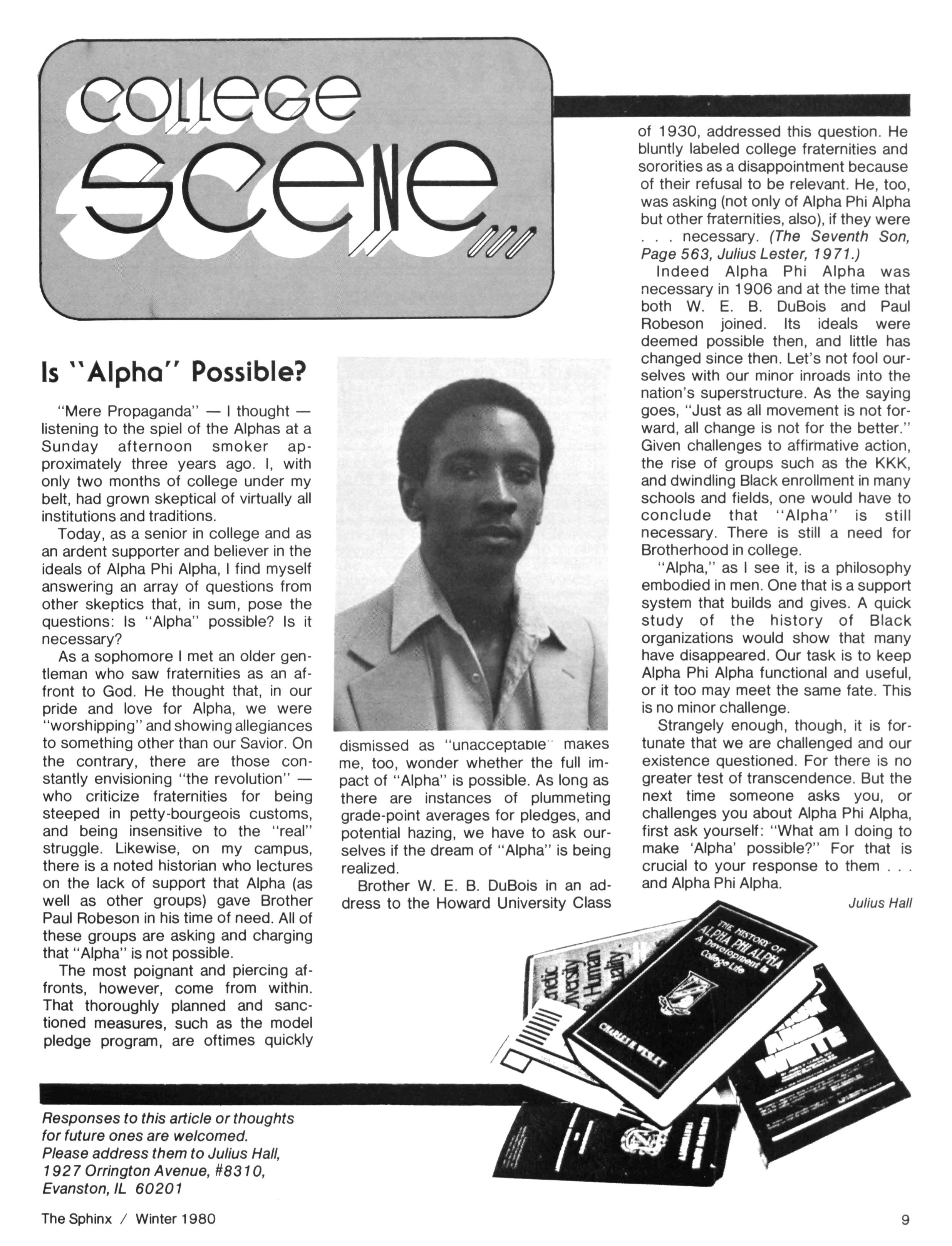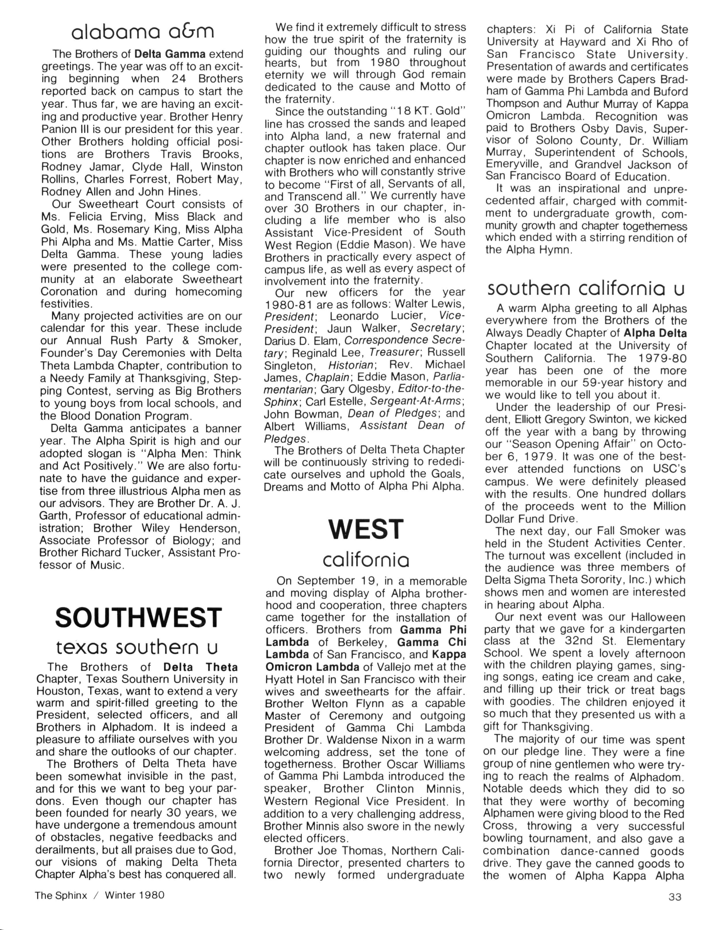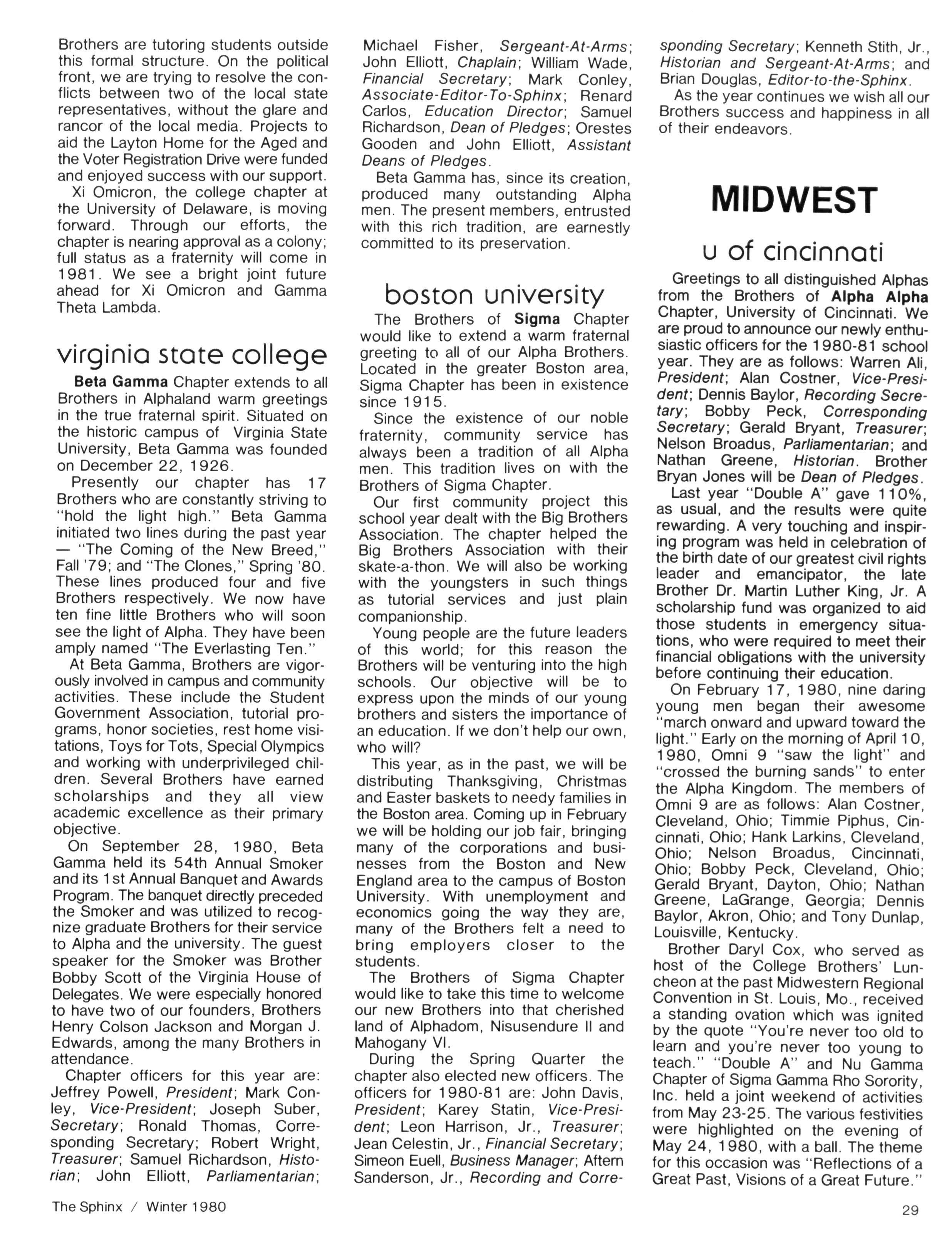 Greetings THE VOICE OF THE BROTHERS: Brother KENNETH ROBINSON, President of Kappa Chi Lambda Chapter, wrote to voice his concern about the lateness of the journal (in particular, the Summer 1980 issue) Brother Robinson was especially concerned about promotional information on the General Convention — which was included, although the convention was over when most Brothers received their copies First, let me point out that the only convention information included was the "back cover" — identical to the one which had been run on the three previous issues during the year Consequently, no information was missed by the Brothers because of late publication However, the larger question looms — and it is avalid concern We have discussed the need for maintaining a relatively flexible schedule at the past several General Conventions, both in the Publications Committee and in my report to the Brotherhood Inseveral instances, we have decided to delay publication in order to include certain materials This is an option which must remain, because The Sphinx is unparalleled as a source of communication with the Brothers But, we are committed to remaining within the seasonal publication periods authorized by the General Convention I think that you can see the progress made in this direction since the close of the convention! Another matter of concern came to my attention "through the grapevine." In this instance, a College Brother, when asked what he'd like to see added to The Sphinx, replied that he thought more attention should be given to the accomplishments of College Brothers — especially in regular features like Alphas On The Move and There Goes An Alpha Man. If only he knew how much Ishared his opinion! Ihave pointed out on a number of occasions that the academic, extra-curricular and athletic attainments of Alpha Men in undergraduate school are comparable to the professional accomplishments of our alumni The difference in coverage is a direct result of the fact that Alumni Brothers submit news — while, inexplicably, College Brothers have yet to do so to any significant degree I became so frustrated with this problem that, several years ago, I instituted the Distinguished Collegians feature in order to give greater publicity to the outstanding work being done by our College Brothers I look forward to the day when this special feature will be unnecessary — because each issue will carry a large number of articles on College Brothers, like the one featuring Brother ARTHUR HOUSTON in this edition of Alphas On The Move. The section is open to all news, if you send it in — we'll print it!