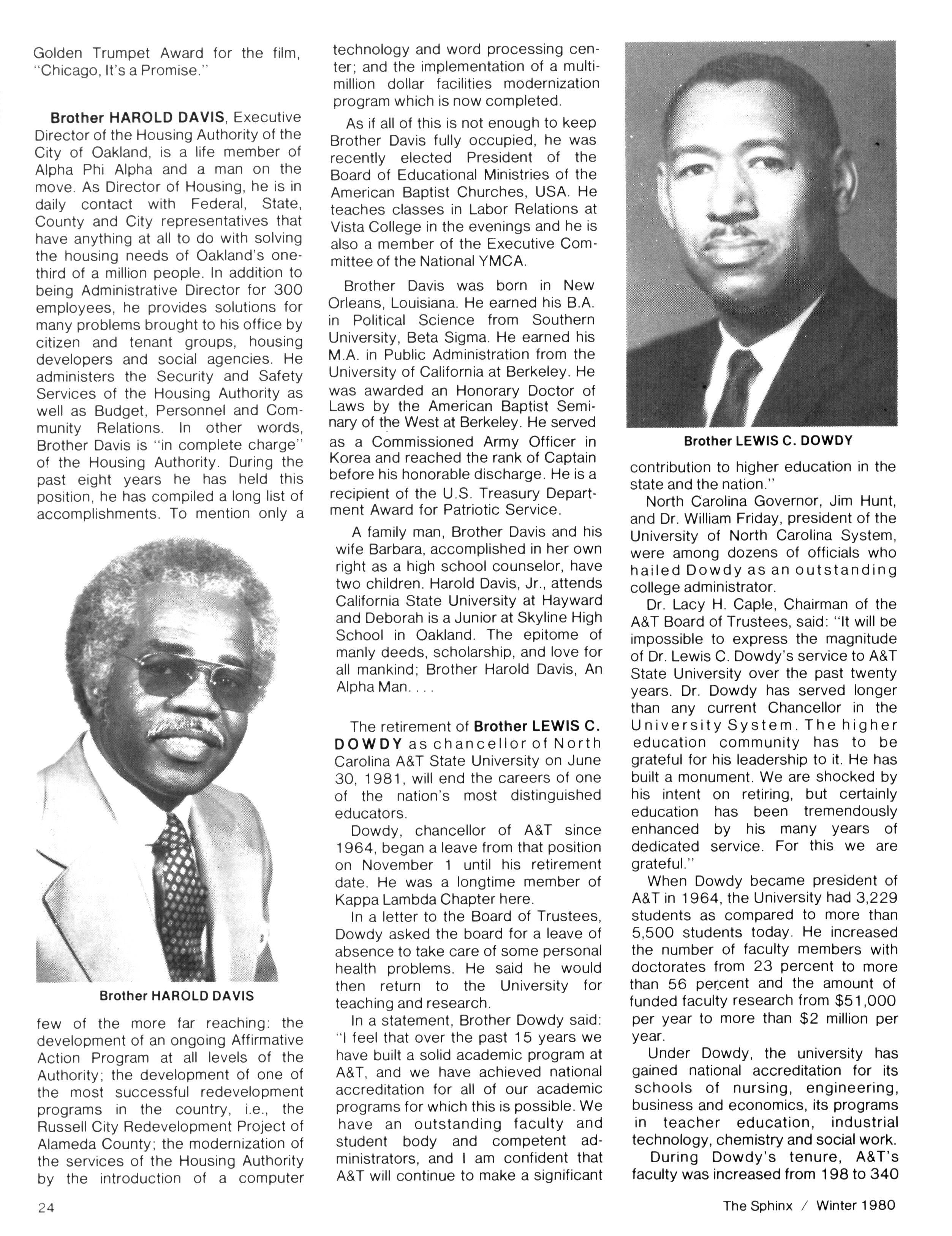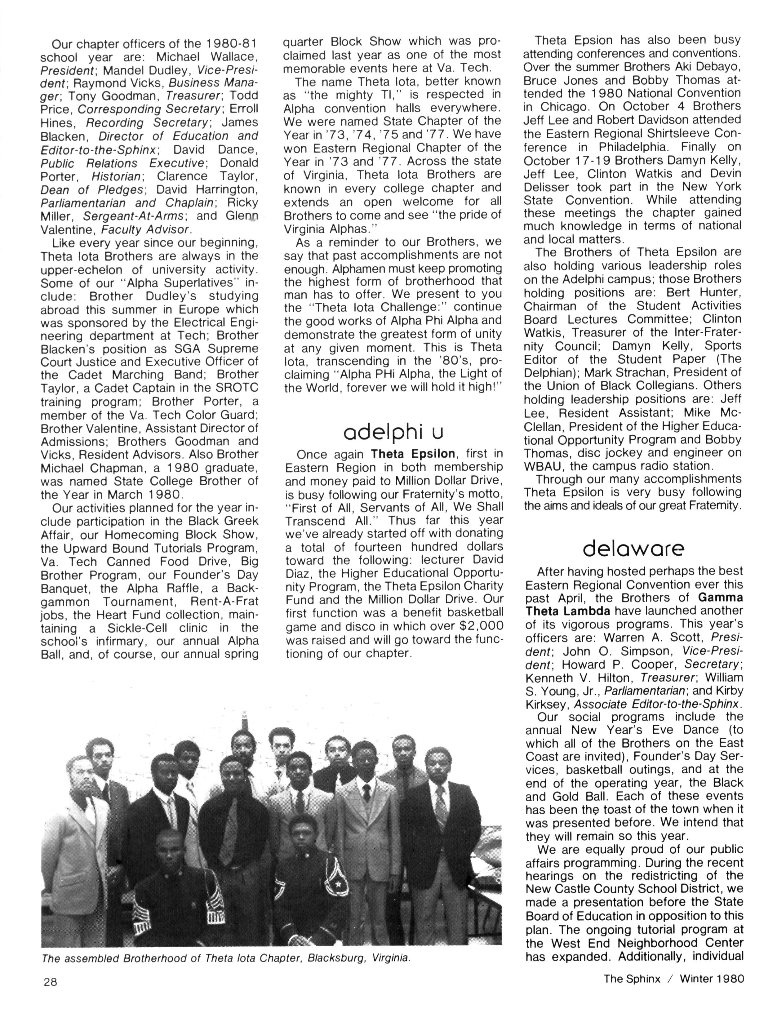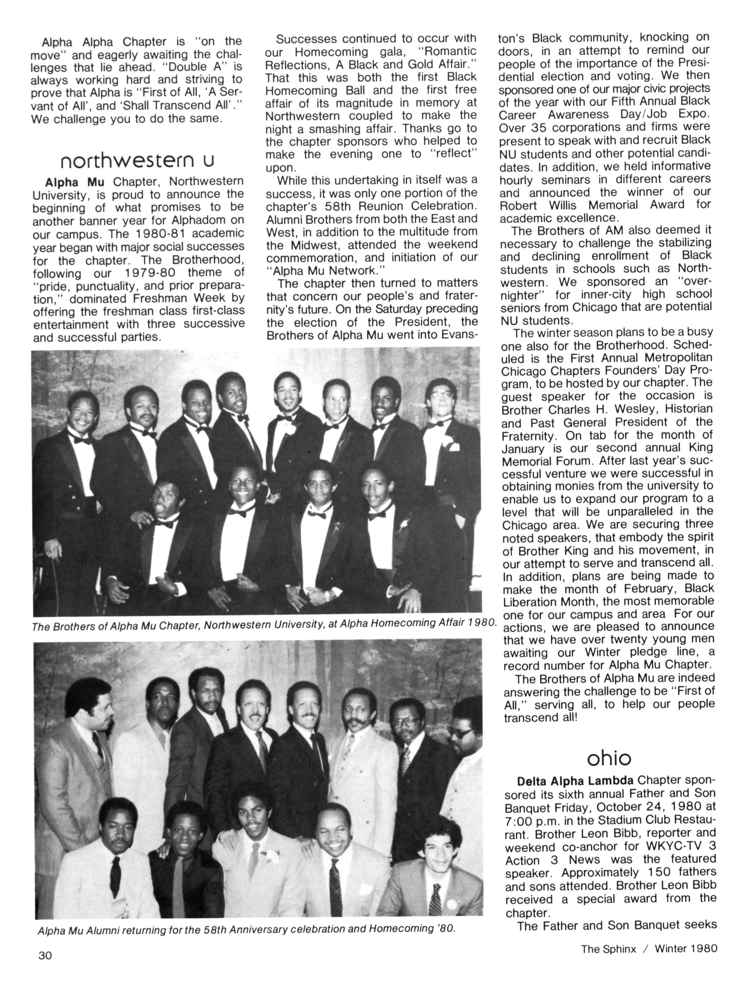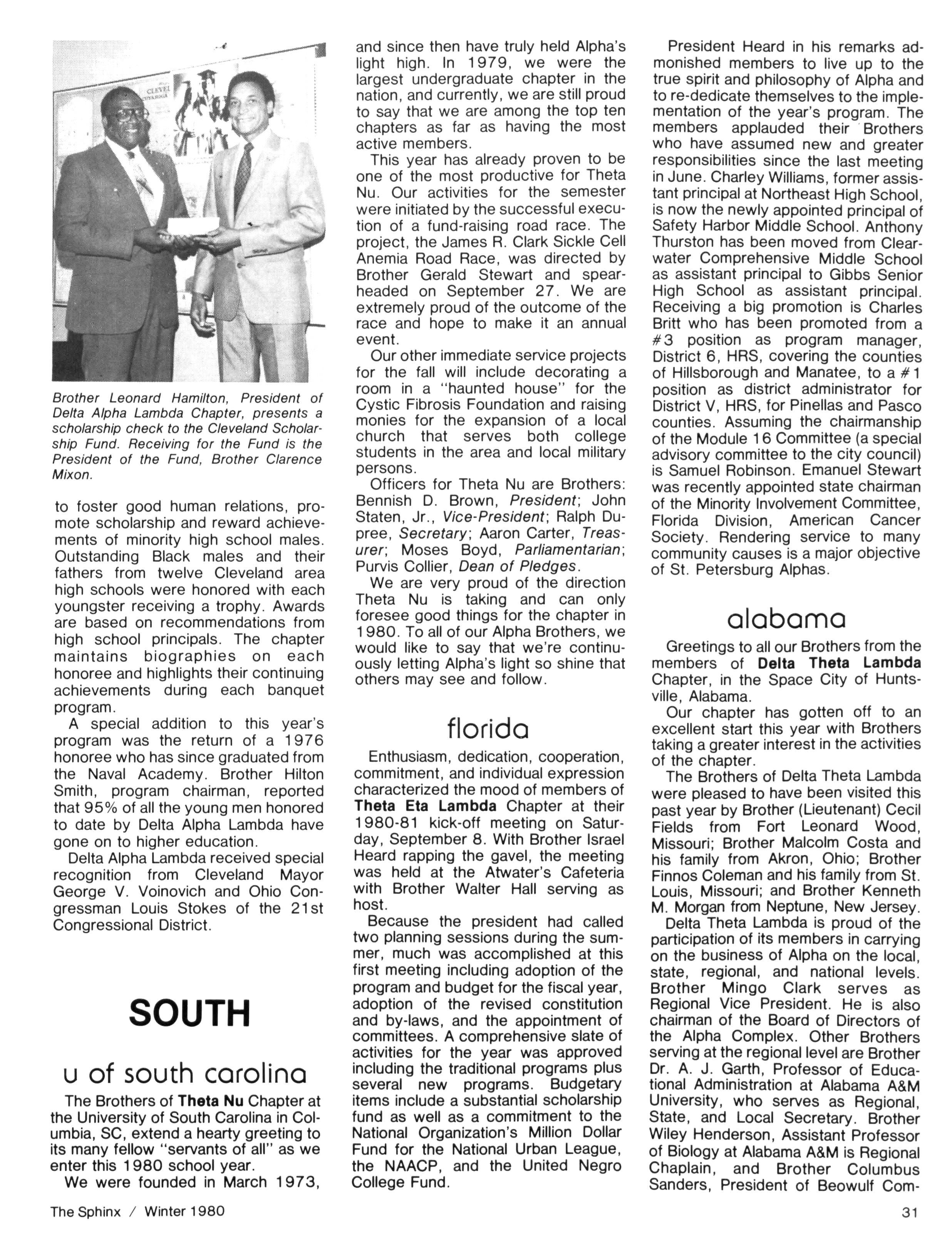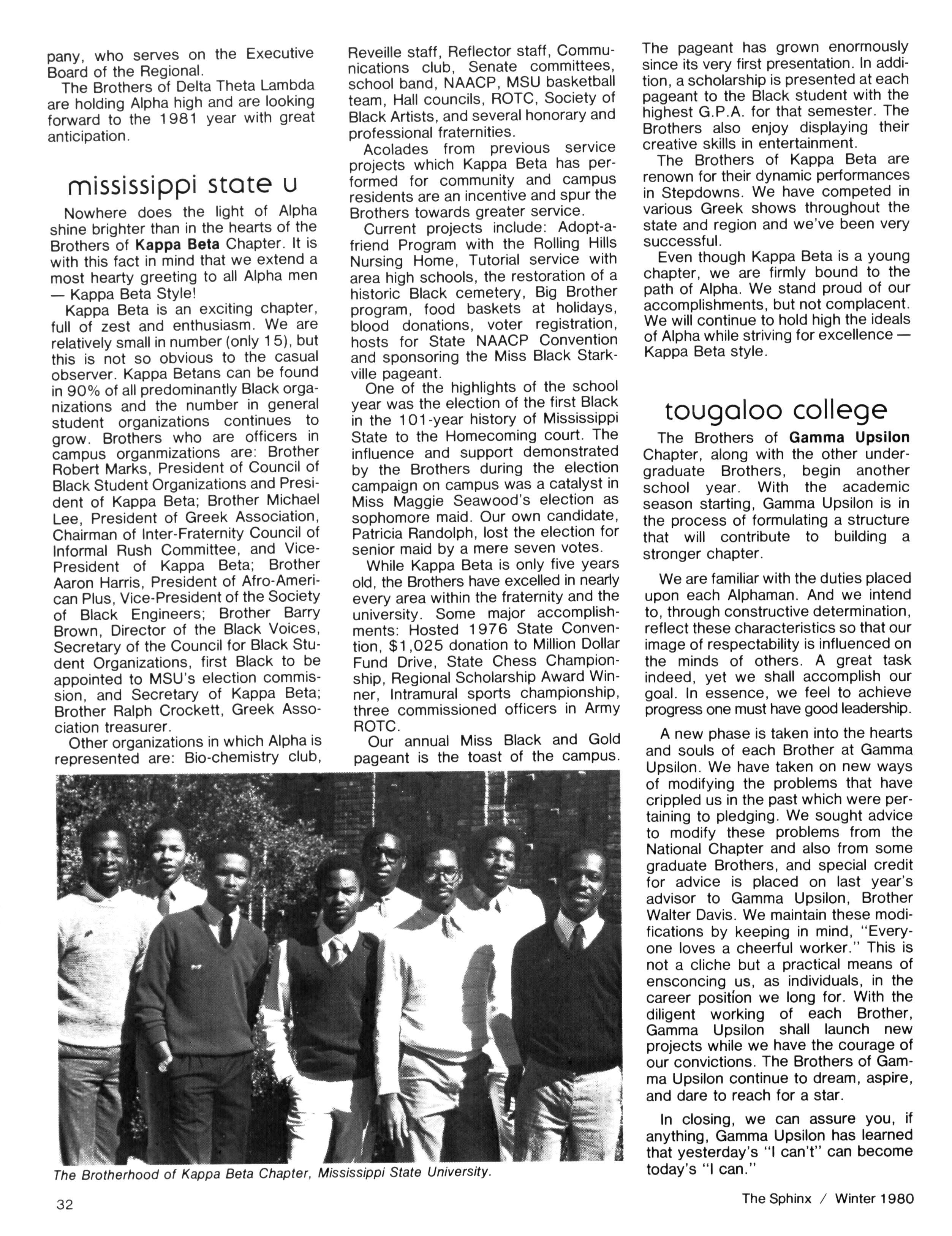 Greetings THE VOICE OF THE BROTHERS: Brother KENNETH ROBINSON, President of Kappa Chi Lambda Chapter, wrote to voice his concern about the lateness of the journal (in particular, the Summer 1980 issue) Brother Robinson was especially concerned about promotional information on the General Convention — which was included, although the convention was over when most Brothers received their copies First, let me point out that the only convention information included was the "back cover" — identical to the one which had been run on the three previous issues during the year Consequently, no information was missed by the Brothers because of late publication However, the larger question looms — and it is avalid concern We have discussed the need for maintaining a relatively flexible schedule at the past several General Conventions, both in the Publications Committee and in my report to the Brotherhood Inseveral instances, we have decided to delay publication in order to include certain materials This is an option which must remain, because The Sphinx is unparalleled as a source of communication with the Brothers But, we are committed to remaining within the seasonal publication periods authorized by the General Convention I think that you can see the progress made in this direction since the close of the convention! Another matter of concern came to my attention "through the grapevine." In this instance, a College Brother, when asked what he'd like to see added to The Sphinx, replied that he thought more attention should be given to the accomplishments of College Brothers — especially in regular features like Alphas On The Move and There Goes An Alpha Man. If only he knew how much Ishared his opinion! Ihave pointed out on a number of occasions that the academic, extra-curricular and athletic attainments of Alpha Men in undergraduate school are comparable to the professional accomplishments of our alumni The difference in coverage is a direct result of the fact that Alumni Brothers submit news — while, inexplicably, College Brothers have yet to do so to any significant degree I became so frustrated with this problem that, several years ago, I instituted the Distinguished Collegians feature in order to give greater publicity to the outstanding work being done by our College Brothers I look forward to the day when this special feature will be unnecessary — because each issue will carry a large number of articles on College Brothers, like the one featuring Brother ARTHUR HOUSTON in this edition of Alphas On The Move. The section is open to all news, if you send it in — we'll print it!