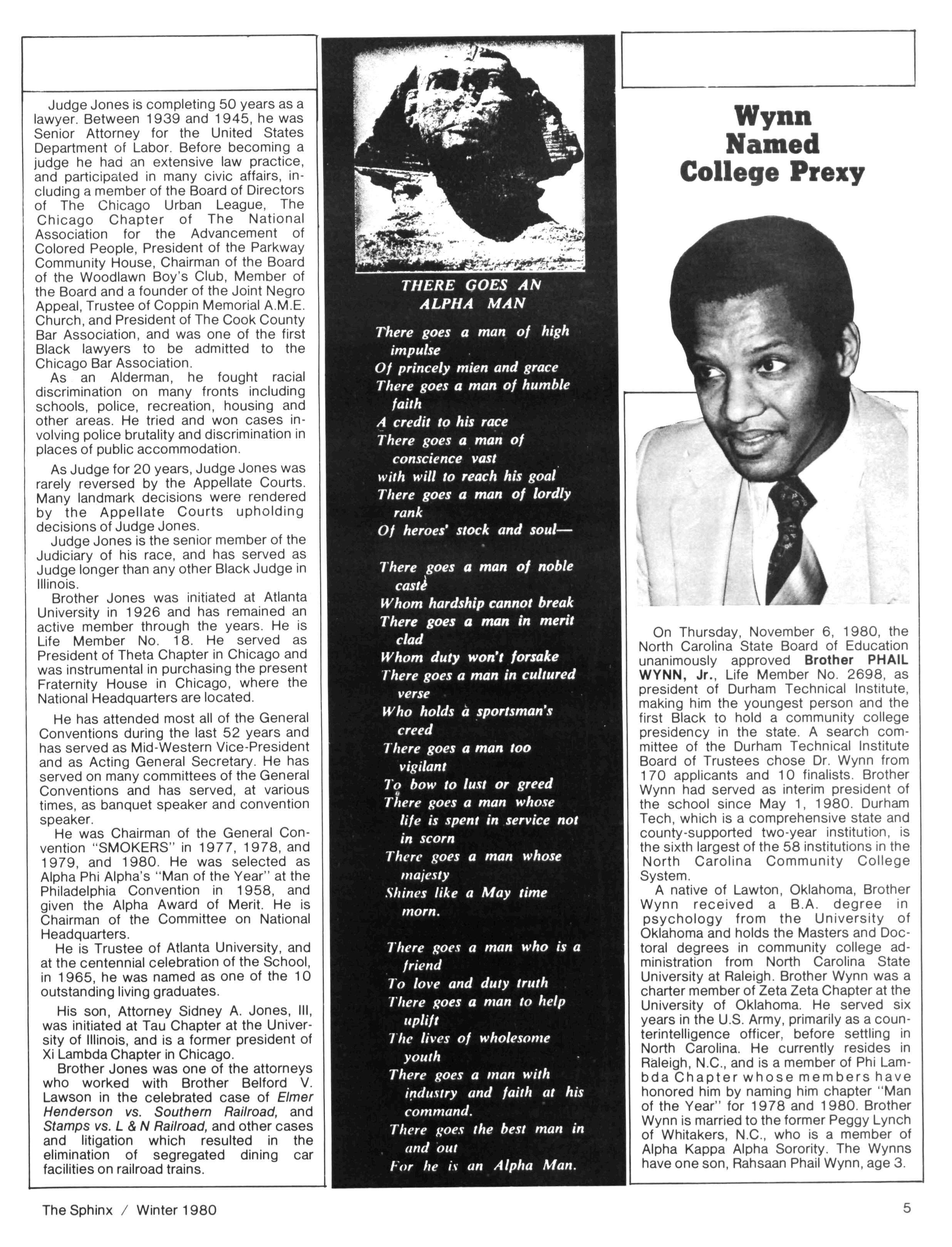 A native of Lawton, Oklahoma, Brother Wynn received a B.A degree in psychology from the University of Oklahoma and holds the Masters and Doctoral degrees in community college administration from North Carolina State University at Raleigh. Brother Wynn was a charter member of Zeta Zeta Chapter at the University of Oklahoma He served six years in the U.S Army, primarily as a counterintelligence officer, before settling in North Carolina He currently resides in Raleigh, N.C., and is a member of Phi Lambda Chapter whose members have honored him by naming him chapter "Man of the Year" for 1978 and 1980 Brother Wynn is married to the former Peggy Lynch of Whitakers, N.C., who is a member of Alpha Kappa Alpha Sorority The Wynns have one son, Rahsaan Phail Wynn,age 3
