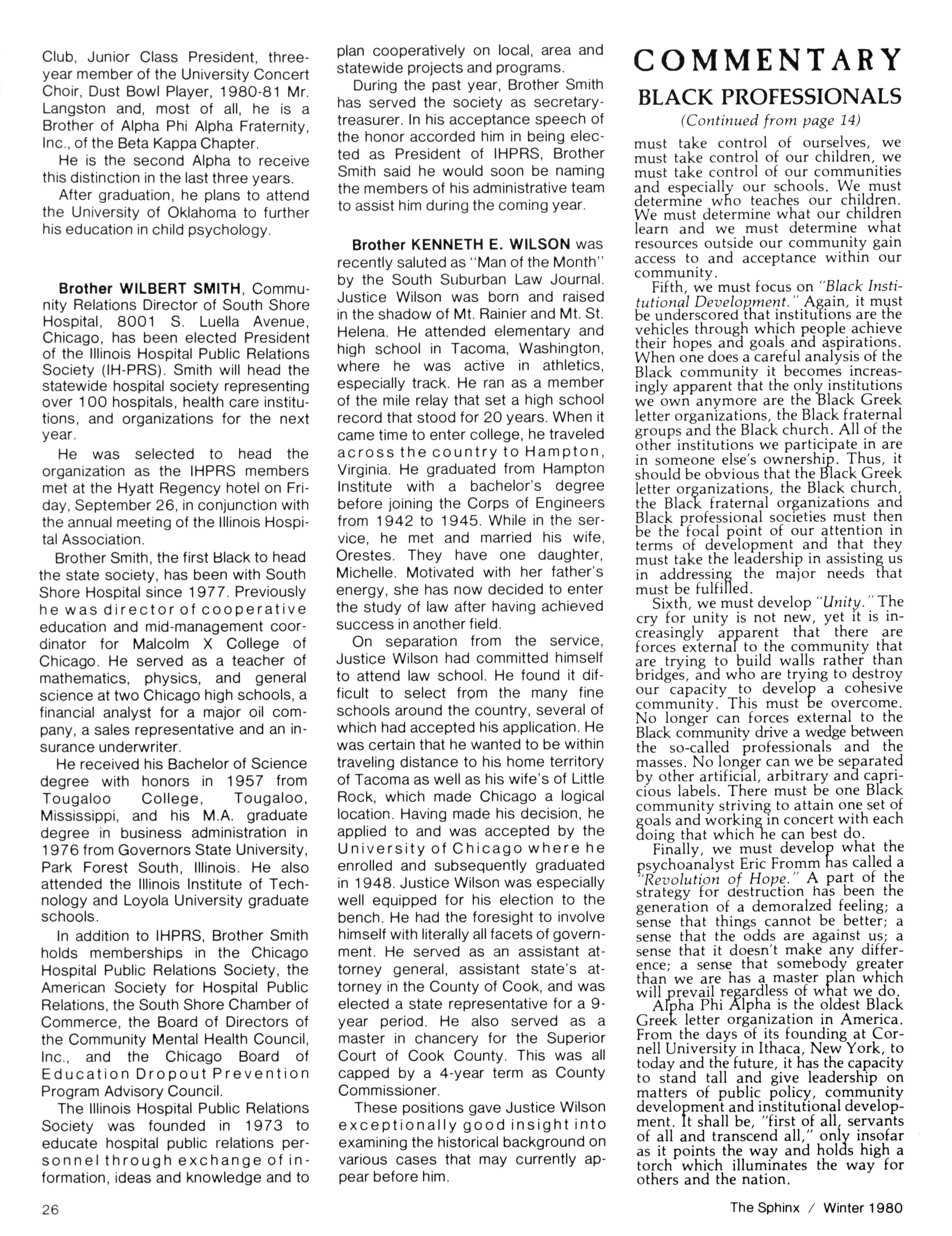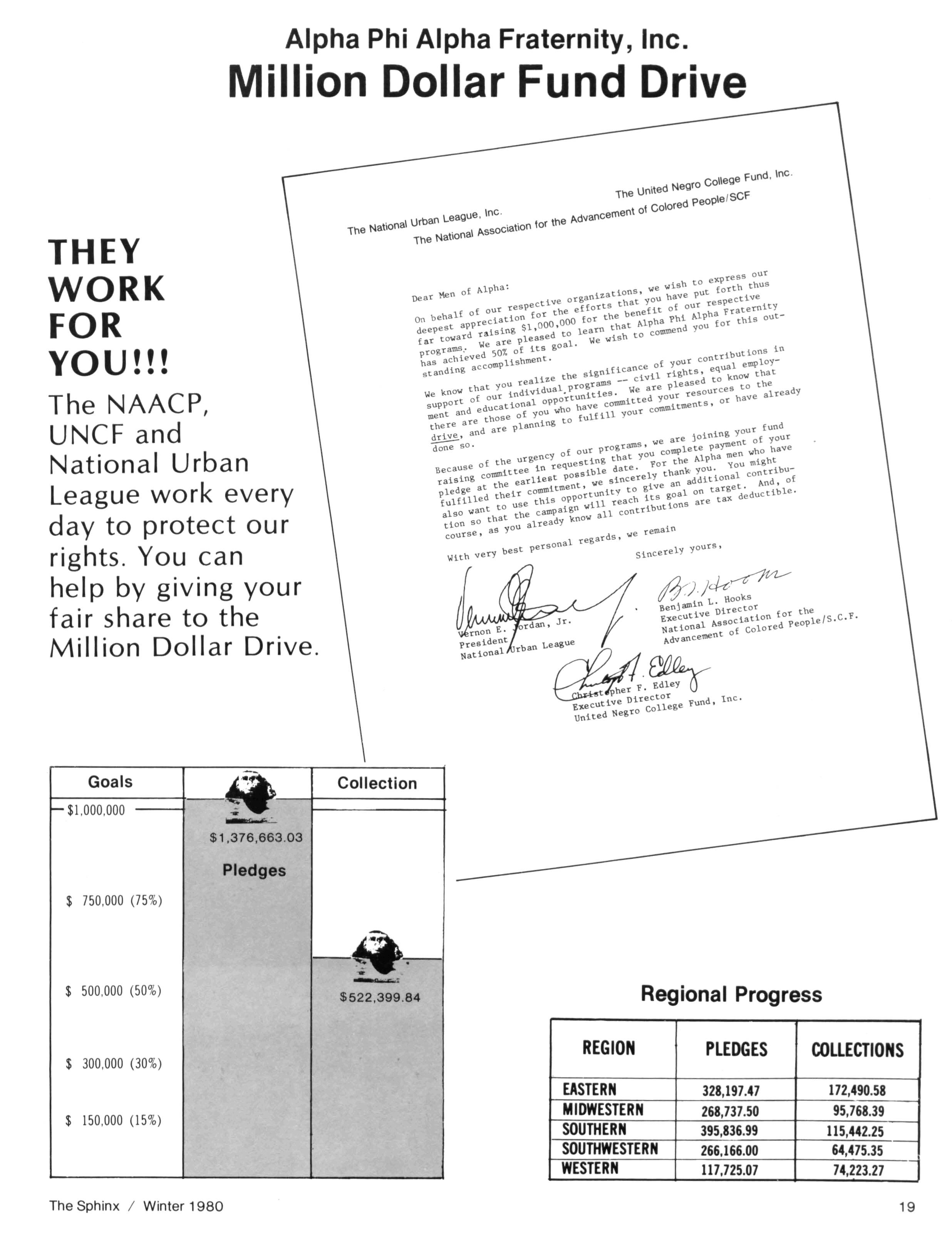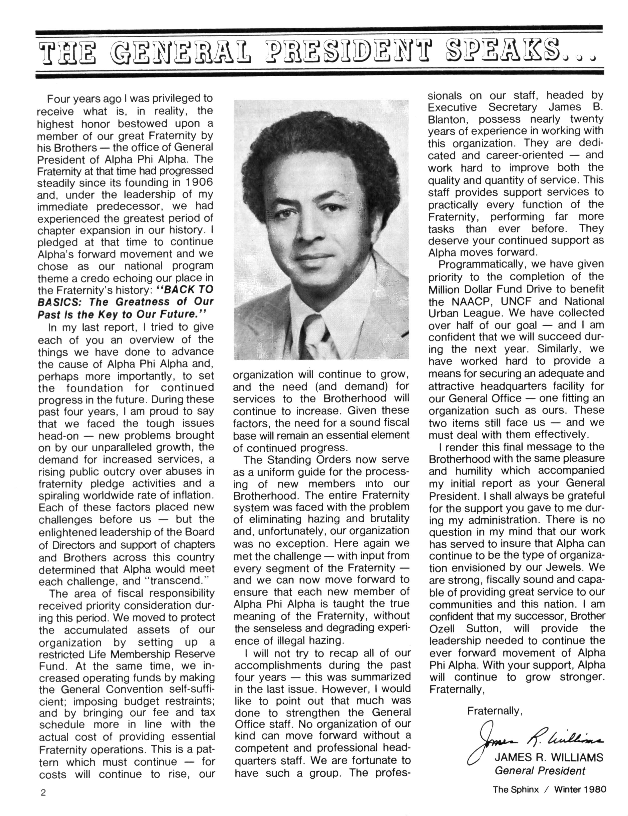 sionals on our staff, headed by Executive Secretary James B Blanton, possess nearly twenty years of experience in working with this organization. They are dedicated and career-oriented — and work hard to improve both the quality and quantity of service This staff provides support services to practically every function of the Fraternity, performing far more tasks than ever before They deserve your continued support as Alpha moves forward Programmatically, we have given priority to the completion of the Million Dollar Fund Drive to benefit the NAACP, UNCF and National Urban League We have collected over half of our goal — and I am confident that we will succeed during the next year Similarly, we have worked hard to provide a means for securing anadequate and attractive headquarters facility for our General Office — one fitting an organization such as ours These two items still face us — and we must deal with them effectively. I render this final message to the Brotherhood with the same pleasure and humility which accompanied my initial report as your General President. I shall always be grateful for the support you gave to me during my administration There is no question in my mind that our work has served to insure that Alpha can continue to be the type of organization envisioned by our Jewels We are strong, fiscally sound andcapable of providing great service to our communities and this nation I am confident that my successor, Brother Ozell Sutton, will provide the leadership needed to continue the ever forward movement of Alpha Phi Alpha With your support, Alpha will continue to grow stronger. Fraternally,