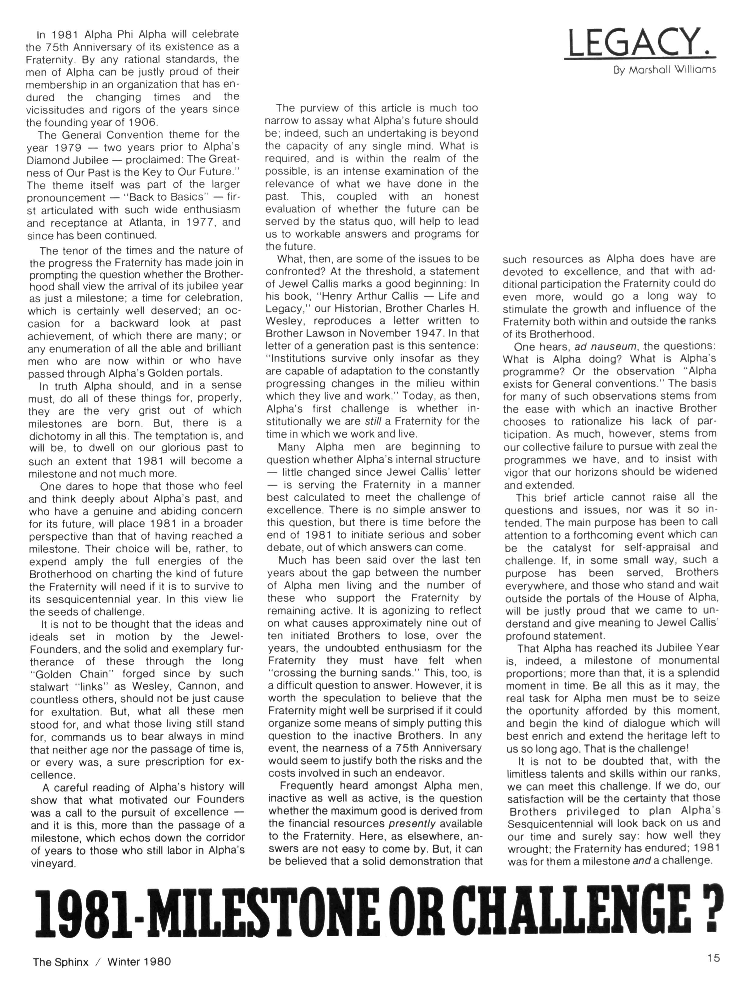 — Brother Marshall Williams, a 50-year member of Alpha Phi Alpha, contemplates the coming of the Diamond Jubilee His article is entitled, "1981 — Milestone or Challenge?."
