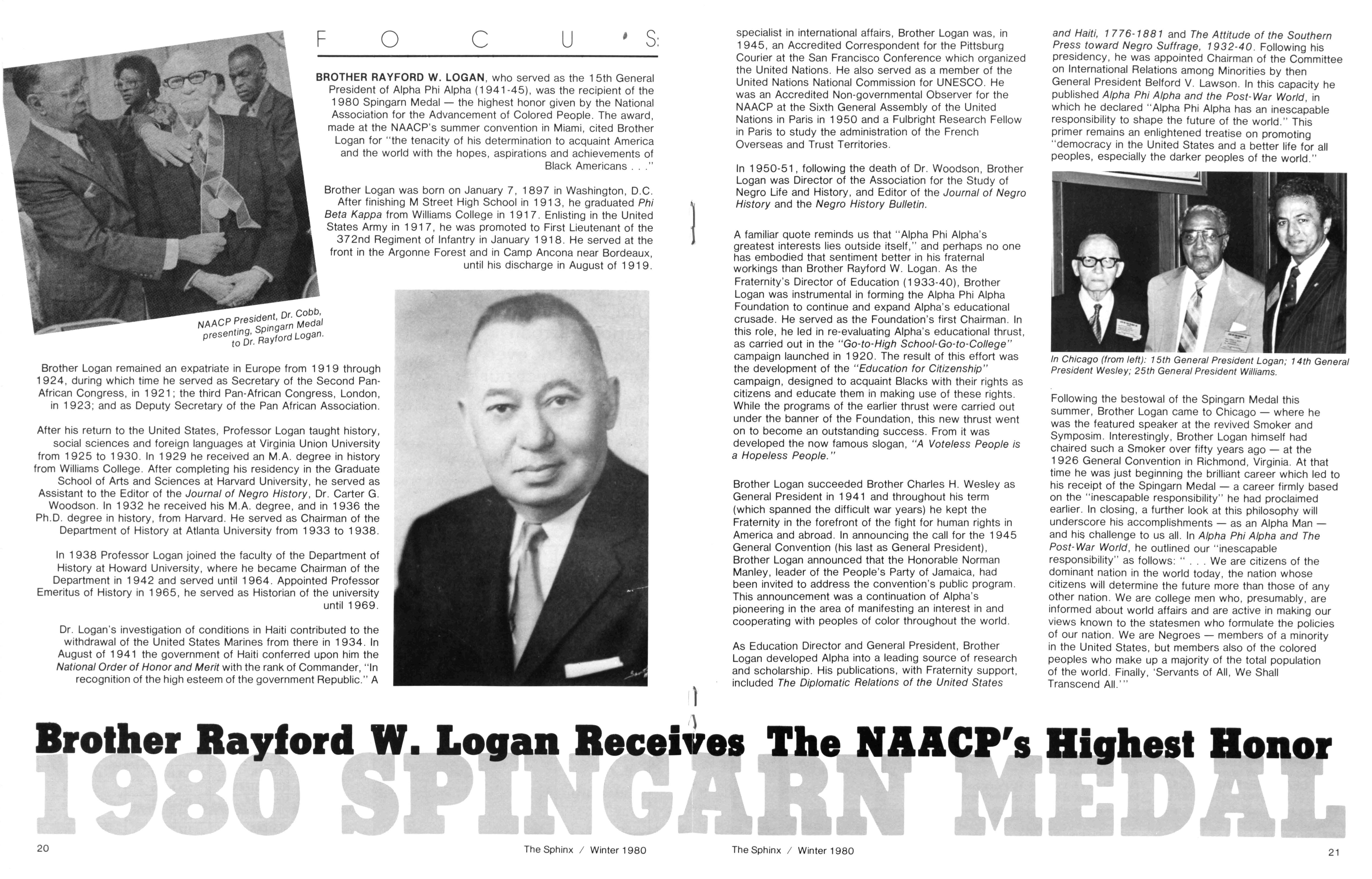 FOCUS — Alpha's 14th General President, Brother Rayford W. Logan, receives the NAACP's Spingarn Medal — recognizing over fifty years of scholarly achievements.