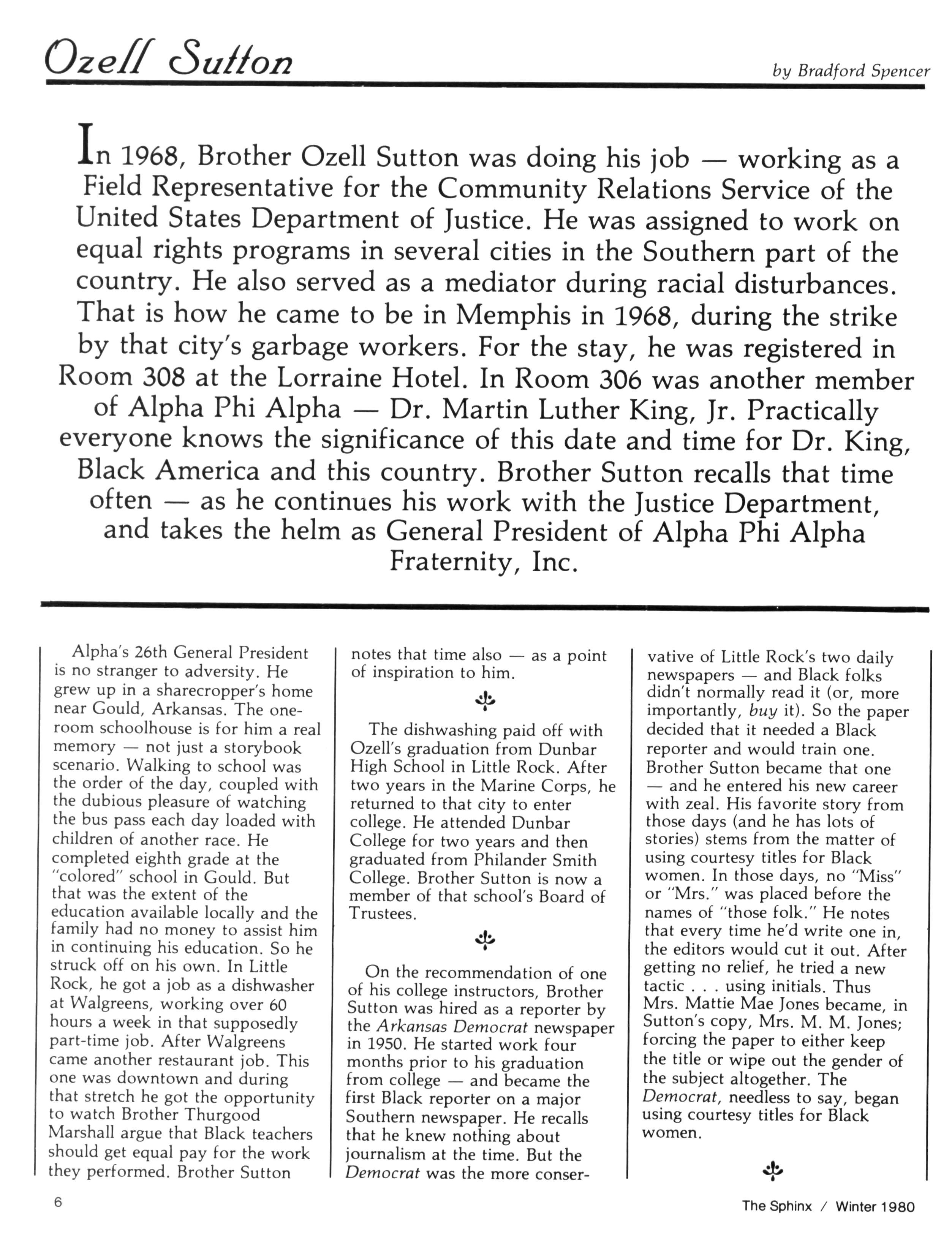 In 1968, Brother Ozell Sutton was doing his job — working as a Field Representative for the Community Relations Service of the United States Department of Justice. He was assigned to work on equal rights programs in several cities in the Southern part of the country. He also served as a mediator during racial disturbances. That is how he came to be in Memphis in 1968, during the strike by that city's garbage workers. For the stay, he was registered in Room 308 at the Lorraine Hotel. In Room 306 was another member of Alpha Phi Alpha — Dr. Martin Luther King, Jr. Practically everyone knows the significance of this date and time for Dr. King, Black America and this country. Brother Sutton recalls that time often — as he continues his work with the Justice Department, and takes the helm as General President of Alpha Phi Alpha Fraternity, Inc.