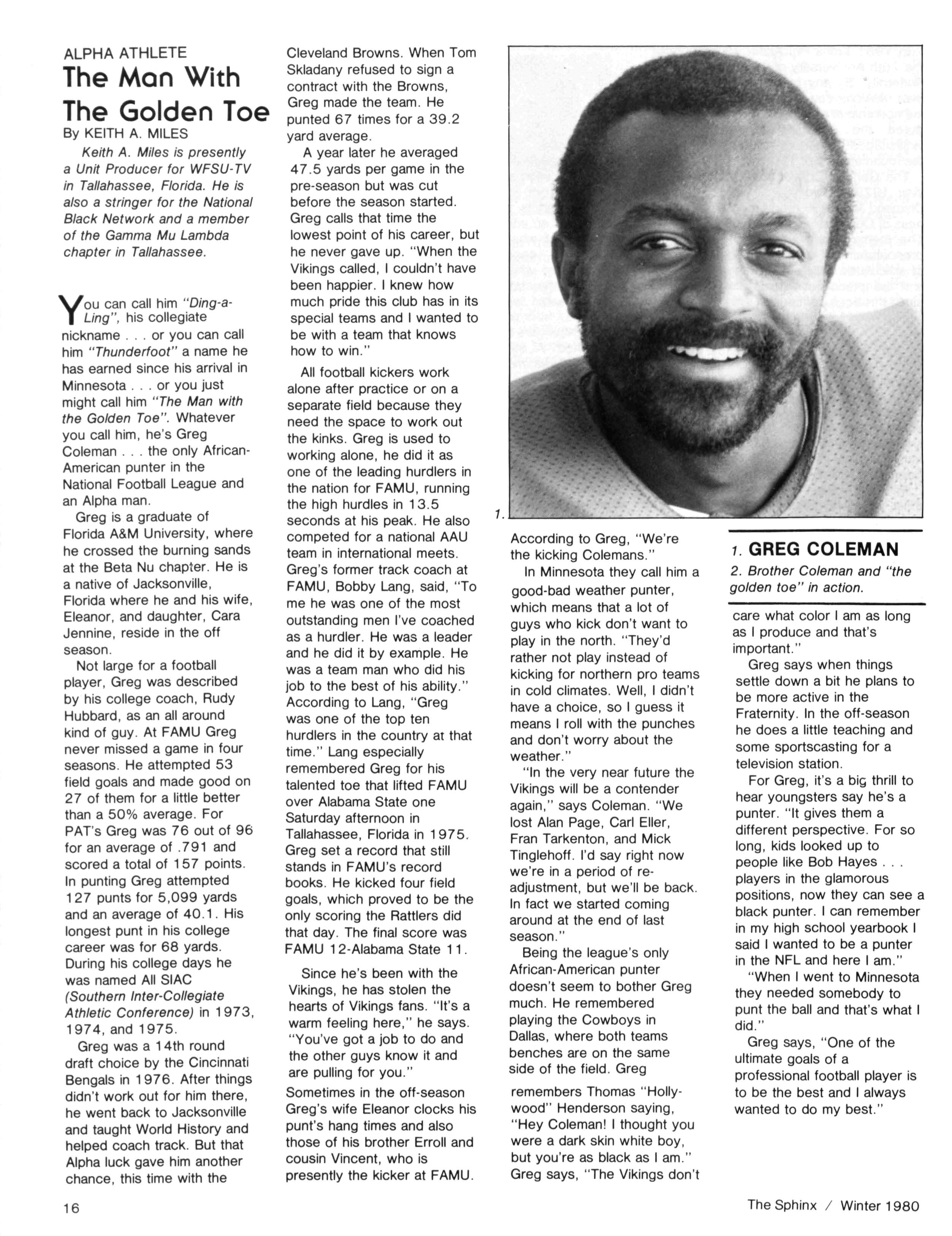 ALPHA ATHLETE — Brother Greg Coleman is the National Football League's only Black punter. His comeback and the improved Minnesota Vikings are examined by Brother Keith Miles
