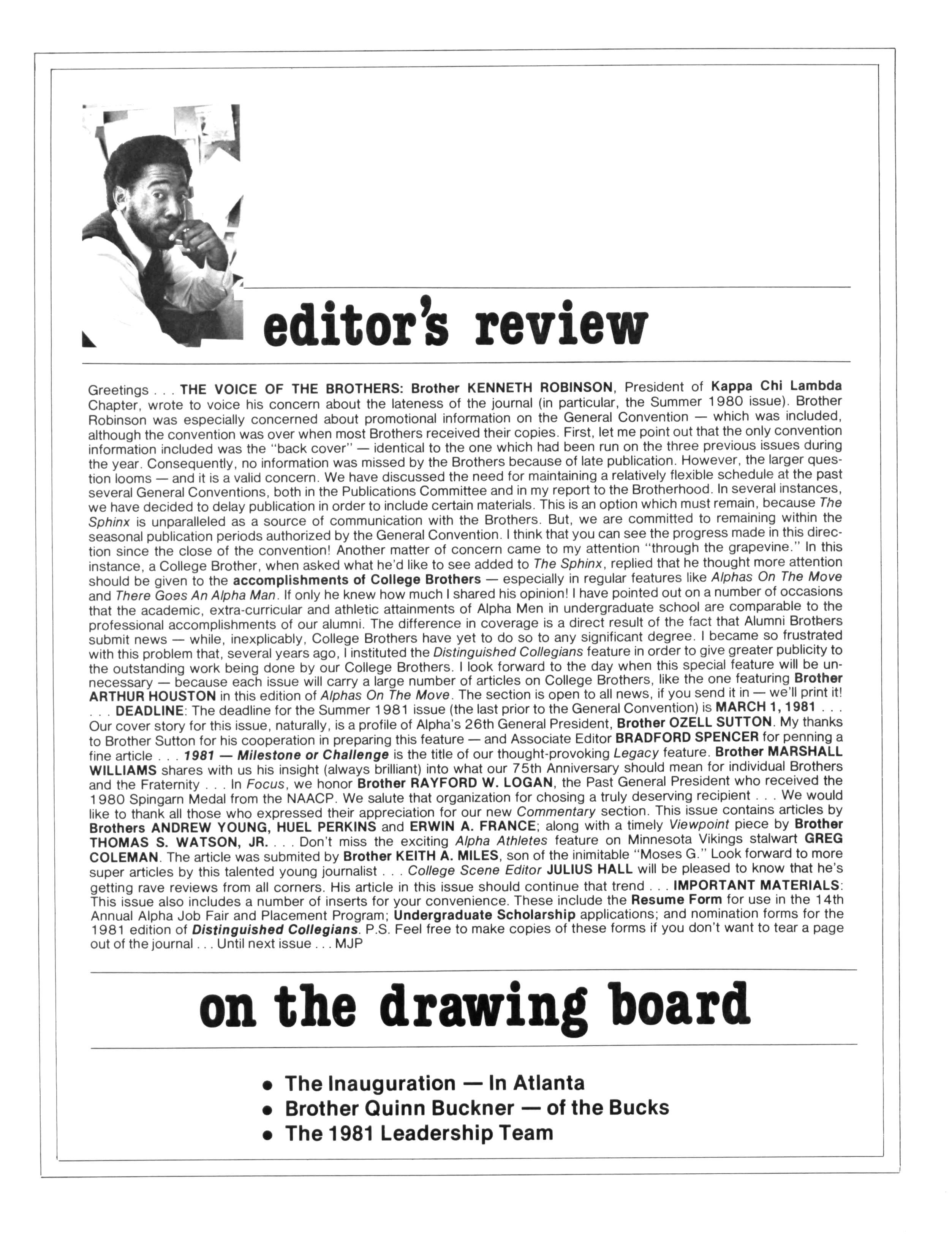 DEADLINE: The deadline for the Summer 1981 issue (the last prior to the General Convention) is MARCH 1,1981 Our cover story for this issue, naturally, is a profile of Alpha's 26th General President, Brother OZELL SUTTON. My thanks to Brother Sutton for his cooperation in preparing this feature —and Associate Editor BRADFORD SPENCER for penning a fine article 7987 — Milestone or Challenge is the title of our thought-provoking Legacy feature Brother MARSHALL WILLIAMS shares with us his insight (always brilliant) into what our 75th Anniversary should mean for individual Brothers and the Fraternity ... In Focus, we honor Brother RAYFORD W. LOGAN, the Past General President who received the 1980 Spingam Medal from the NAACP We salute that organization for chosing a truly deserving recipient We would like to thank all those who expressed their appreciation for our new Commentary section This issue contains articles by Brothers ANDREW YOUNG, HUEL PERKINS and ERWIN A FRANCE; along with a timely Viewpoint piece by Brother THOMAS S. WATSON, JR. Don't miss the exciting Alpha Athletes feature on Minnesota Vikings stalwart GREG COLEMAN. The article was submited by Brother KEITH A. MILES, son of the inimitable "Moses G." Look forward to more super articles by this talented young journalist College Scene Editor JULIUS HALL will be pleased to know that he's getting rave reviews from all corners His article in this issue should continue that trend IMPORTANT MATERIALS: This issue also includes a number of inserts for your convenience These include the Resume Form for use in the 14th Annual Alpha Job Fair and Placement Program; Undergraduate Scholarship applications; and nomination forms for the 1981 edition of Distinguished Collegians. P.S Feel free to make copies of these forms if you don't want to tear a page out of the journal.. Until next issue MJP