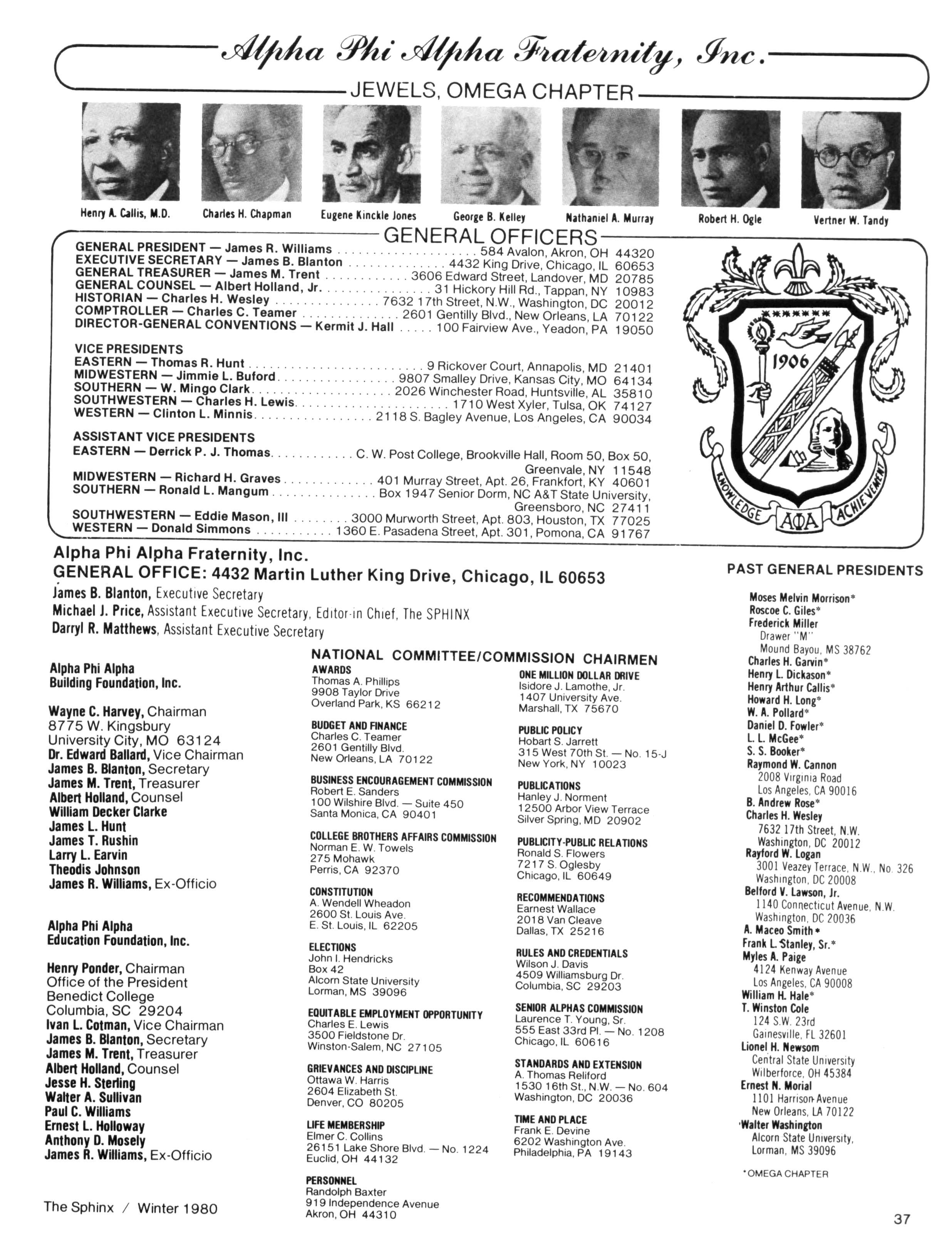 sionals on our staff, headed by Executive Secretary James B Blanton, possess nearly twenty years of experience in working with this organization. They are dedicated and career-oriented — and work hard to improve both the quality and quantity of service This staff provides support services to practically every function of the Fraternity, performing far more tasks than ever before They deserve your continued support as Alpha moves forward Programmatically, we have given priority to the completion of the Million Dollar Fund Drive to benefit the NAACP, UNCF and National Urban League We have collected over half of our goal — and I am confident that we will succeed during the next year Similarly, we have worked hard to provide a means for securing anadequate and attractive headquarters facility for our General Office — one fitting an organization such as ours These two items still face us — and we must deal with them effectively. I render this final message to the Brotherhood with the same pleasure and humility which accompanied my initial report as your General President. I shall always be grateful for the support you gave to me during my administration There is no question in my mind that our work has served to insure that Alpha can continue to be the type of organization envisioned by our Jewels We are strong, fiscally sound andcapable of providing great service to our communities and this nation I am confident that my successor, Brother Ozell Sutton, will provide the leadership needed to continue the ever forward movement of Alpha Phi Alpha With your support, Alpha will continue to grow stronger. Fraternally,