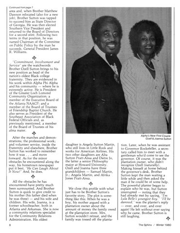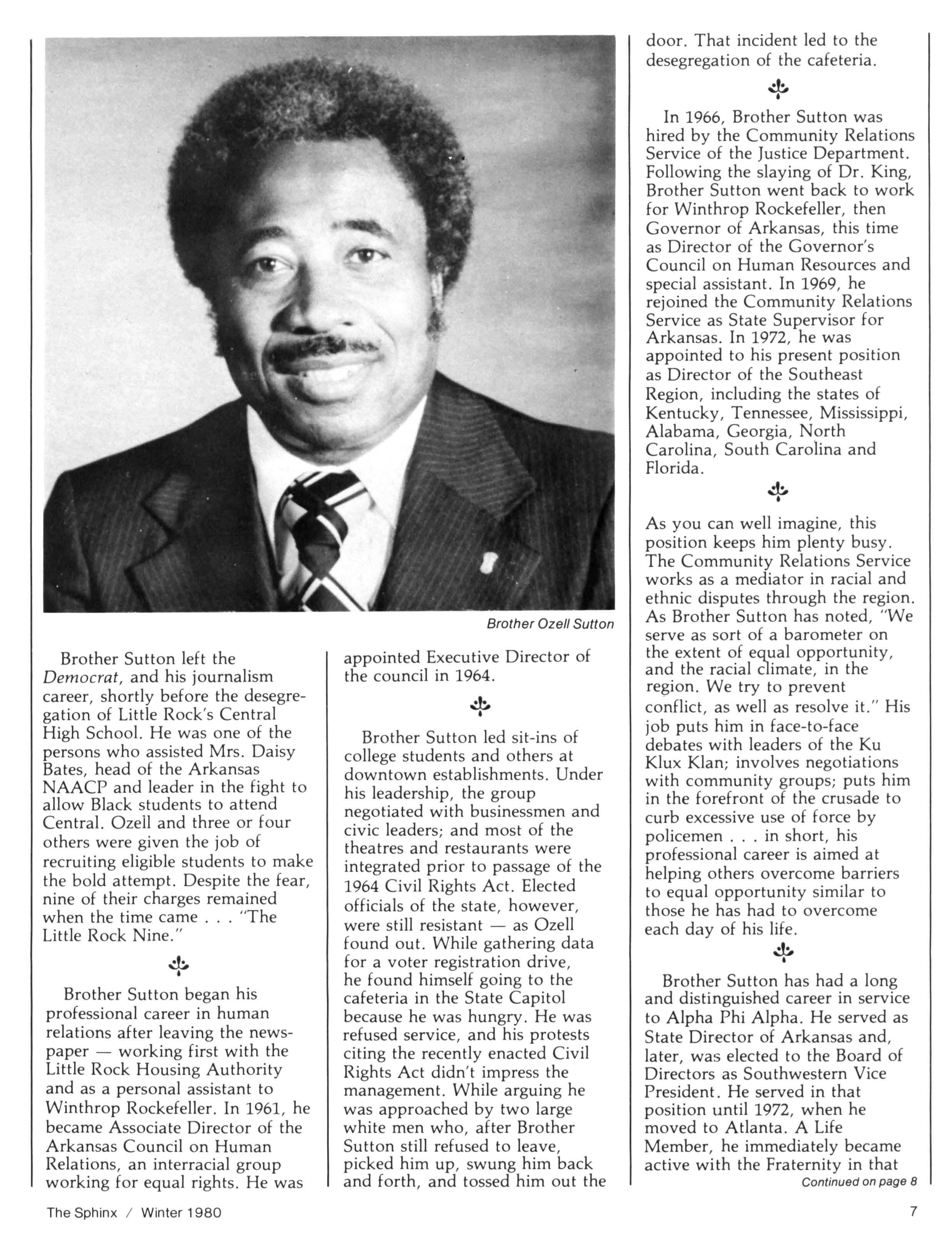 Alpha's 26th General President is no stranger to adversity. He grew up in a sharecropper's home near Gould, Arkansas The oneroom schoolhouse is for him a real memory — not just a storybook scenario. Walking to school was the order of the day, coupled with the dubious pleasure of watching the bus pass each day loaded with children of another race. He completed eighth grade at the "colored" school in Gould But that was the extent of the education available locally and the family had no money to assist him in continuing his education So he struck off on his own. In Little Rock, he got a job as a dishwasher at Walgreens, working over 60 hours a week in that supposedly part-time job. After Walgreens came another restaurant job. This one was downtown and during that stretch he got the opportunity to watch Brother Thurgood Marshall argue that Black teachers should get equal pay for the work they performed Brother Sutton