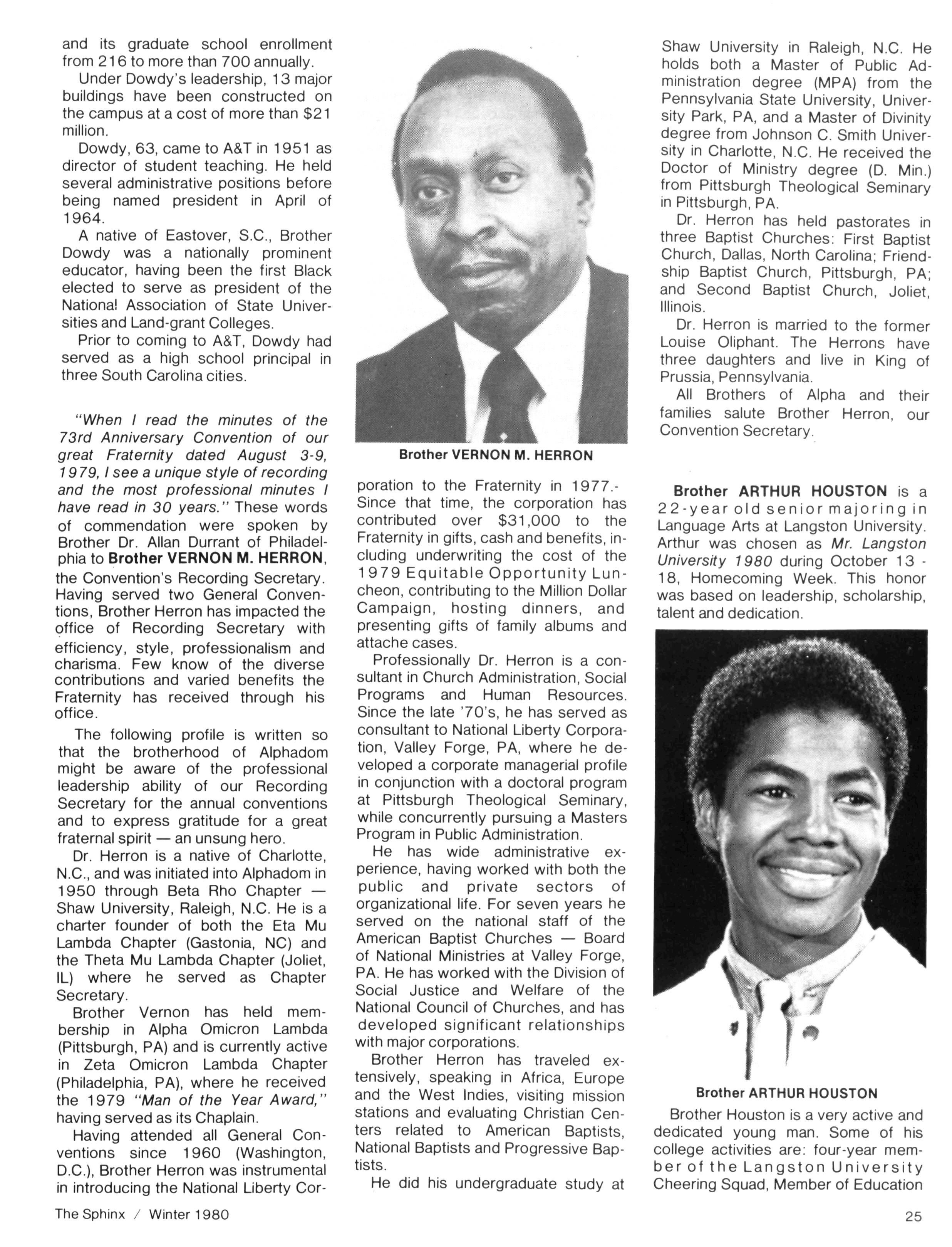Greetings THE VOICE OF THE BROTHERS: Brother KENNETH ROBINSON, President of Kappa Chi Lambda Chapter, wrote to voice his concern about the lateness of the journal (in particular, the Summer 1980 issue) Brother Robinson was especially concerned about promotional information on the General Convention — which was included, although the convention was over when most Brothers received their copies First, let me point out that the only convention information included was the "back cover" — identical to the one which had been run on the three previous issues during the year Consequently, no information was missed by the Brothers because of late publication However, the larger question looms — and it is avalid concern We have discussed the need for maintaining a relatively flexible schedule at the past several General Conventions, both in the Publications Committee and in my report to the Brotherhood Inseveral instances, we have decided to delay publication in order to include certain materials This is an option which must remain, because The Sphinx is unparalleled as a source of communication with the Brothers But, we are committed to remaining within the seasonal publication periods authorized by the General Convention I think that you can see the progress made in this direction since the close of the convention! Another matter of concern came to my attention "through the grapevine." In this instance, a College Brother, when asked what he'd like to see added to The Sphinx, replied that he thought more attention should be given to the accomplishments of College Brothers — especially in regular features like Alphas On The Move and There Goes An Alpha Man. If only he knew how much Ishared his opinion! Ihave pointed out on a number of occasions that the academic, extra-curricular and athletic attainments of Alpha Men in undergraduate school are comparable to the professional accomplishments of our alumni The difference in coverage is a direct result of the fact that Alumni Brothers submit news — while, inexplicably, College Brothers have yet to do so to any significant degree I became so frustrated with this problem that, several years ago, I instituted the Distinguished Collegians feature in order to give greater publicity to the outstanding work being done by our College Brothers I look forward to the day when this special feature will be unnecessary — because each issue will carry a large number of articles on College Brothers, like the one featuring Brother ARTHUR HOUSTON in this edition of Alphas On The Move. The section is open to all news, if you send it in — we'll print it!