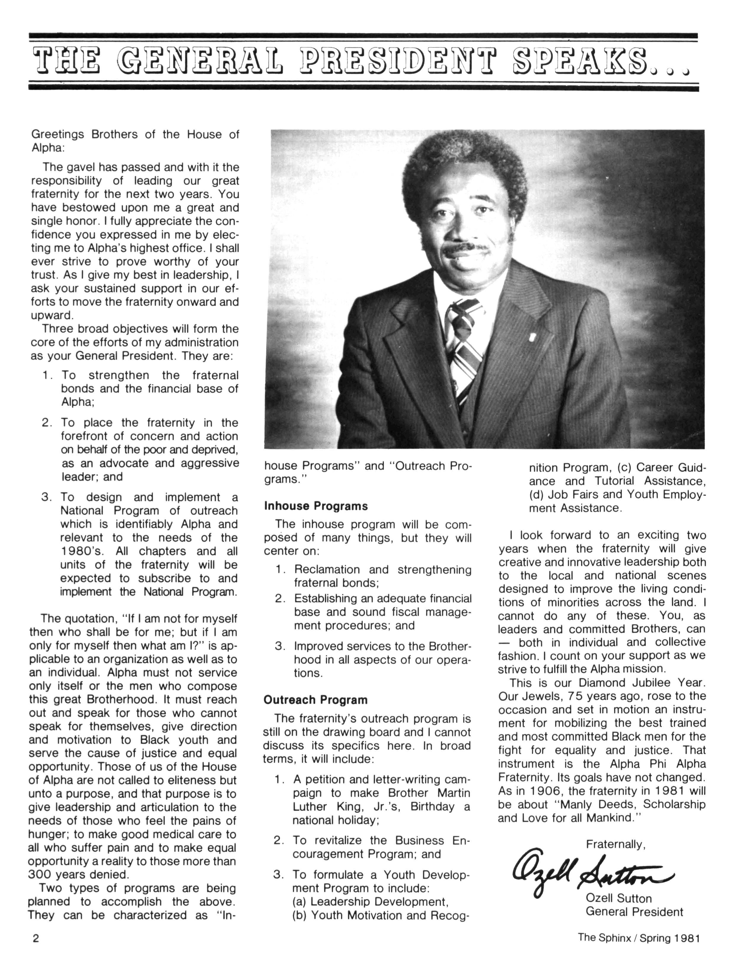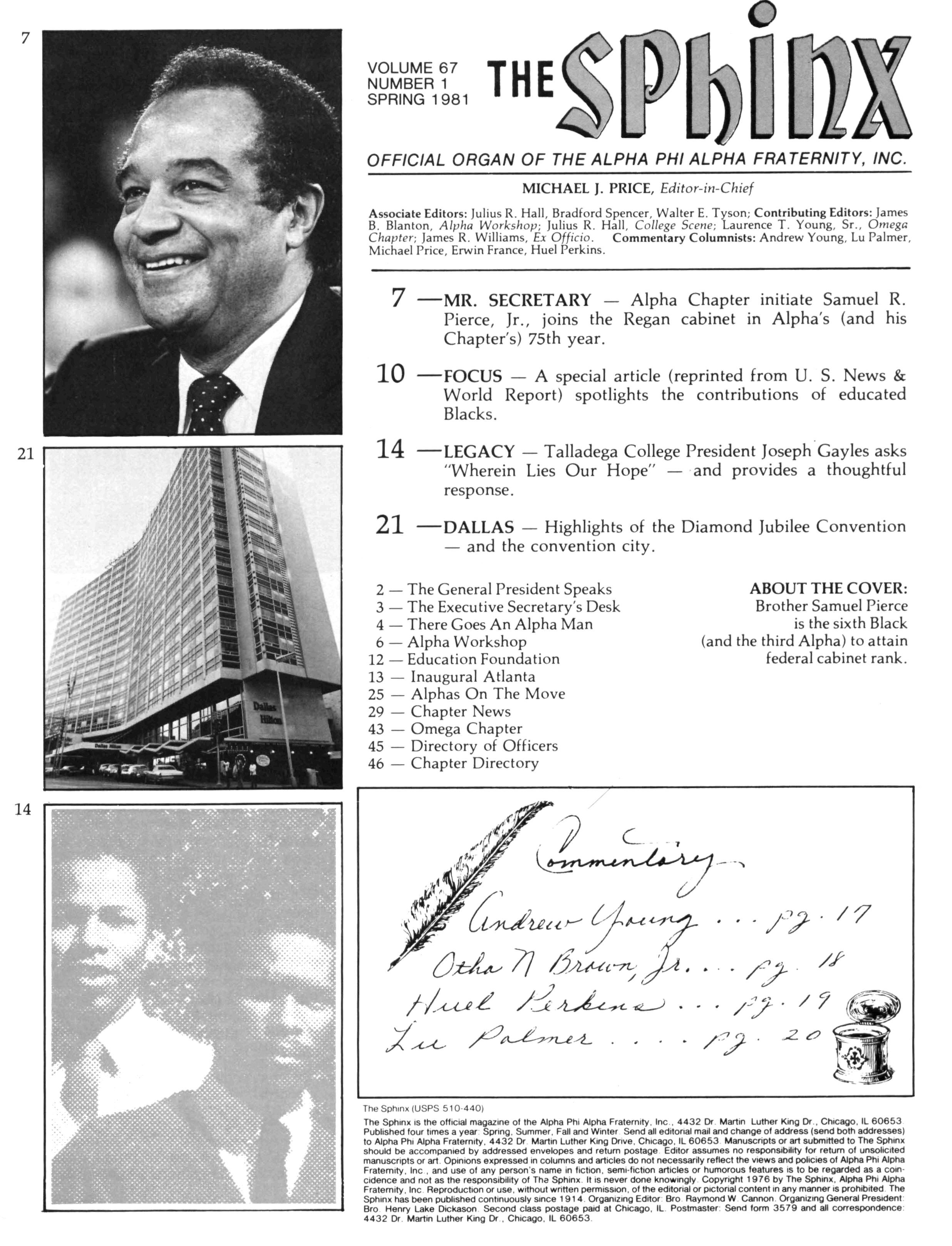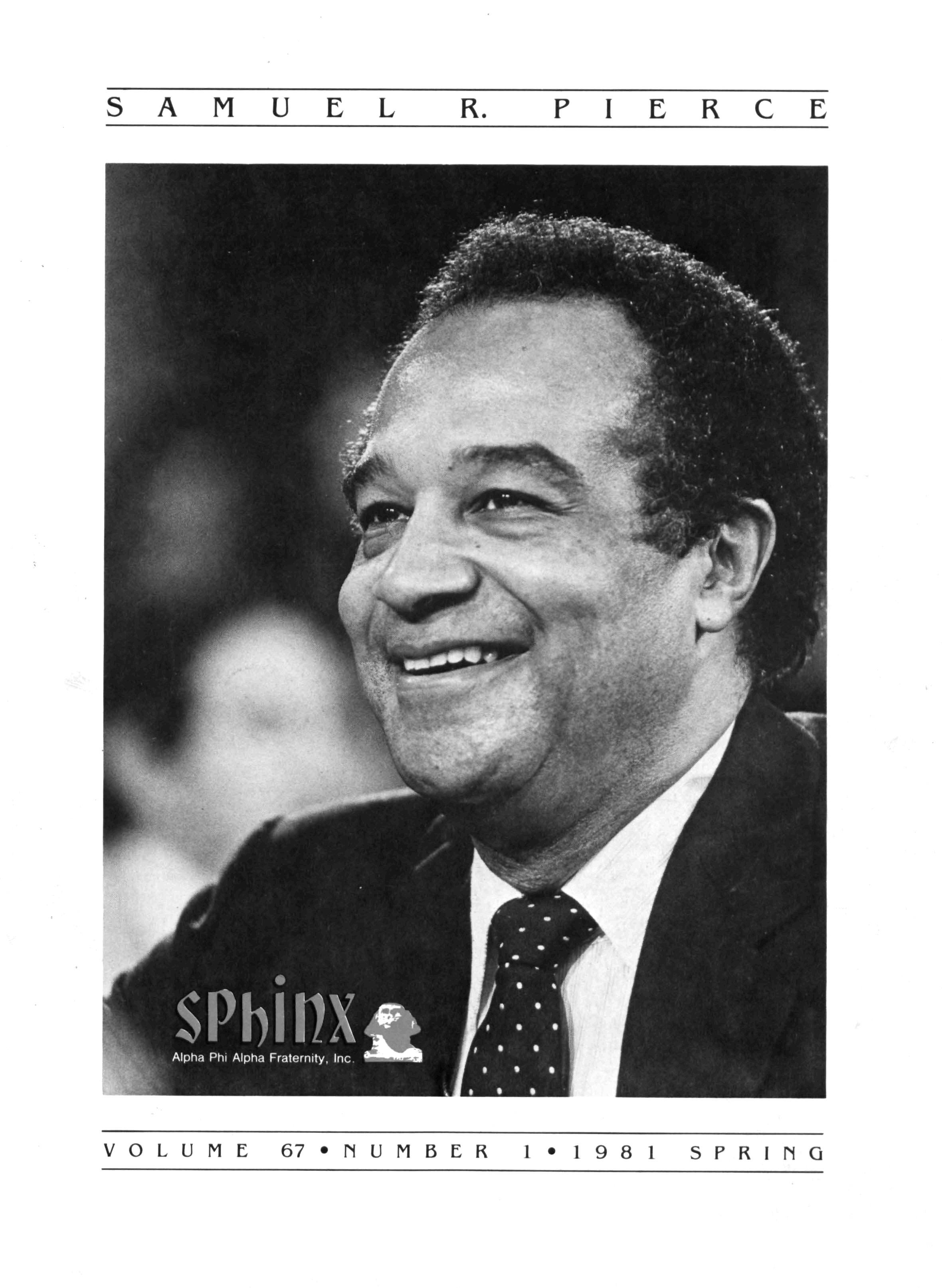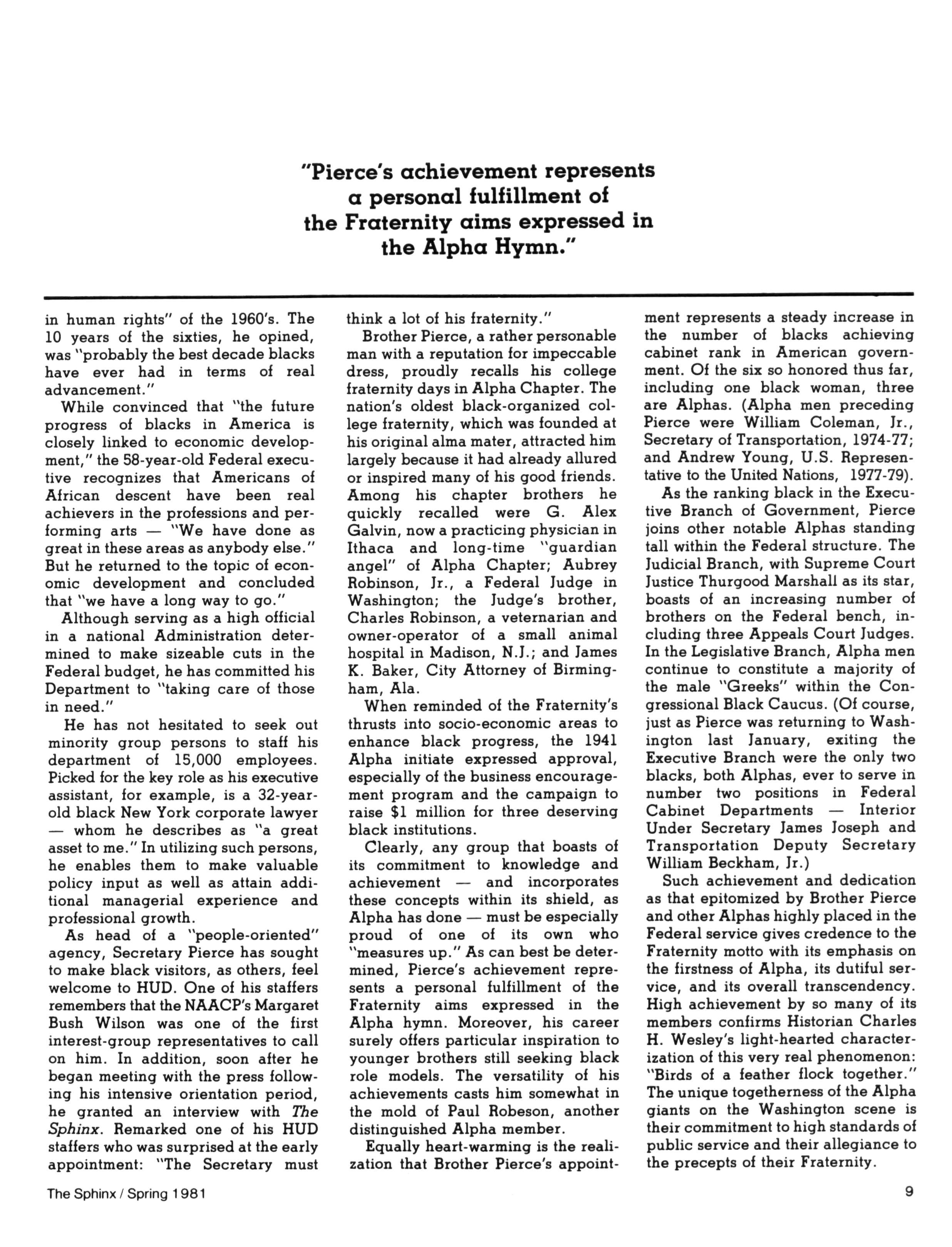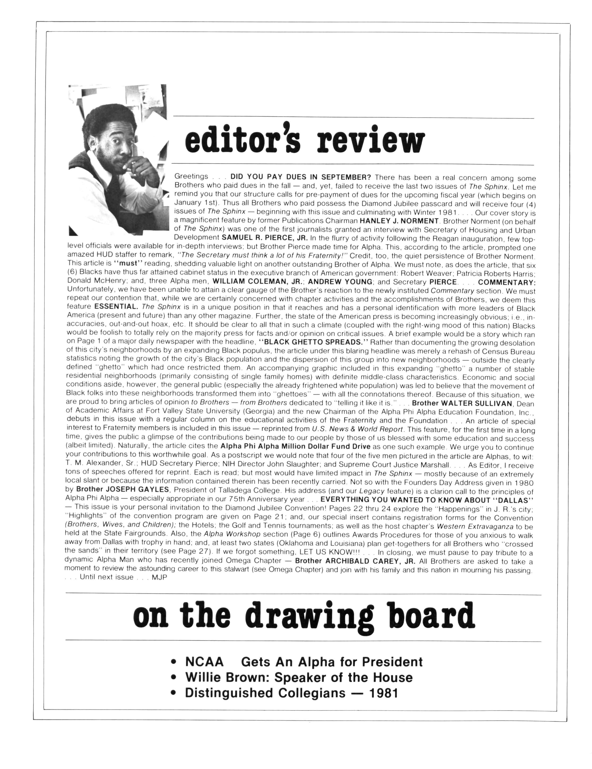 Greetings DID YOU PAY DUES IN SEPTEMBER? There has been a real concern among some Brothers who paid dues in the fall — and, yet, failed to receive the last two issues of The Sphinx. Let me remind you that our structure calls for pre-payment of dues for the upcoming fiscal year (which begins on January 1st) Thus all Brothers who paid possess the Diamond Jubilee passcard and will receive four (4) issues of The Sphinx — beginning with this issue and culminating with Winter 1981.. Our cover story is a magnificent feature by former Publications Chairman HANLEY J NORMENT Brother Norment (on behalf of The Sphinx) was one of the first journalists granted an interview with Secretary of Housing and Urban Development SAMUEL R PIERCE, JR In the flurry of activity following the Reagan inauguration, few toplevel officials were available for in-depth interviews; but Brother Pierce made time for Alpha This, according to the article, prompted one amazed HUD staffer to remark "The Secretary must think a lot of his Fraternity!" Credit, too, the quiet persistence of Brother Norment This article is "must" reading, shedding valuable light on another outstanding Brother of Alpha We must note, as does the article, that six (6) Blacks have thus far attained cabinet status in the executive branch of American government: Robert Weaver; Patricia Roberts Harris; Donald McHenry; and, three Alpha men, WILLIAM COLEMAN, JR.; ANDREW YOUNG; and Secretary PIERCE COMMENTARY: