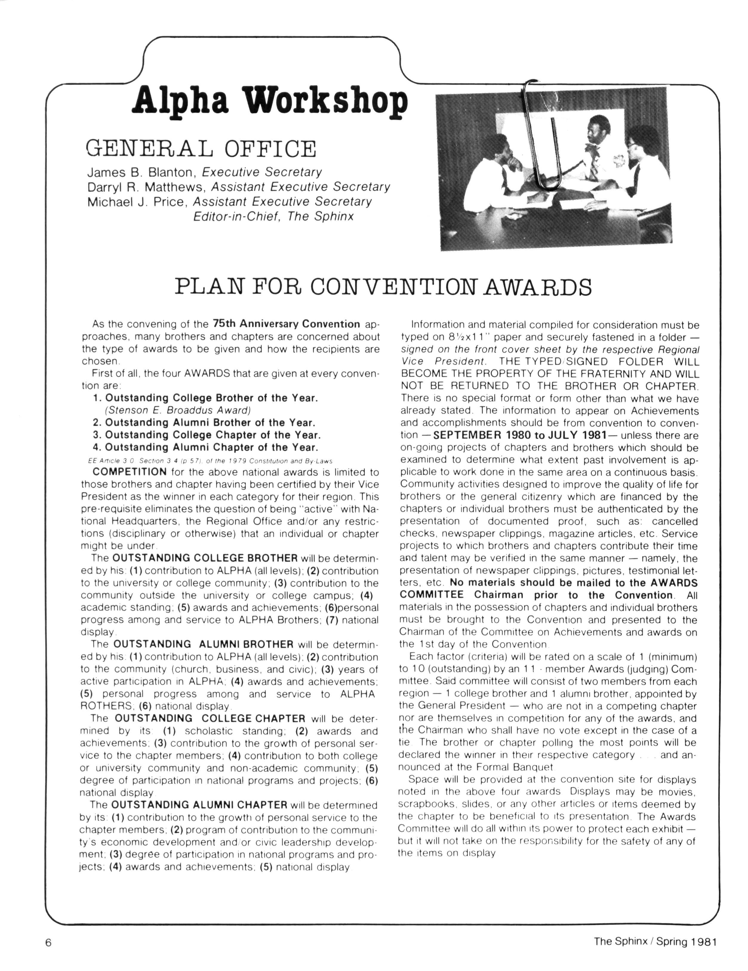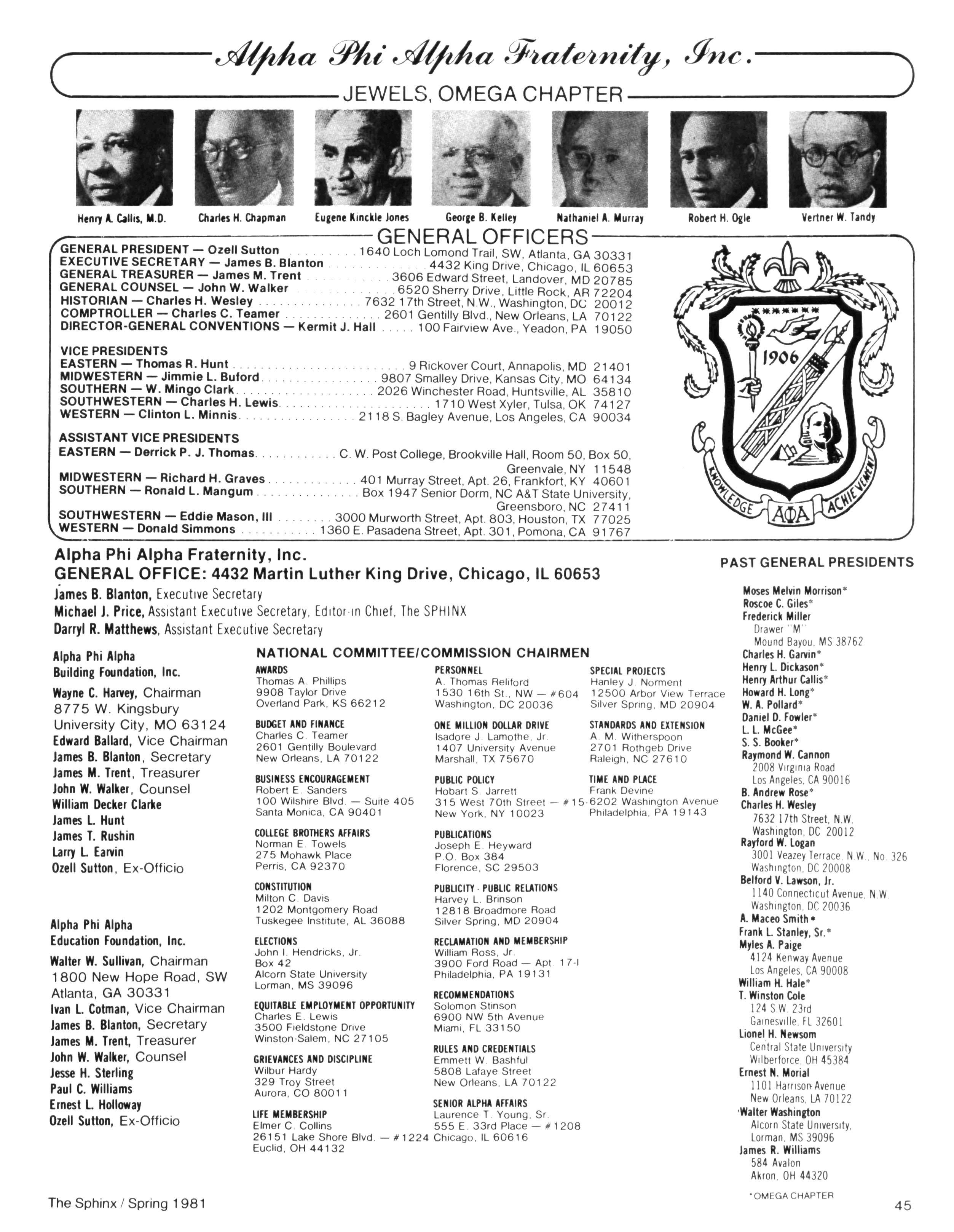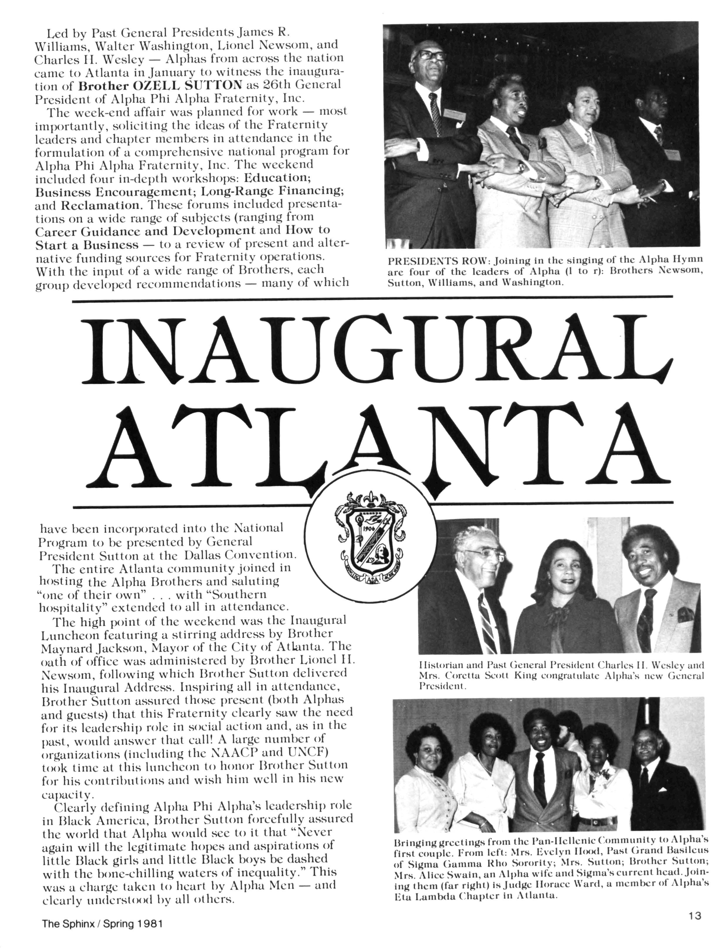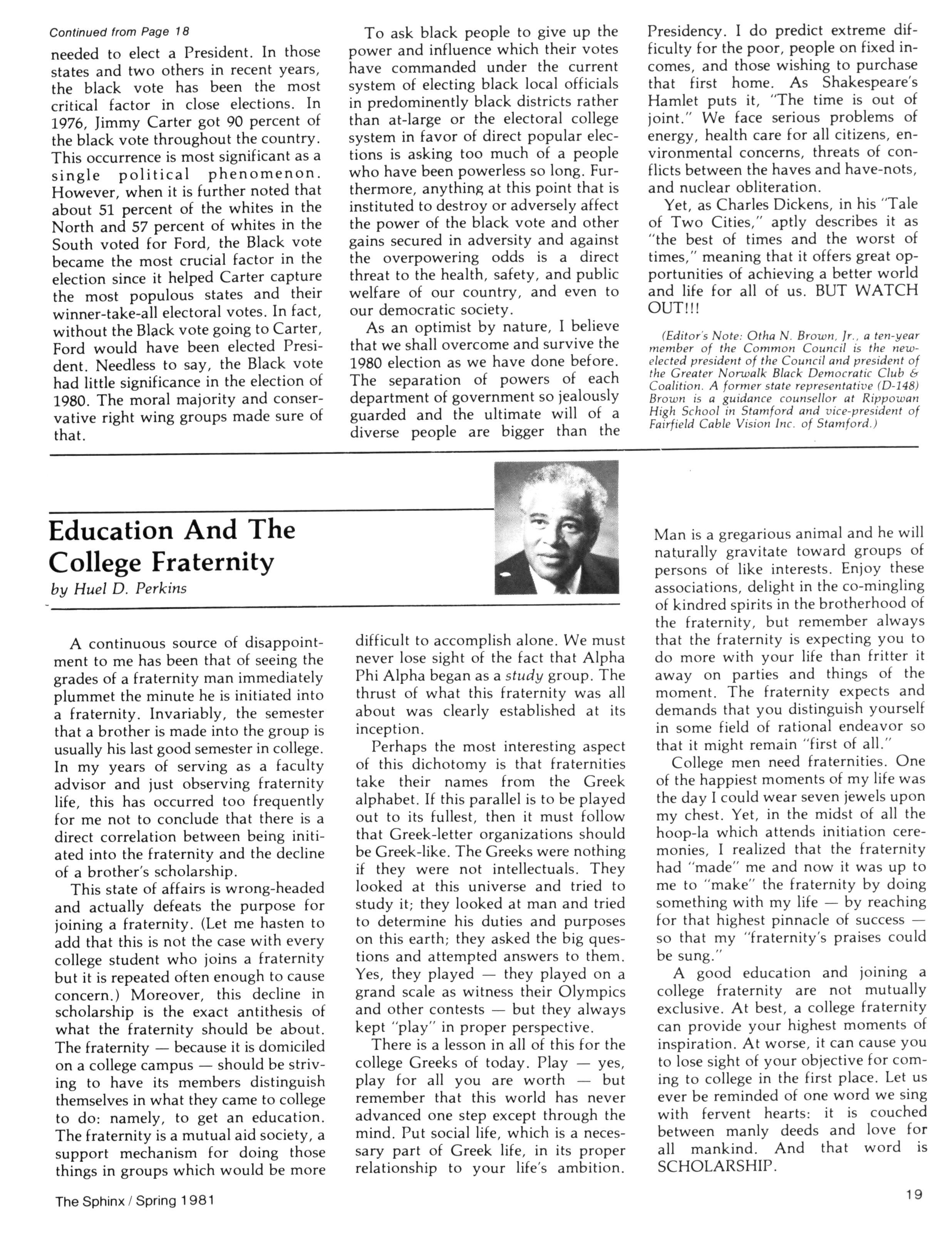 Greetings DID YOU PAY DUES IN SEPTEMBER? There has been a real concern among some Brothers who paid dues in the fall — and, yet, failed to receive the last two issues of The Sphinx. Let me remind you that our structure calls for pre-payment of dues for the upcoming fiscal year (which begins on January 1st) Thus all Brothers who paid possess the Diamond Jubilee passcard and will receive four (4) issues of The Sphinx — beginning with this issue and culminating with Winter 1981.. Our cover story is a magnificent feature by former Publications Chairman HANLEY J NORMENT Brother Norment (on behalf of The Sphinx) was one of the first journalists granted an interview with Secretary of Housing and Urban Development SAMUEL R PIERCE, JR In the flurry of activity following the Reagan inauguration, few toplevel officials were available for in-depth interviews; but Brother Pierce made time for Alpha This, according to the article, prompted one amazed HUD staffer to remark "The Secretary must think a lot of his Fraternity!" Credit, too, the quiet persistence of Brother Norment This article is "must" reading, shedding valuable light on another outstanding Brother of Alpha We must note, as does the article, that six (6) Blacks have thus far attained cabinet status in the executive branch of American government: Robert Weaver; Patricia Roberts Harris; Donald McHenry; and, three Alpha men, WILLIAM COLEMAN, JR.; ANDREW YOUNG; and Secretary PIERCE COMMENTARY: