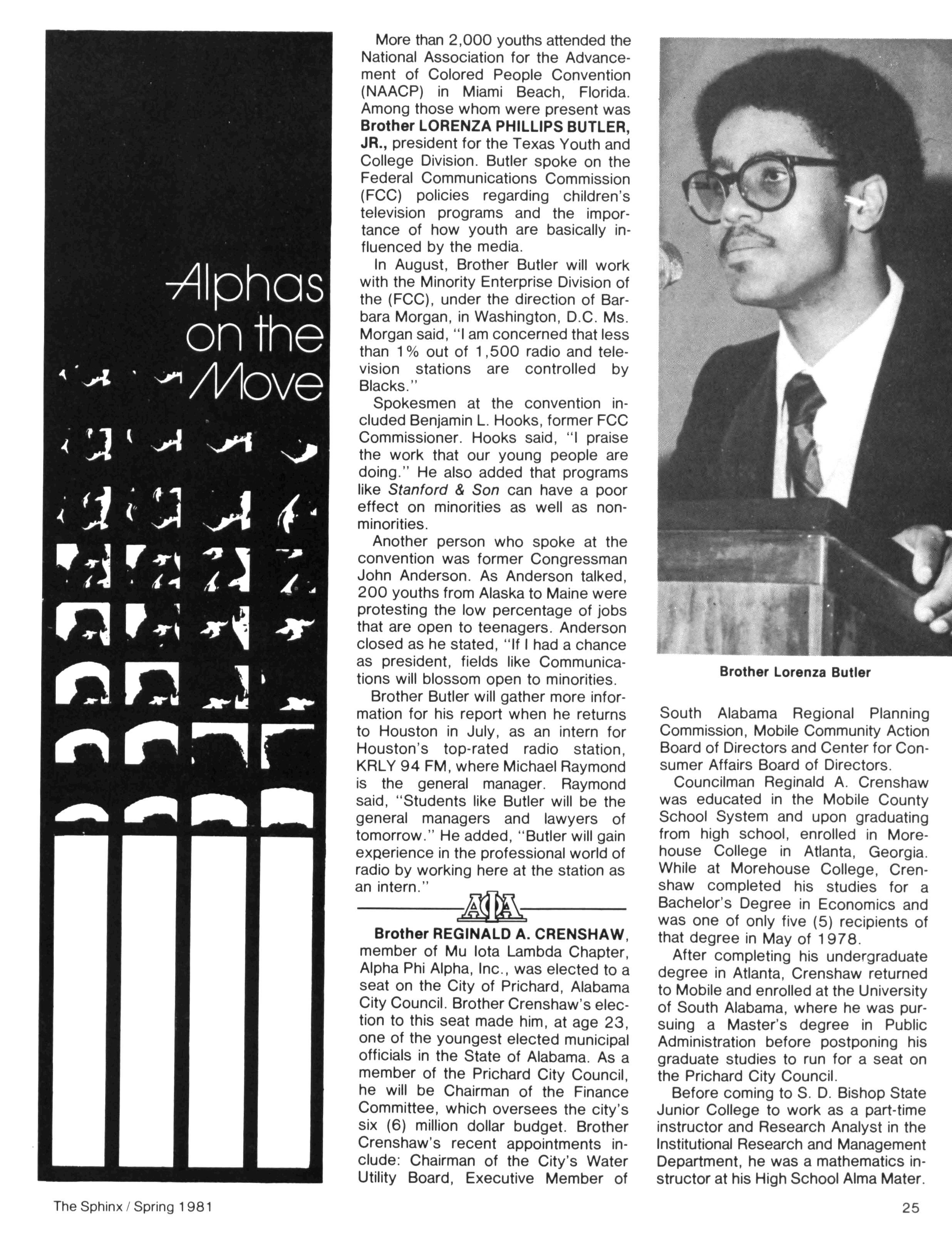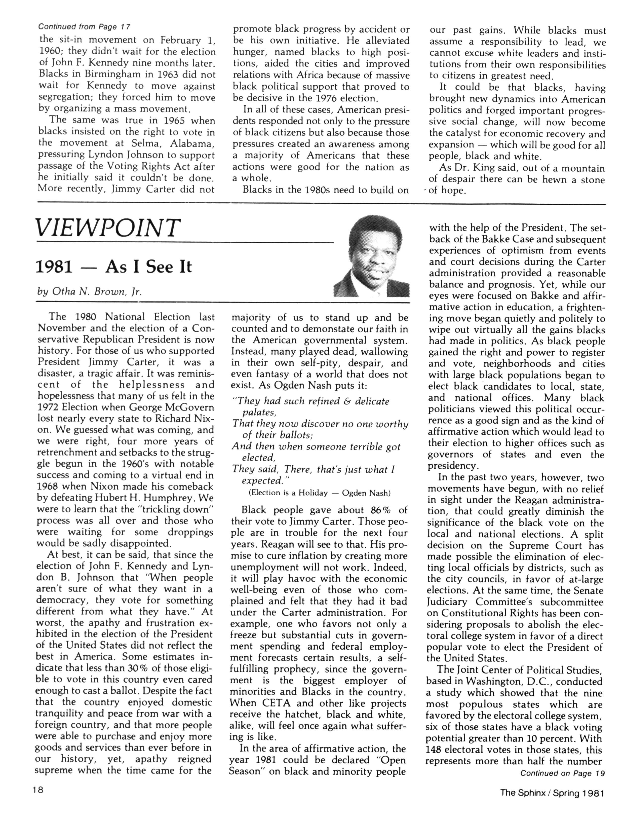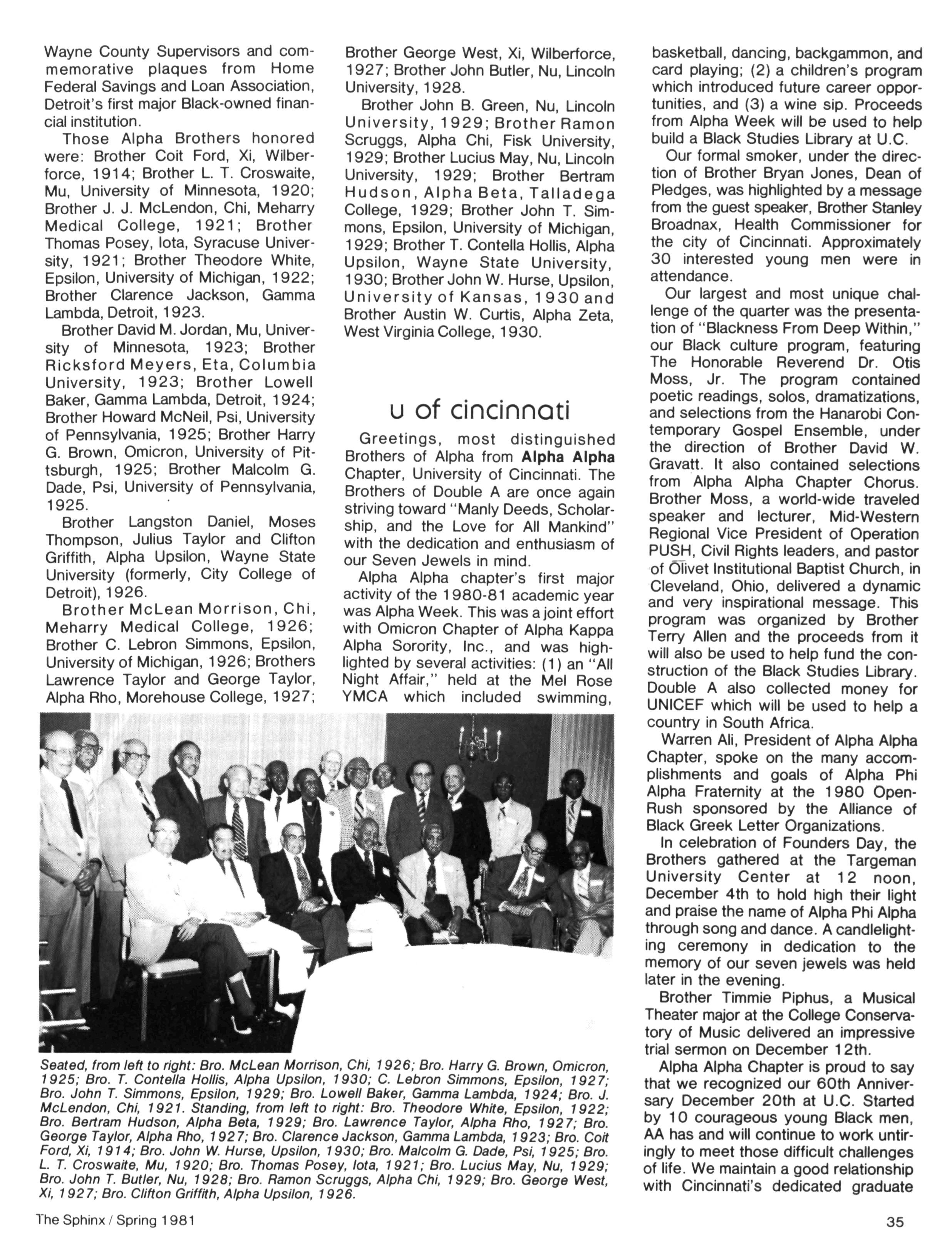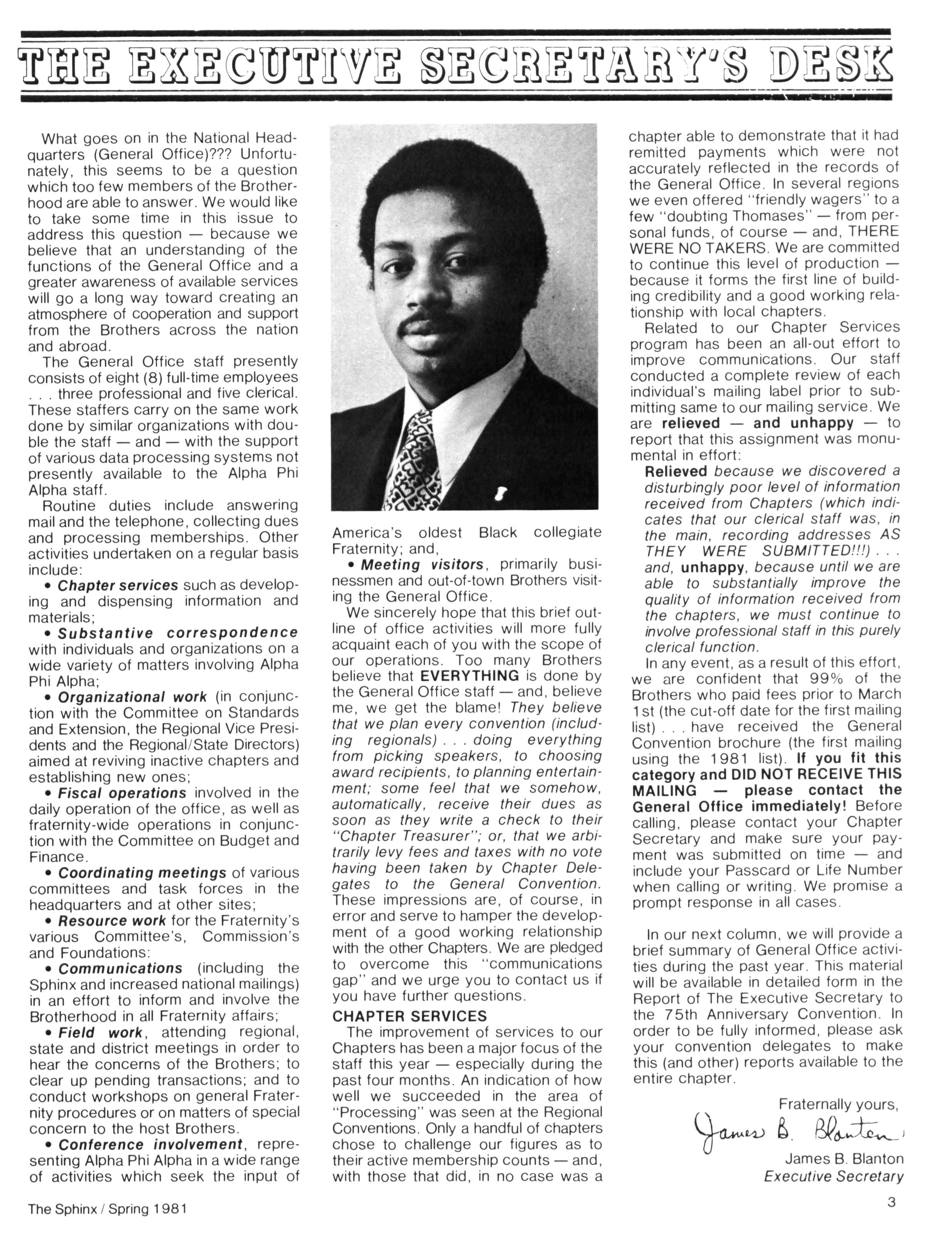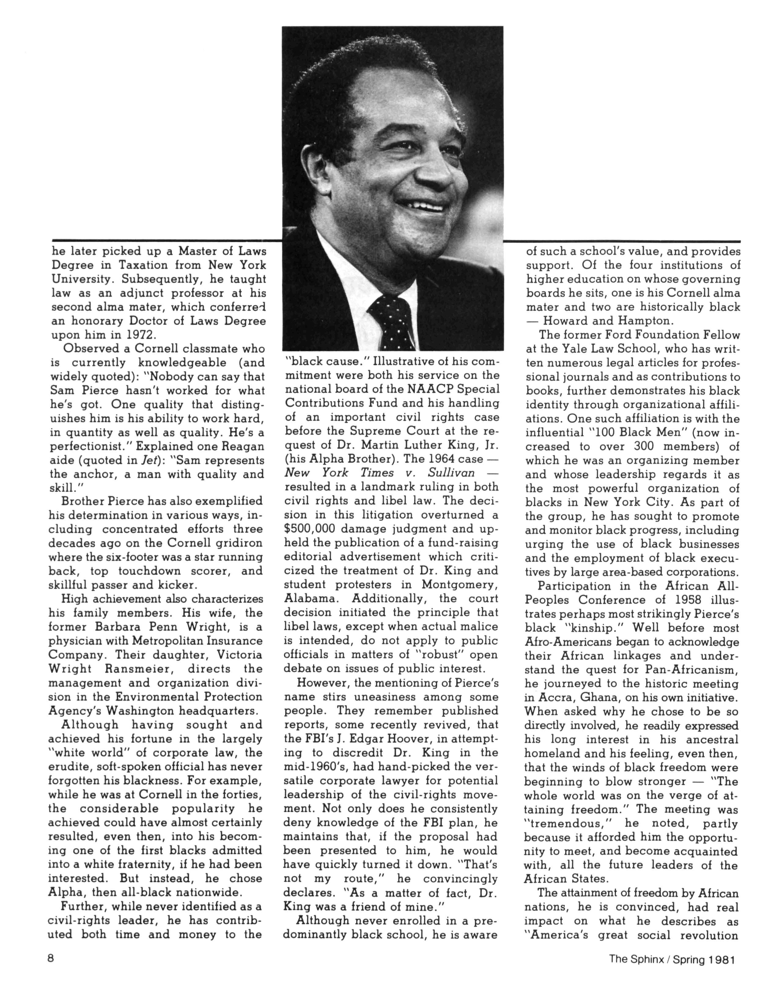 Greetings DID YOU PAY DUES IN SEPTEMBER? There has been a real concern among some Brothers who paid dues in the fall — and, yet, failed to receive the last two issues of The Sphinx. Let me remind you that our structure calls for pre-payment of dues for the upcoming fiscal year (which begins on January 1st) Thus all Brothers who paid possess the Diamond Jubilee passcard and will receive four (4) issues of The Sphinx — beginning with this issue and culminating with Winter 1981.. Our cover story is a magnificent feature by former Publications Chairman HANLEY J NORMENT Brother Norment (on behalf of The Sphinx) was one of the first journalists granted an interview with Secretary of Housing and Urban Development SAMUEL R PIERCE, JR In the flurry of activity following the Reagan inauguration, few toplevel officials were available for in-depth interviews; but Brother Pierce made time for Alpha This, according to the article, prompted one amazed HUD staffer to remark "The Secretary must think a lot of his Fraternity!" Credit, too, the quiet persistence of Brother Norment This article is "must" reading, shedding valuable light on another outstanding Brother of Alpha We must note, as does the article, that six (6) Blacks have thus far attained cabinet status in the executive branch of American government: Robert Weaver; Patricia Roberts Harris; Donald McHenry; and, three Alpha men, WILLIAM COLEMAN, JR.; ANDREW YOUNG; and Secretary PIERCE COMMENTARY: