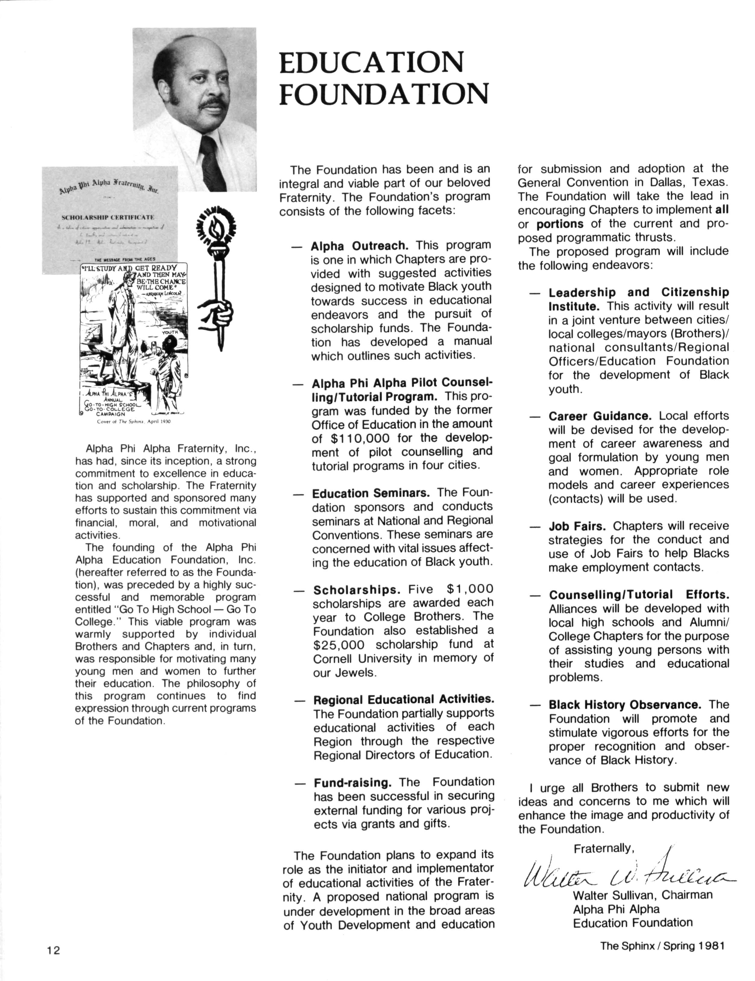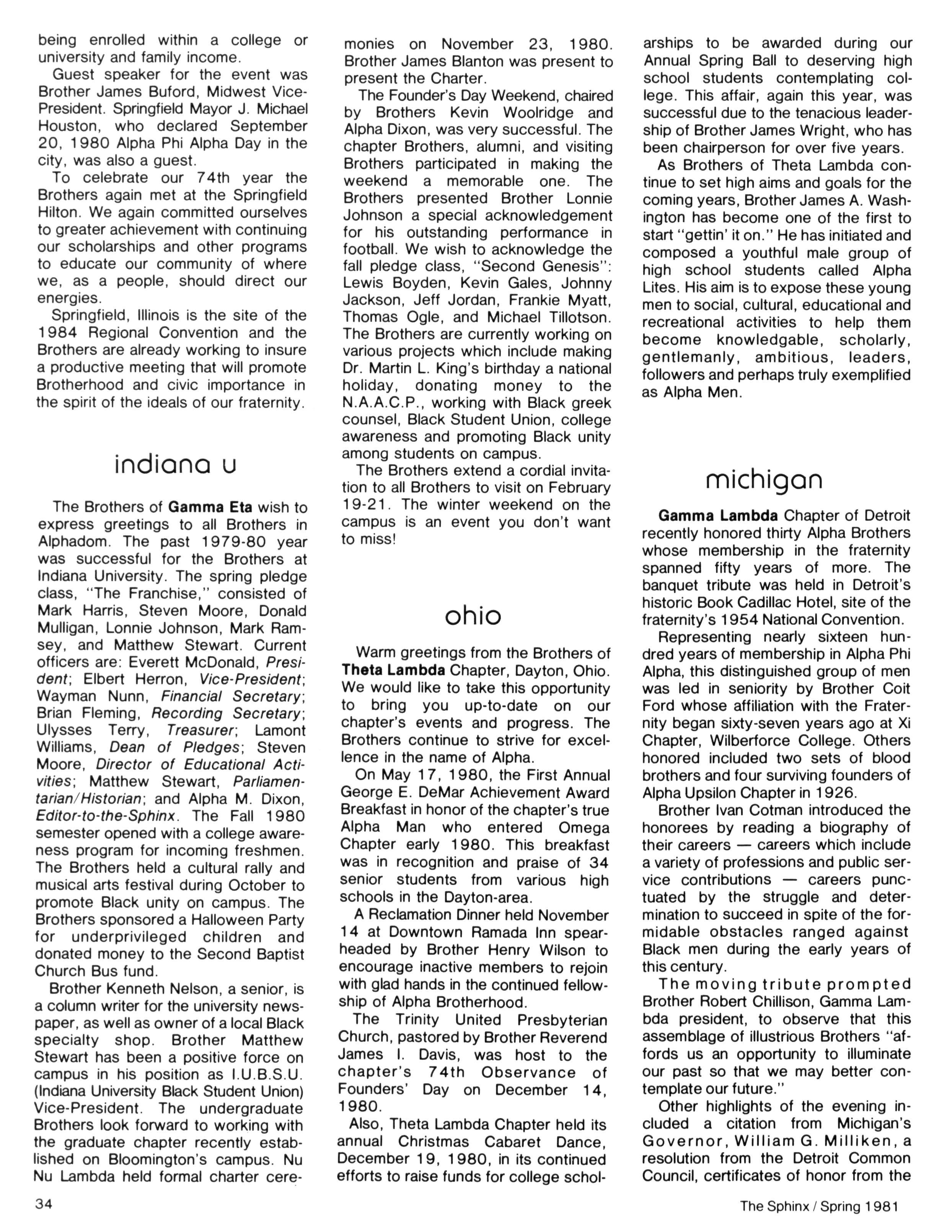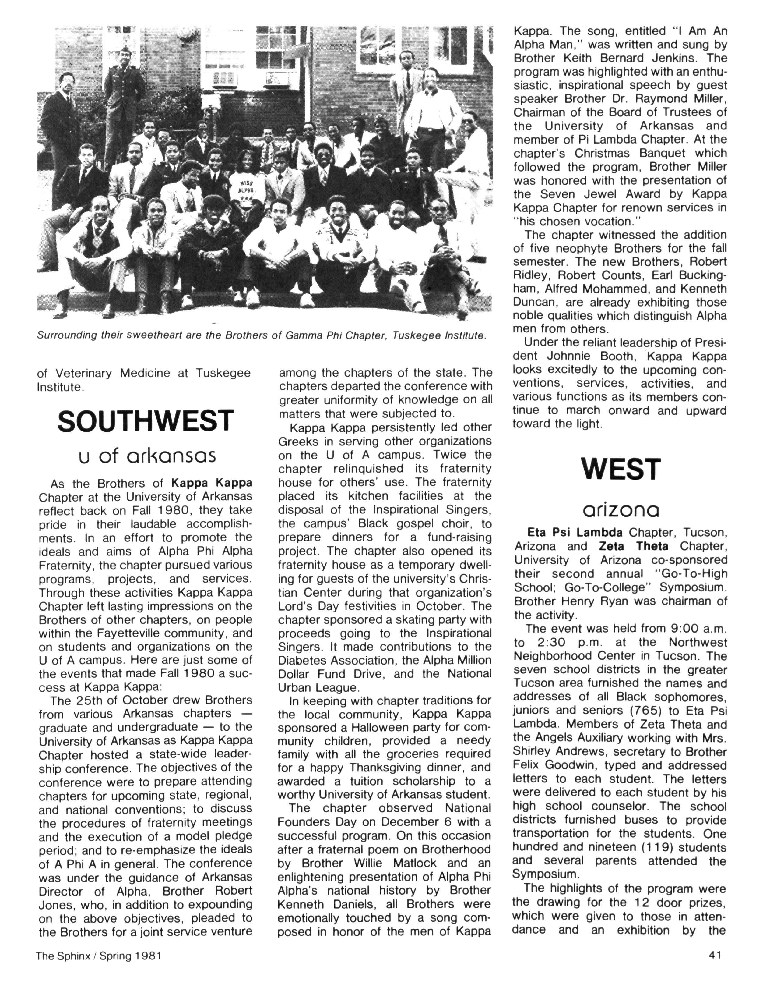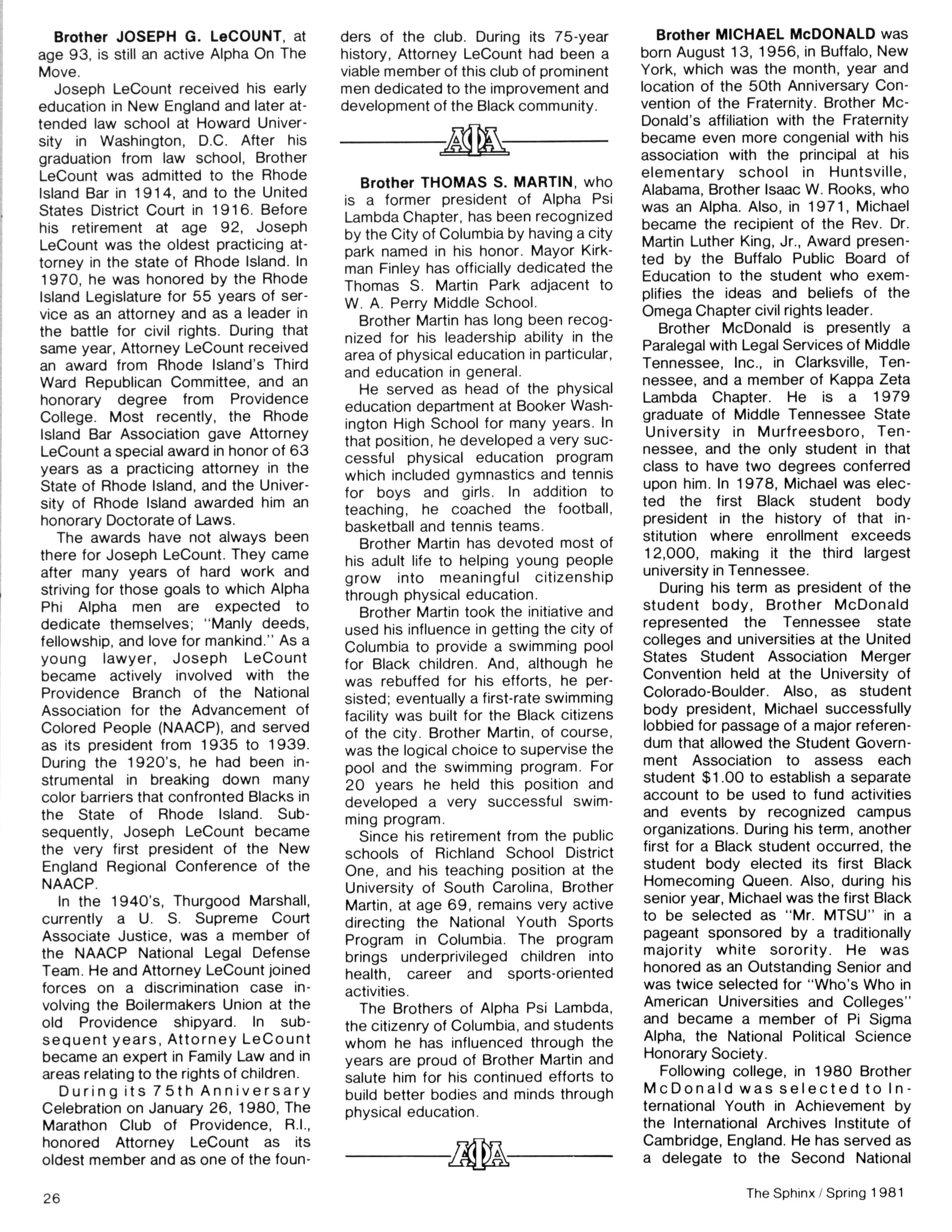 Greetings DID YOU PAY DUES IN SEPTEMBER? There has been a real concern among some Brothers who paid dues in the fall — and, yet, failed to receive the last two issues of The Sphinx. Let me remind you that our structure calls for pre-payment of dues for the upcoming fiscal year (which begins on January 1st) Thus all Brothers who paid possess the Diamond Jubilee passcard and will receive four (4) issues of The Sphinx — beginning with this issue and culminating with Winter 1981.. Our cover story is a magnificent feature by former Publications Chairman HANLEY J NORMENT Brother Norment (on behalf of The Sphinx) was one of the first journalists granted an interview with Secretary of Housing and Urban Development SAMUEL R PIERCE, JR In the flurry of activity following the Reagan inauguration, few toplevel officials were available for in-depth interviews; but Brother Pierce made time for Alpha This, according to the article, prompted one amazed HUD staffer to remark "The Secretary must think a lot of his Fraternity!" Credit, too, the quiet persistence of Brother Norment This article is "must" reading, shedding valuable light on another outstanding Brother of Alpha We must note, as does the article, that six (6) Blacks have thus far attained cabinet status in the executive branch of American government: Robert Weaver; Patricia Roberts Harris; Donald McHenry; and, three Alpha men, WILLIAM COLEMAN, JR.; ANDREW YOUNG; and Secretary PIERCE COMMENTARY:
