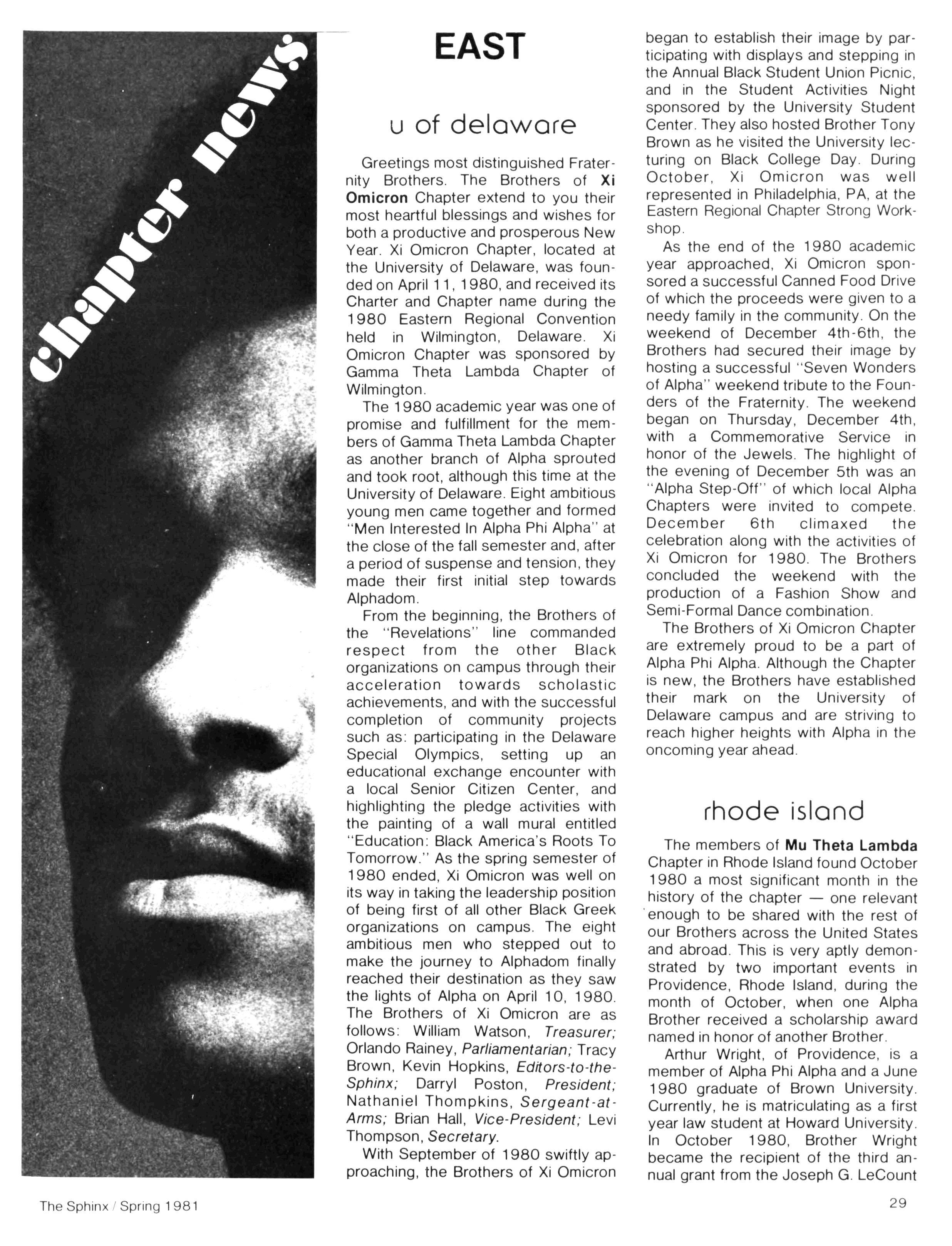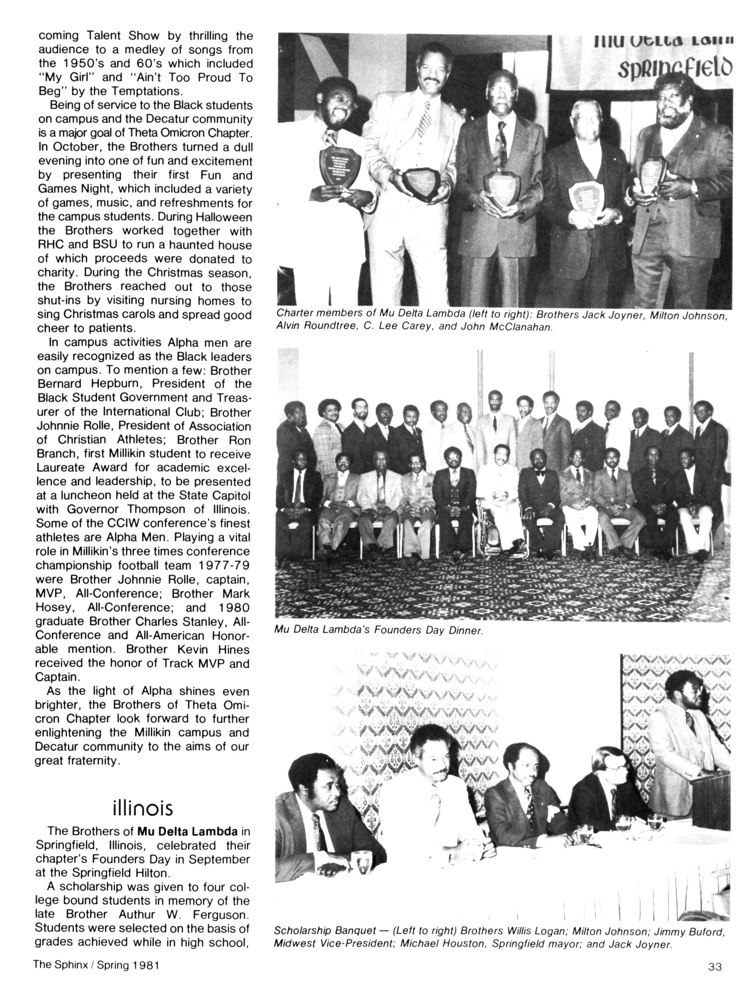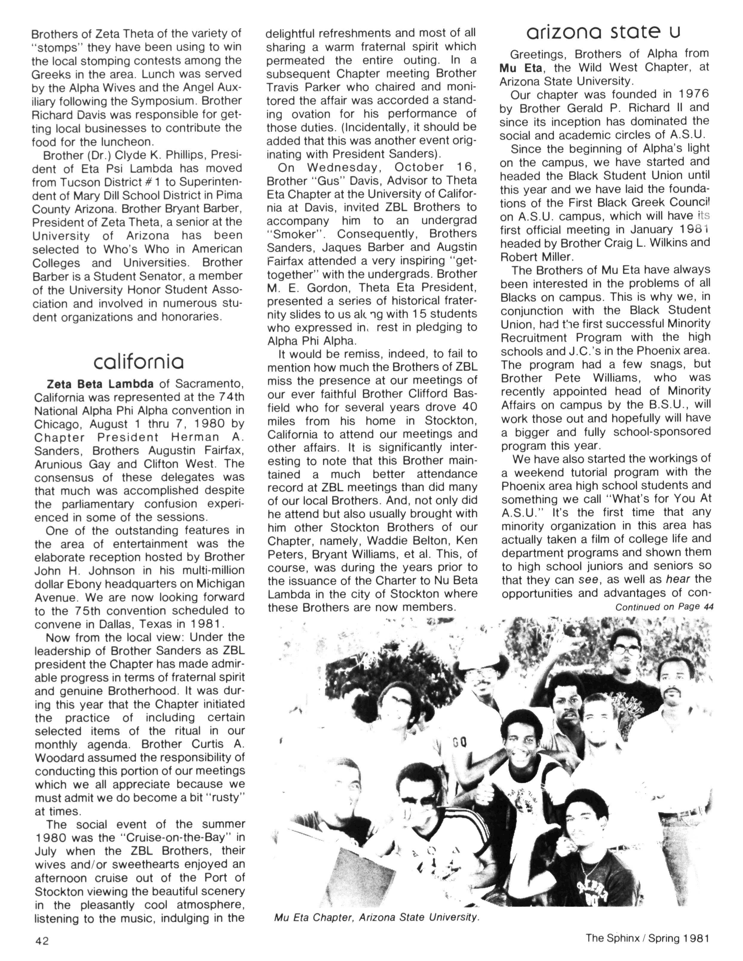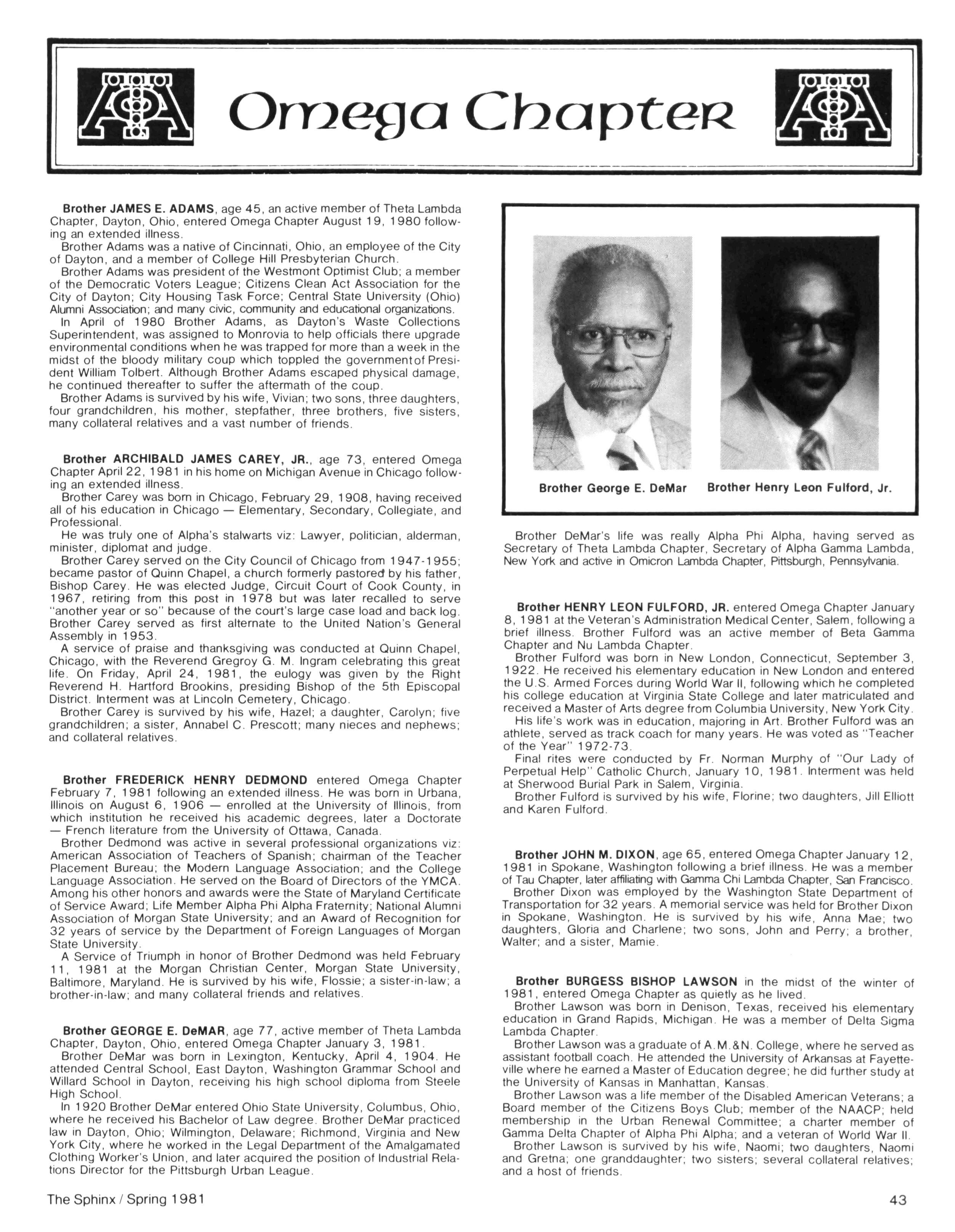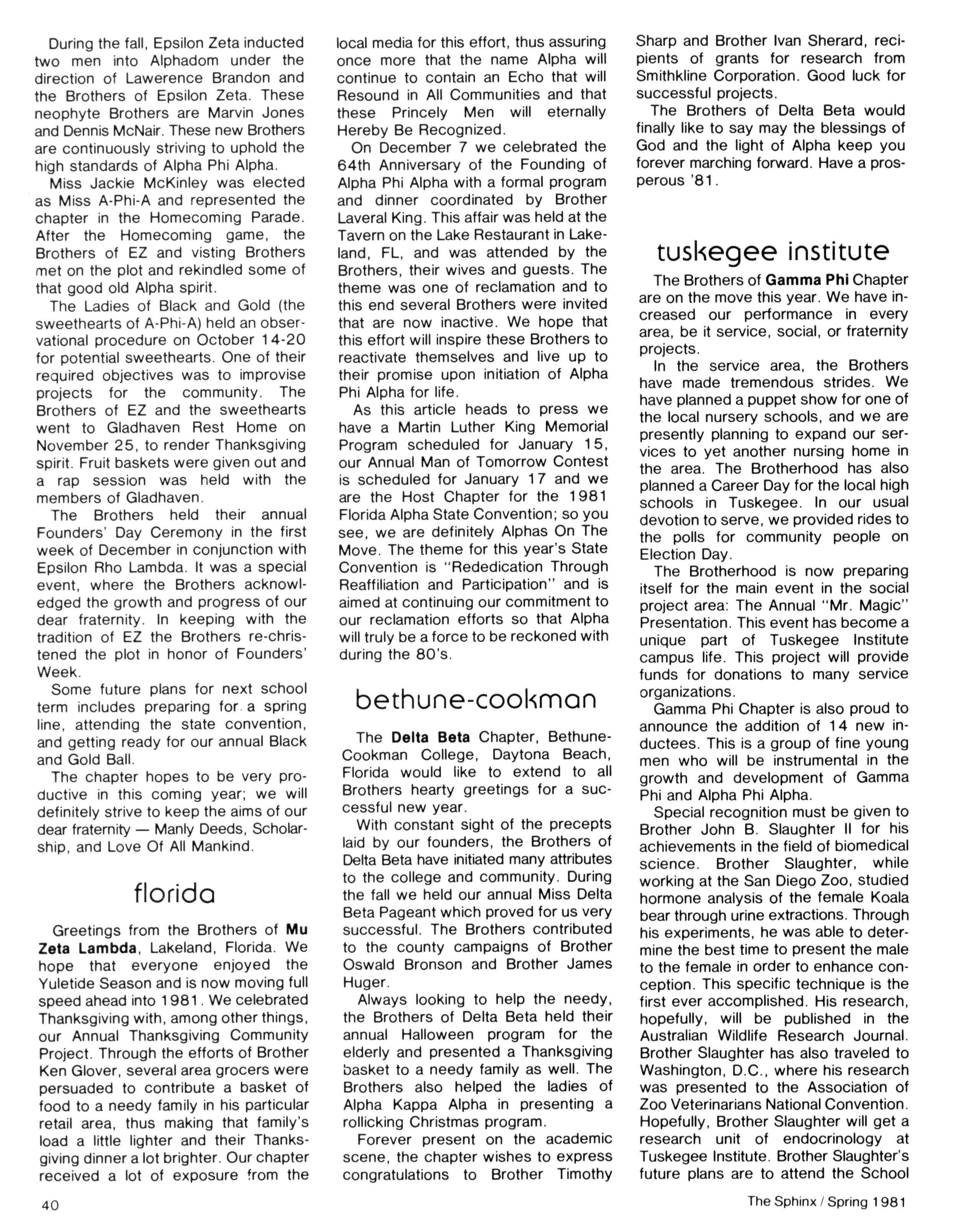 Greetings DID YOU PAY DUES IN SEPTEMBER? There has been a real concern among some Brothers who paid dues in the fall — and, yet, failed to receive the last two issues of The Sphinx. Let me remind you that our structure calls for pre-payment of dues for the upcoming fiscal year (which begins on January 1st) Thus all Brothers who paid possess the Diamond Jubilee passcard and will receive four (4) issues of The Sphinx — beginning with this issue and culminating with Winter 1981.. Our cover story is a magnificent feature by former Publications Chairman HANLEY J NORMENT Brother Norment (on behalf of The Sphinx) was one of the first journalists granted an interview with Secretary of Housing and Urban Development SAMUEL R PIERCE, JR In the flurry of activity following the Reagan inauguration, few toplevel officials were available for in-depth interviews; but Brother Pierce made time for Alpha This, according to the article, prompted one amazed HUD staffer to remark "The Secretary must think a lot of his Fraternity!" Credit, too, the quiet persistence of Brother Norment This article is "must" reading, shedding valuable light on another outstanding Brother of Alpha We must note, as does the article, that six (6) Blacks have thus far attained cabinet status in the executive branch of American government: Robert Weaver; Patricia Roberts Harris; Donald McHenry; and, three Alpha men, WILLIAM COLEMAN, JR.; ANDREW YOUNG; and Secretary PIERCE COMMENTARY:
