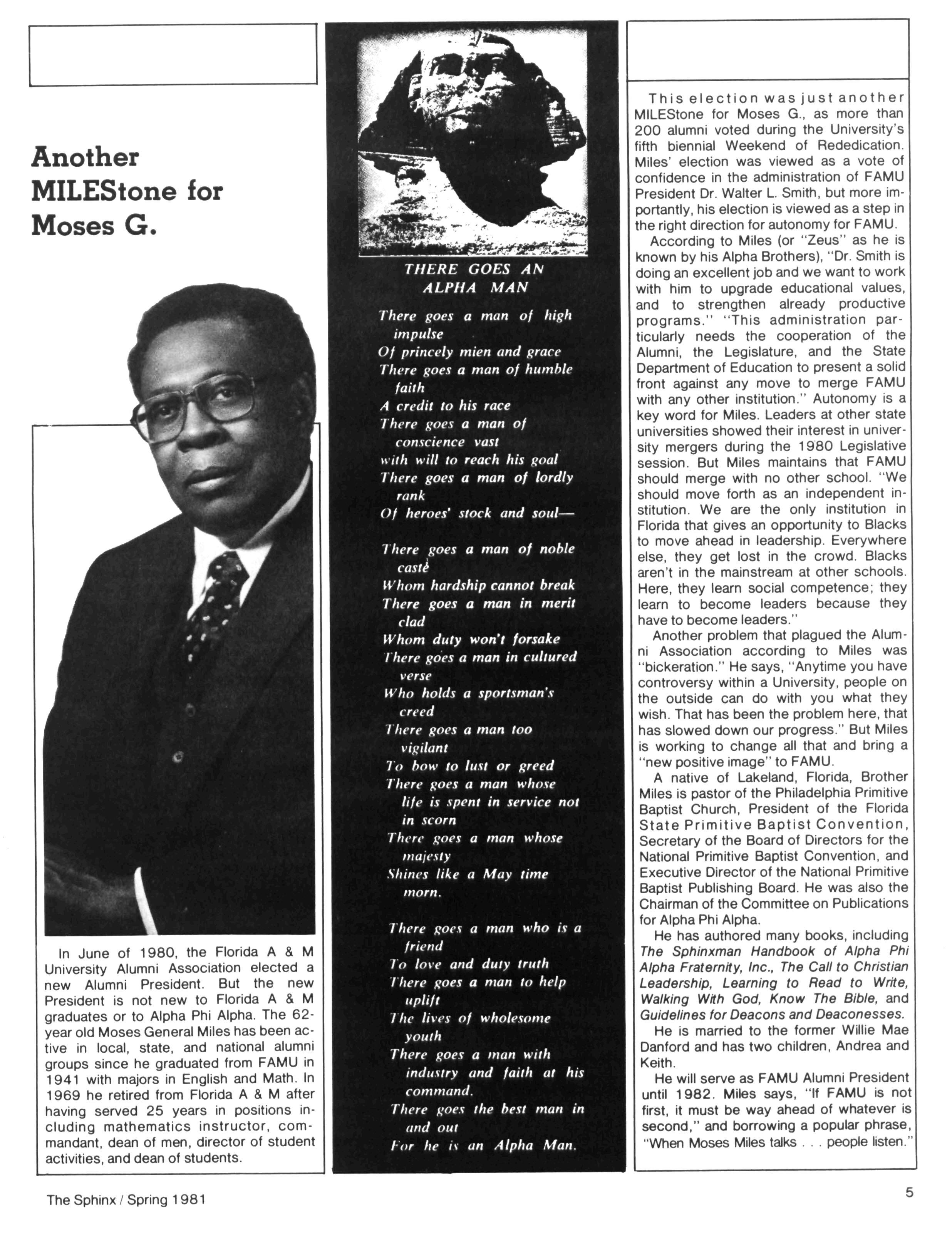 In June of 1980, the Florida A & M University Alumni Association elected a new Alumni President But the new President is not new to Florida A & M graduates or to Alpha Phi Alpha. The 62year old Moses General Miles hasbeenactive in local, state, and national alumni groups since he graduated from FAMU in 1941 with majors in English and Math In 1969 he retired from Florida A & M after having served 25 years in positions including mathematics instructor, commandant, dean of men, director of student activities,anddean of students.