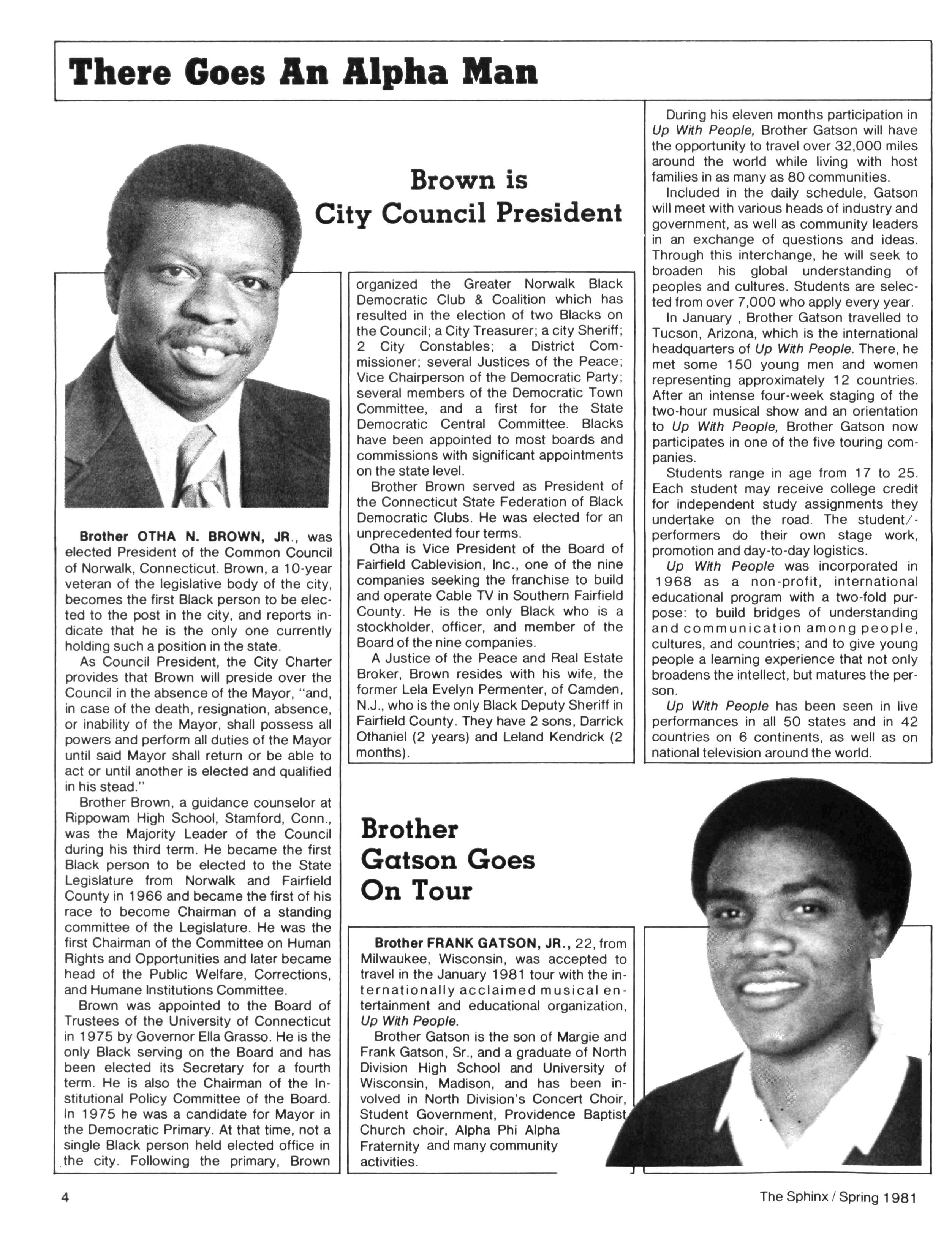 Brother FRANK GATSON, JR., 22,from Milwaukee, Wisconsin, was accepted to travel in the January 1981 tour with theinternationally acclaimed musical entertainment and educational organization, Up With People.