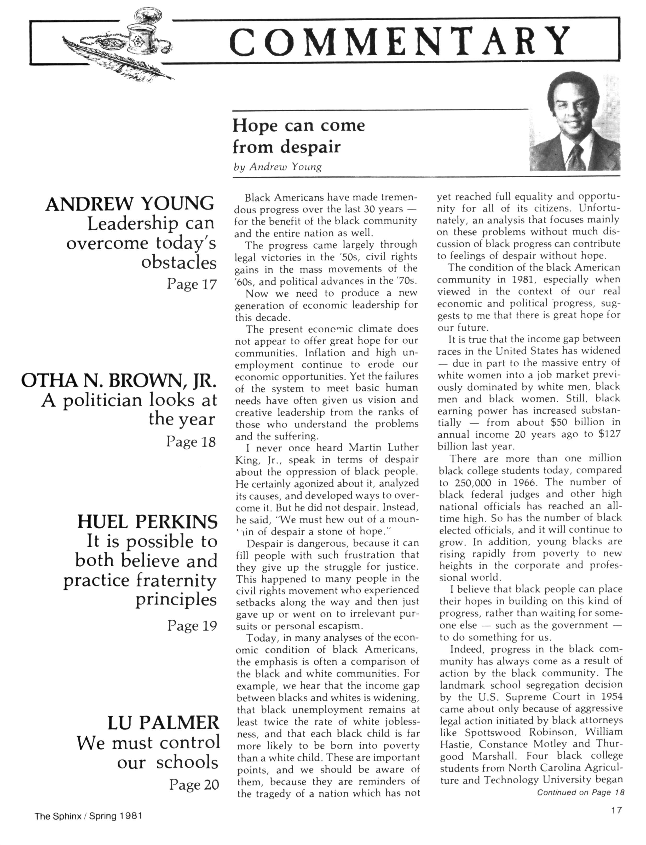 Unfortunately, we have been unable to attain a clear gauge of the Brother's reaction to the newly instituted Commentary section We must repeat our contention that, while we are certainly concerned with chapter activities and the accomplishments of Brothers, we deem this feature ESSENTIAL The Sphinx is in a unique position in that it reaches and has a personal identification with more leaders of Black America (present and future) than any other magazine Further, the state of the American press is becoming increasingly obvious; i.e., inaccuracies, out-and-out hoax, etc It should be clear to all that in such a climate (coupled with the right-wing mood of this nation) Blacks would be foolish to totally rely on the majority press for facts and/or opinion on critical issues A brief example would be a story which ran on Page 1of a major daily newspaper with the headline, "BLACK GHETTO SPREADS." Rather than documenting the growing desolation of this city's neighborhoods by an expanding Black populus, the article under this blaring headline was merely a rehash of Census Bureau statistics noting the growth of the city's Black population and the dispersion of this group into new neighborhoods — outside the clearly defined "ghetto" which had once restricted them An accompanying graphic included in this expanding "ghetto" a number of stable residential neighborhoods (primarily consisting of single family homes) with definite middle-class characteristics Economic and social conditions aside, however, the general public (especially the already frightened white population) was led to believe that the movement of Black folks into these neighborhoods transformed them into "ghettoes" — with all the connotations thereof Because of this situation, we are proud to bring articles of opinion to Brothers — from Brothers dedicated to "telling it like it is."
