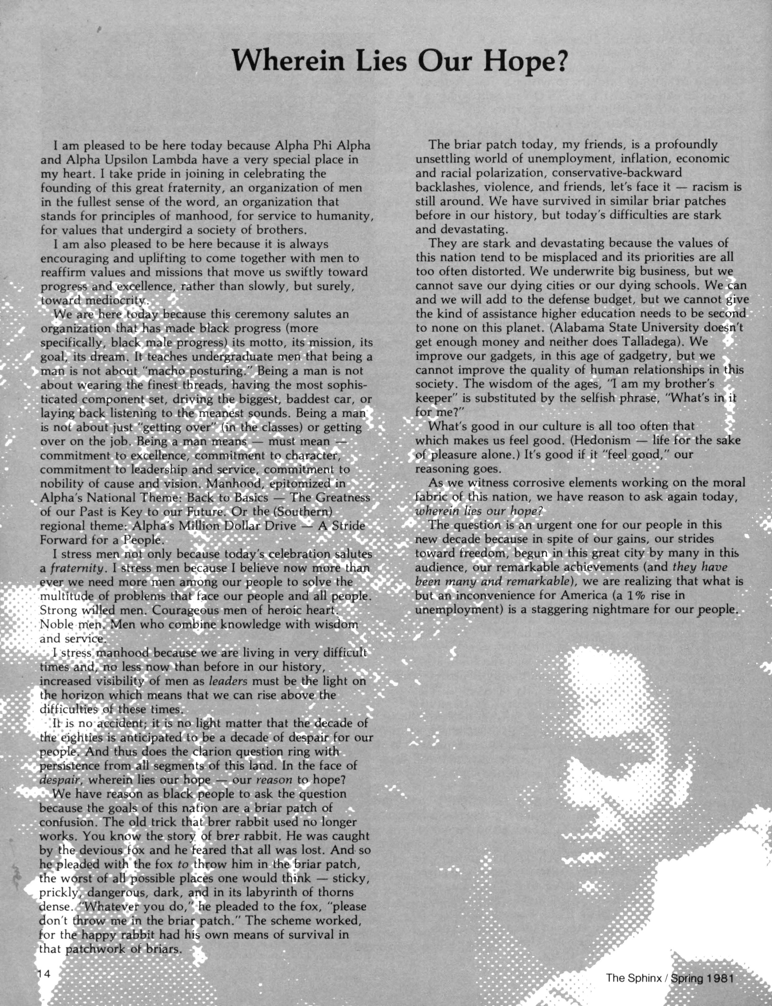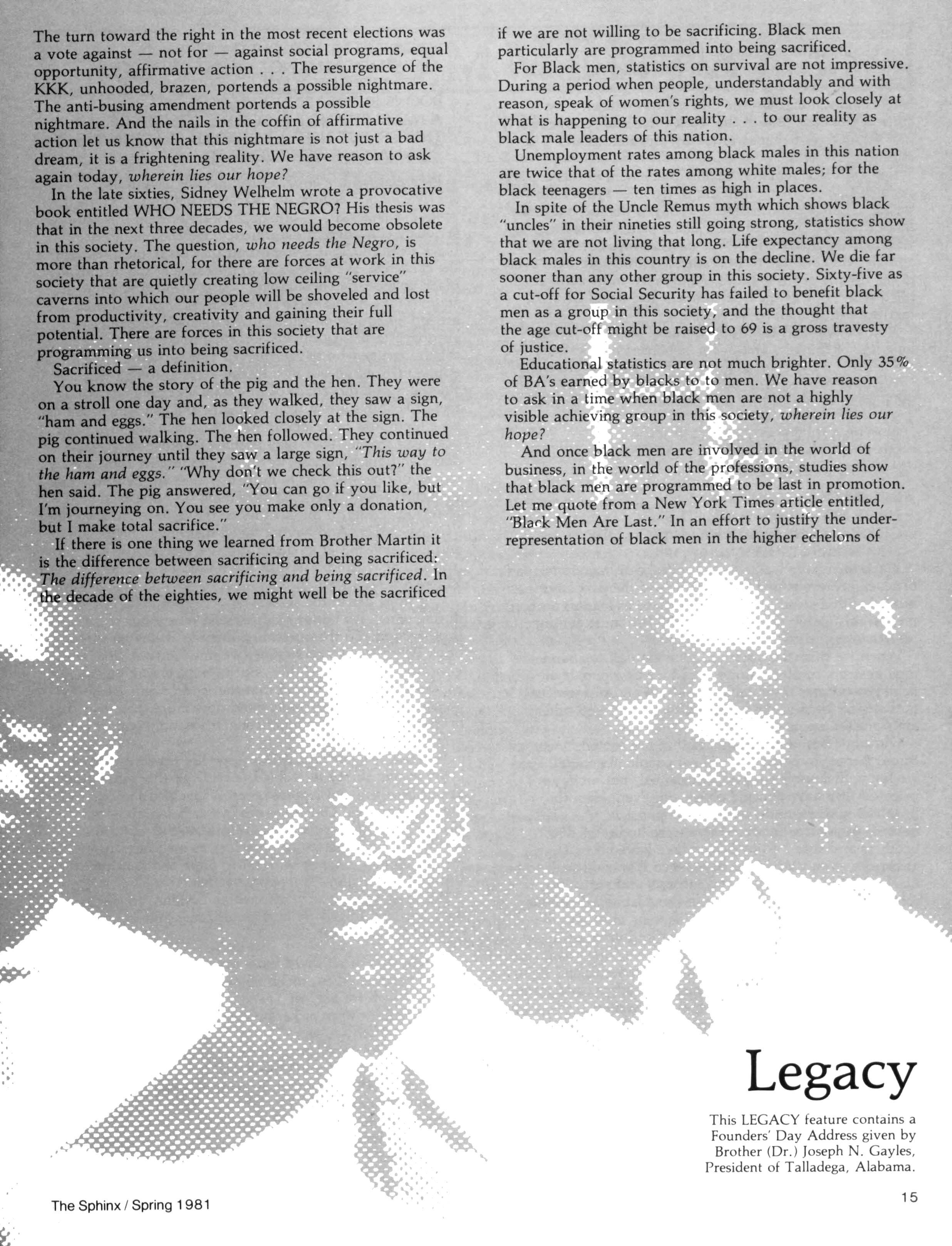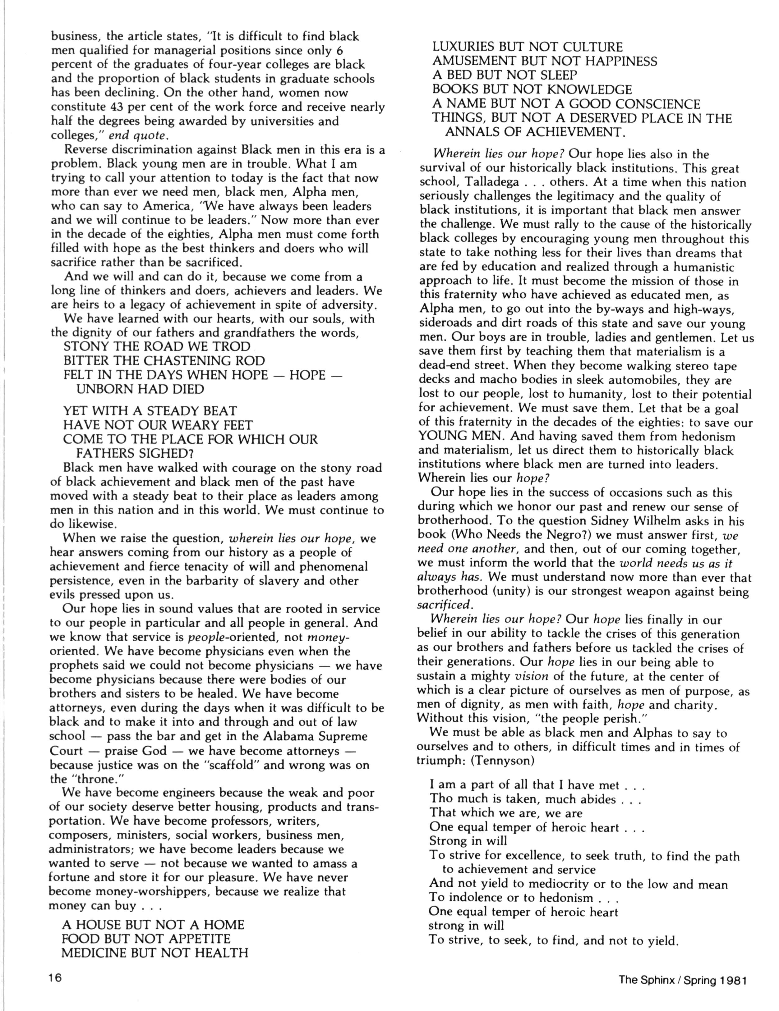 Brother WALTER SULLIVAN, Dean of Academic Affairs at Fort Valley State University (Georgia) and the new Chairman of the Alpha Phi Alpha Education Foundation, Inc., debuts in this issue with a regular column on the educational activities of the Fraternity and the Foundation An article of special interest to Fraternity members is included in this issue — reprinted from U.S. News & World Report. This feature, for the first time in a long time, gives the public a glimpse of the contributions being made to our people by those of us blessed with some education and success (albeit limited) Naturally, the article cites the Alpha Phi Alpha Million Dollar Fund Drive as one such example We urge you to continue your contributions to this worthwhile goal As a postscript we would note that four of the five men pictured in the article are Alphas, to wit: T M Alexander, Sr,; HUD Secretary Pierce; NIH Director John Slaughter; and Supreme Court Justice Marshall As Editor, I receive tons of speeches offered for reprint Each is read; but most would have limited impact in The Sphinx — mostly because of an extremely local slant or because the information contained therein has been recently carried Not so with the Founders Day Address given in 1980 by Brother JOSEPH GAYLES, President of Talladega College His address (and our Legacy feature) is a clarion call to the principles of Alpha Phi Alpha — especially appropriate in our 75th Anniversary year EVERYTHING YOU WANTED TO KNOW ABOUT "DALLAS"