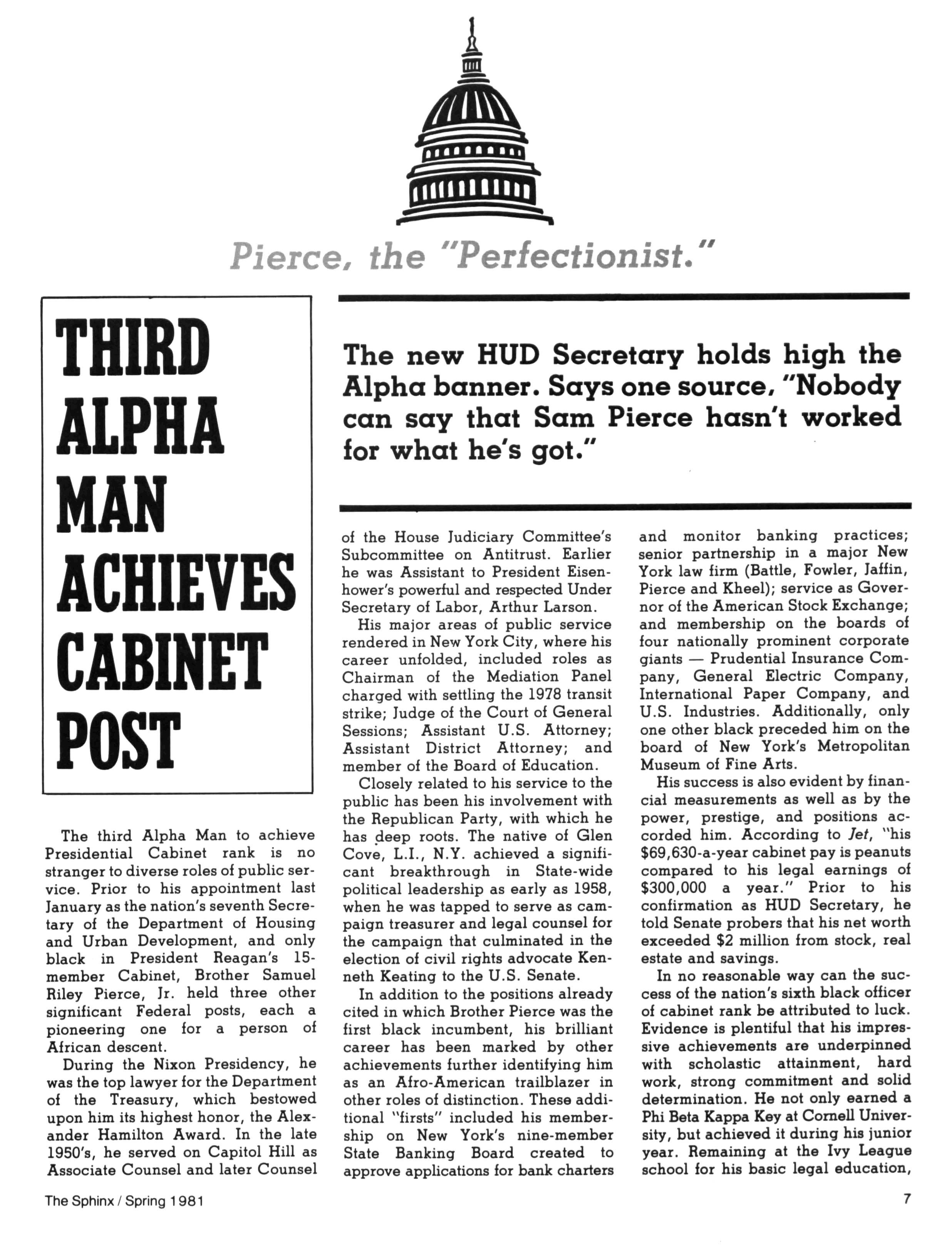 ABOUT THE COVER: Brother Samuel Pierce is the sixth Black (and the third Alpha) to attain federal cabinet rank
