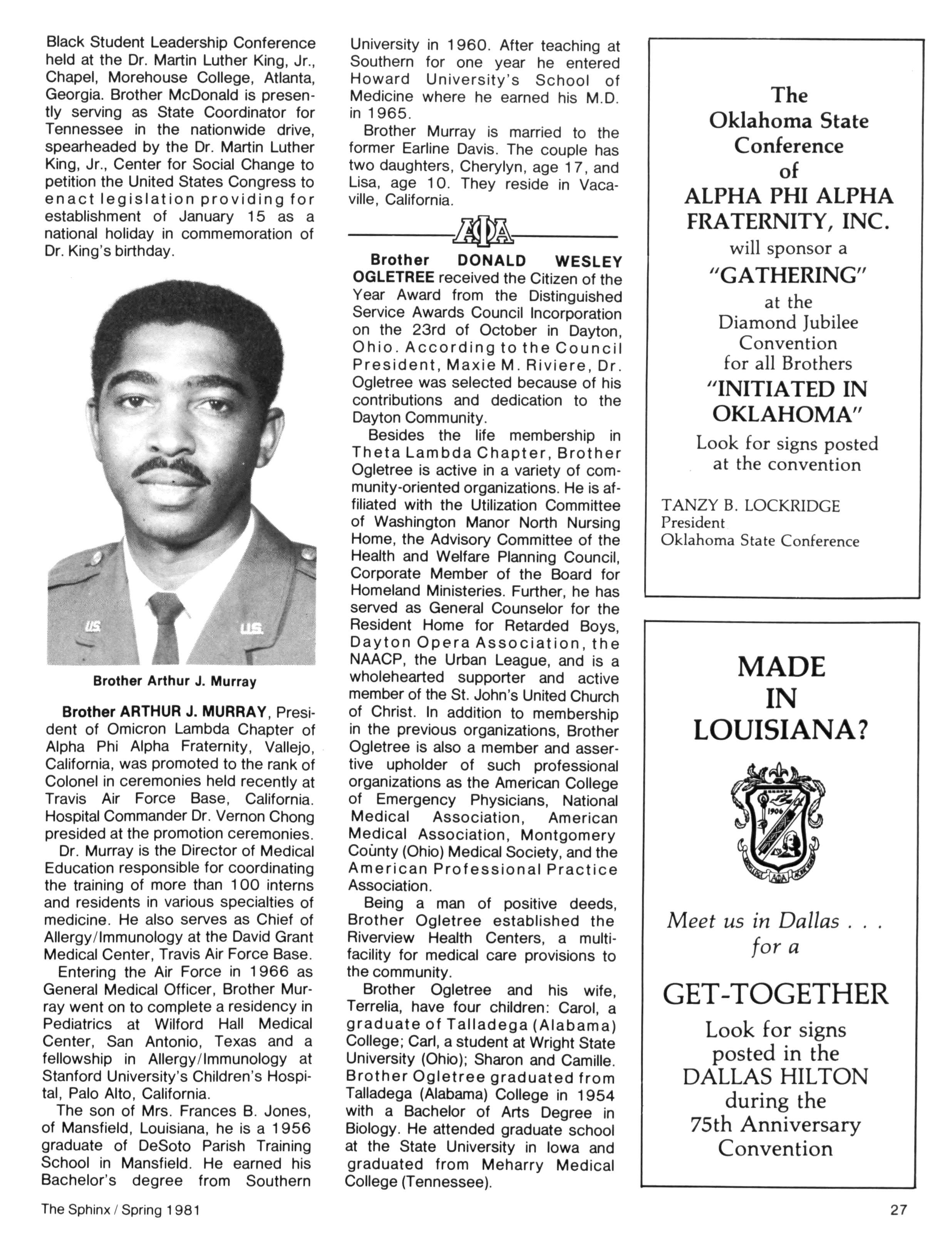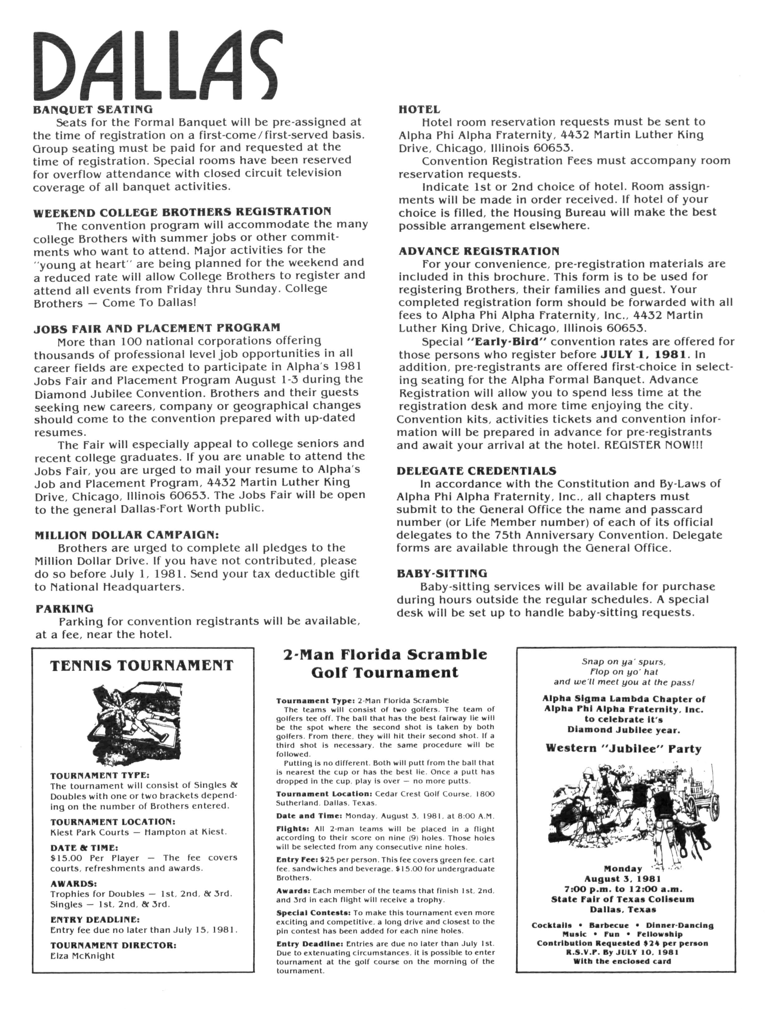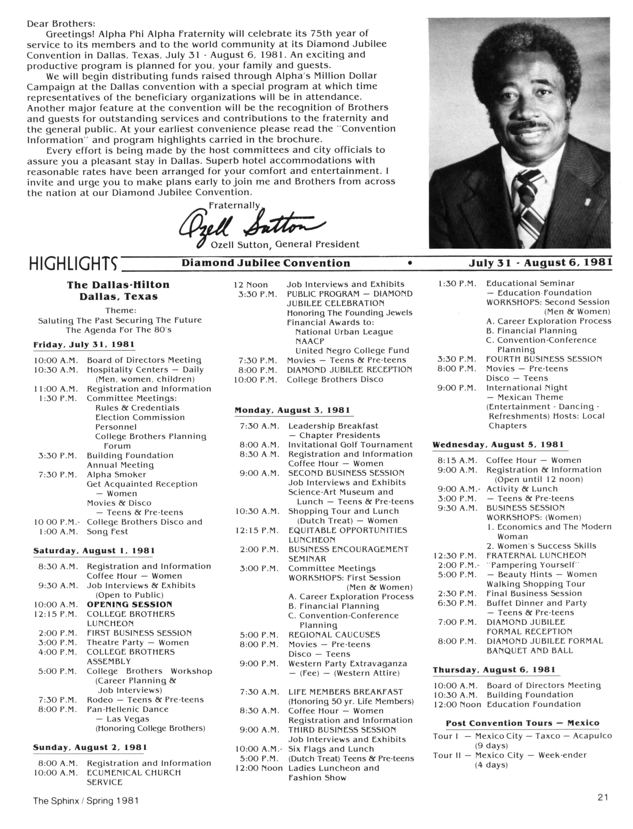 This issue is your personal invitation to the Diamond Jubilee Convention! Pages 22 thru 24 explore the "Happenings" in J R.'s city; "Highlights" of the convention program are given on Page 21; and, our special insert contains registration forms for the Convention (Brothers, Wives, and Children); the Hotels; the Golf and Tennis tournaments; as well as the host chapter's Western Extravaganza to be held at the State Fairgrounds Also, the Alpha Workshop section (Page 6) outlines Awards Procedures for those of you anxious to walk away from Dallas with trophy in hand; and, at least two states (Oklahoma and Louisiana) plan get-togethers for all Brothers who "crossed the sands" in their territory (see Page 27) If we forgot something LET US KNOW!!! In closing, we must pause to pay tribute to a dynamic Alpha Man who has recently joined Omega Chapter — Brother ARCHIBALD CAREY, JR. All Brothers are asked to take a moment to review the astounding career to this stalwart (see Omega Chapter) and join with his family and this nation in mourning his passing