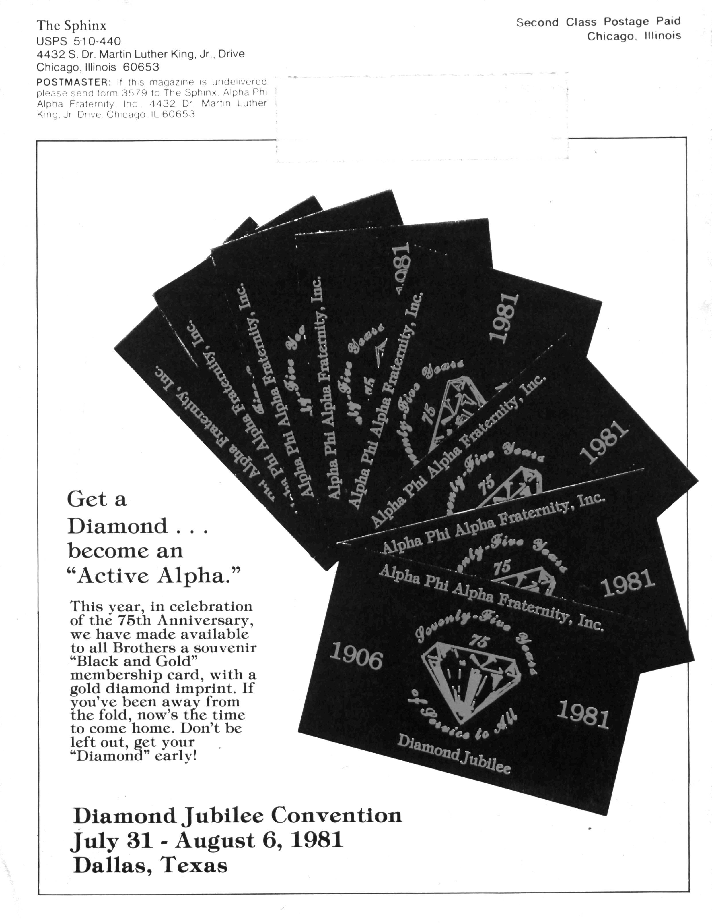 This is our Diamond Jubilee Year Our Jewels, 75 years ago, rose to the occasion and set in motion an instrument for mobilizing the best trained and most committed Black men for the fight for equality and justice That instrument is the Alpha Phi Alpha Fraternity Its goals have not changed As in 1906, the fraternity in 1981 will be about "Manly Deeds, Scholarship and Love for all Mankind."