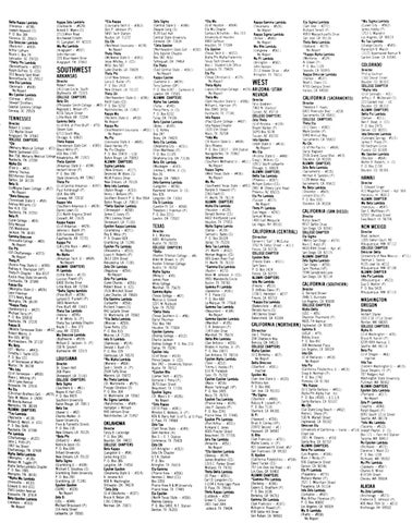 (Hayward - #700) Brian A. Conley (VP) 23972 S e c o n d - # 1 1 Hayward. CA 94542 XiRho (San Francisco - # 7 0 1 ) Walter Lovely. Jr. ( P ) 421 Leavenworth Street, #57 San Francisco, CA 99102 Xi Upsilon (California Polytechnic - # 7 0 4 ) David Tucker (CS) 757 Los Osos Val Road - #3 Los Osos, CA 93402 ALUMNI CHAPTERS •Gamma Phi U m b d a (Berkeley - # 1 8 6 ) Capers G Brad ham (P) P 0. Box 3238 Berkeley, CA 94703 Gamma Chi U m b d a (San Francisco - # 1 8 7 ) William H Powell (P) 438 Cedar Hill Drive San Rafael. CA 94903
