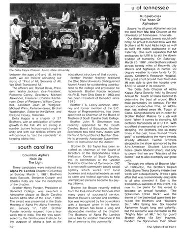 Savare! to all great Alphamen across the land from Mu lota Chapter at the University of Tennessee, Knoxville. Our distinguished Jewels would definitely be proud to behold how well the Brothers at Ml hold Alpha high as well as fulfill the noble aspirations of our fraternity. One such aspiration that Ml endeavors to fulfill is to aid the downtrodden of humanity. On Saturday, March 2 5 , 1 9 8 1 , nine Brothers trekked across twenty miles of Knoxville city streets and highways in humid, 9 0 degree weather to raise funds for St. Judes' Children's Research Hospital. This great effort proved most fruitful as Ml was able to give the hospital over $ 5 0 0 to assist in its research. The Delta Zeta Chapter of Alpha Kappa Alpha Sorority held its Second Annual Mr. Touch of Class Contest to determine the best all around Black male personality on campus. For the second consecutive time, an Alphaman has walked away Mr. Touch of Class. Congratulations are in order for Brother Robert Malone for a job well done. When it comes to stomping, Ml certainly transcends all at U.T.K. With excellent showmanship and precisionstepping, the Brothers, like so many times in the past, have claimed "more gold" to contribute to the many awards already attained. Twelve Brothers stepped in the show sponsored by the Afro-American Student Liberation Force (Black Student Union), not only to prove that we are "Masters of the Stomp" but to also exemplify our great unity. Through the efforts of Brother Marvin Haliburton, the Brothers helped Delta Sigma Theta Sorority initiate their week with a daiquiri party. It was a gala affair that was tremendously enjoyable to all who attended it. Due to the tremendous success of this event, it is now in the plans for this event to become an annual function. "The Sphinxmen Strike Back" was the theme of the basketball game held between the Brothers and "Salidaire Six," Mi's Spring line. Six hopeful Alphamen fought long and gallantly, but the outcome was inevitable as the "Mighty Men of M l , " led by guard Brother Alfred "Sir Sky" Haynes, handed the Sphinxmen their defeat The Sphinx/Fall 1981