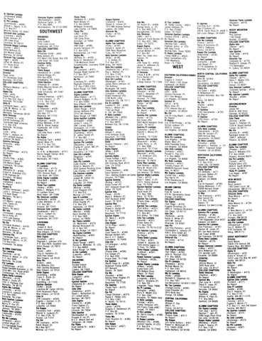 Theta Theta (McNeese St - #383) Kappa Epsilon Omicron Theta Lambda Mark Woods (P) (Cameron - #424) lota Mu XI Tau Lambda (Hayward- #619) Xi Upsilon Steven D Tolliver (P) P.O. Box 92849 (SF Austin St - #408) (N. Dallas County - #607) No Reporl (Cal Pofy-SLO #704) 7913 NW Andrew Avenue McNeese University George Davis, Jr. (P) James Gilleylen (P) Paul 0 Sullivan (P) Lawtdn. OK 73505 Lake Charles. LA 70609 P 0 Box 4953 27A P.O. Box 214362 ROCKY MOUNTAIN 200 N Sanlo Rosa St #608 D Omicron Nu Theta Phi Nacogdoches, TX 75762 Dallas. TX 75221 Director San Louis Obispo, CA 93401 (Tulsa-#719) (UNO - #395) Omicron Epsilon Lambda lota Omicron Phil Cochran No Report Juan Byrd IP) (Corpus Christi - #616) (SMU-#411) 1165 Drexel ALUMNI CHAPTERS 108 Carita Drive Falayrium Trone Burden (P) No Report Boulder, CO 80303 lota Nu Lambda Avondale. LA 70094 ALUMNI CHAPTERS P.O. Box 4251. SMU Omicron Chi Lambda COLLEGE CHAPTERS (Fresno - #513) Alpha Tau Lambda Theta Chi Dallas. TX 75275 (Wichita Falls - #632) Alpha lota Henry A Simmons (P) (Tulsa - #140) (NW State - #396) Kappa Sigma Freeman Johns. Jr. (CS) (Denver- #31) 1050 E Fallbrook Donald E. Butler (P) Jerome Sampson (P) (West Texas St - #436) 906 Sally Circle No Report Fresno, CA 93710 2304 West Woodrow P.O. Box 5232 Wichita Falls. Texas 76303 lota Upsilon Lemuel McNeil (P) Kappa Eta Lambda Tulsa. OK 74127 Nalchitoches. LA 71457 Pi Alpha Lambda (Utah State - #4161 P.O. Box 891 (Bakersheld #530) Beta Epsilon Lambda Kappa Mu (Texas A&M U - #634) No Report West Tex. State Univ. No Report (Boley - #1491 (Nicholls St - #430) Kevin Carreathers (ES) Omicron Tau Canyon, TX XI lota Lambda L. G. Ashley (S) Byron D. Henderson (P) 1100 Weatherly [Colorado St - #725) MuNu (Camarillo #598) P.O Box 247 Bryan, TX 77803 Rexlord D. Canady (P) 1108 McGinnis Street (SW Texas St - #453) Jack Baugh (P) 715 Remington Donaldsonville, Louisiana 70346 Boley, OK 74829 James D Jefferson (S) 31716 Saddletree Dr Beta Eta Lambda Ft Collins, CO 80524 Kappa Nu 4831 Seabreeze WEST Westlake, CA 91361 Oklahoma City-#151) (SE Louisiana - #431) San Antonio. TX 78220 Roy L. Watson (P) Douglas Wade Cyprian (P) Pi Omicron P.O Box 11105 NORTH CENTRAL CALIFORNIA J L U . M H I C H ' P T E R S P.O Box 3917 (Texas A & M - #743) SOUTHERN CALIFORNIA/HAWAII Director Delta Psi Lambda Oklahoma City. OK 73136 Hammond, LA 70402 Terris Burton (P) Director (Denver - # 2 1 1 ) Beta Chi Lambda Allan M Gordon NuPsi P 0. Box 4061 Gregory G French (Muskogee-#165) Harry T. Waters (CS) Box 22817 (Louisiana St - #485) College Station. TX 77844 3757 West 113th Street James Henry Johnson (S) P 0. Box 2975 Sacramento, CA 95822 Reginald Chatman (P) 704 Anthony Inglewood. CA 90303 Denver, CO 80201 COLLEGE CHAPTERS P.O. Box 21902 (LSU) ALUMNI CHAPTERS Muskogee. OK 74403 COLLEGE CHAPTERS lota Omicron Lambda Theta Eta Baton Rouge. LA 70893 Alpha Eta Lambda Zeta Gamma Lambda Alpha Delia (Colorado Springs - #515) (UC-Davis #382) (Houston-#129) (Langston - #236) (USC - #26) ALUMNI CHAPTERS No Report Al Williamson (P) David L. Alexander (P) Robert Anderson (FS) Ulysses Plummer (P) Sigma Lambda Mu Upsilon Lambda Student Activities, Box 104 1505 Rosewood 5100 North Lottie 4511 Don Milagro (New Orleans- #117) (Boulder - #564) U.C. Houston, TX 77004 Oklahoma City, OK 73111 Los Angeles. CA 90008 Howard Rodgers, III (P) No Report Davis, CA 95616 Alpha Sigma Lambda Eta XI Lambda Gamma Xi PO. Box 53262 NuChi (Dallas #139) (Lawton-Ft, Sill #268) (UCLA - #79) ARIZONA/NEVADA New Orleans, LA 70153-3262 (Pacific - #484) No Report Henry L. Wilson (P) Mario Sims (p) Director Beta lota Lambda No Reporl Beta Tau Lambda 1156 Lee Road 3757 Veteran Ave # 2 (Baton Rouge - #153) James Hill Pi Gamma (Ft. Worth - #162) Ft. Sill, OK 73503 Los Angeles. CA 90034 Vernon Williams (FS) 8536 N. 45th Drive No Report PI Beta Lambda (CSU-Sacramento - #732) MuChl 2214-74th Avenue Glendale. AZ 85302 (Midwest City - #635) No Report Gamma Eta Lambda (Cal St-Long Beach - #462) Baton Rouge. LA 70807 COLLEGE CHAPTERS Terry Salmon (CS) Pi Epsilon (Austin-#173) No Report Delta Upsilon Lambda Zeta Theta P.O. Box 30035 (CSU-Chico - #734) Ken Grays (RS) PI Kappa Shreveport - #208) (Arizona - #339) Midwest City, OK 73140 No Report 5903 North Hampton Drive (Cal St-Northridge - #739) James C. Lean/ (T) Steven C Freeman (A) TEXAS Austin. TX 78723 Vernon Jackson (P) 2961 Looney Street 1228 N. Bryant Avenue Director ALUMNI CHAPTERS Gamma Pi Lambda 3828 S Stocker Shreveport, LA 71103 Tucson, AZ 85712 Zeta Beta Lambda (Galveston- #181) Los Angeles, CA 90008 Epsilon Kappa Lambda MuEta Elworth J. Wilcox (P) (Sacramento - #235) William F Jones (Grambling - #221) (Arizona St - #448) 4117-R Allan M Gordon (P) 4145 Simpson Drive ALUMNI CHAPTERS Dr. Jethro Terrell (P) Randolph Goode (S) 5940 Annrud Way Beaumonl. TX 77705 Galveston. TX 77550 Beta Psi Lambda P.O. Box 682 1508 E Jefferson Sacramento, CA 95822 COLLEGE CHAPTERS Gamma Tau Lambda (Los Angeles - #166) Grambling. LA 71245 Phoenix. AZ 85034 Nu Beta Lambda Delta (Beaumont #184) Walter West (P) Epsilon Psi Lambda (Stockton #569) James Perry. Jr, (P) (Huston-Tillotson - #4) 4600 Presidido Drive (Alexandria - #233) Benjamin J. Reddish, Jr (P) ALUMNI CHAPTERS P.O. Box 2568 No Report Los Angeles, CA 90008 Delta Tau Lambda Charles R. Joiner. MD (P) 5989 E. Freemont Street Beaumont. TX 77704 Alpha Sigma lota Zeta Lambda (Phoenix - #207) P 0. Box 5276 Stockton. CA CA 95205 Gamma Upsilon Lambda (Wiley - #39) (Compton - #507) Barry D Williams (CS) Alexandria. LA 71301 (Marshall - #185) No Reporl Russell E. Flye (CS) P.O Box 24269 Zeta Chi Lambda S. A Anderson (CS) NORTHERN CALIFORNIA Gamma Alpha P.O. Box 90692 Phoenix. Arizona 85074 (Bogalusa - #254) 114 Fisher Drive Director (Texas College - #67) Los Angeles, CA 90009 Eta Psi Lambda No Report Marshall, TX 75670 Reuben W. Miller Jr W Omar Karrlem (S) Mu Beta Lambda (Tucson - #277) Zeta Psi Lambda Oelta Rho Lambda PO Box 4153 205 Chimney Rock #515 (Honolulu - #547) Richard Davis (CS) (Lake Char