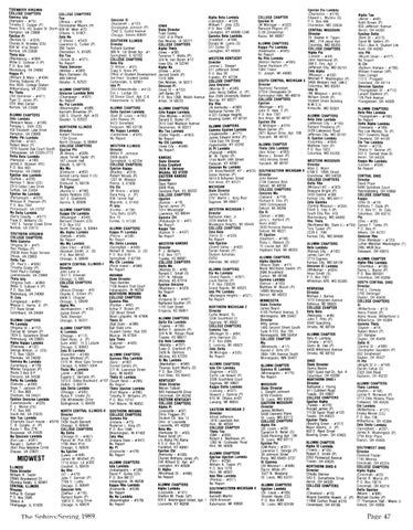 Alpha Tau (Akron - #40) Keith Brown (P) 933 Jeflerson Avenue Akron. OH 44302 Epsilon Delta (Kent S t - # 3 1 3 ) David M Sellers (P) KSU—Box A. Student Life Kent. OH 44243 lota Phi (Mount Union - #417) No Report XI Chi (Baldwin-Wallace - #706) William Freeman (VP) Dyke College 112 E Prospect Cleveland, OH 44114 Omicron Epsilon (Youngstown S t - #712) Lanard Stadlord (P) 126 Park Avenue Youngstown. OH 44505