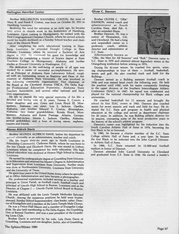 Brother OLIVER C. "Ollie" DAWSON, retired coach and a d m i n i s t r a t o r at S o u t h Carolina State, died Feb. 9, after an extended illness. Brother Dawson, 78, was a native of Thomaston, GA, and Cleveland. He had a long and unparalled career as a professor, coach, athletic director and adminstrator at S.C. State. Affectionately k n o w n as "Ollie, the Man for All Seasons" and "Bull," Dawson came to S.C. State in 1935 and attained almost legendary status at the Orangeburg institution before retiring in 1976. During his 41-year tenure, he coached five sports, winning championships in four of them — football, basketball, tennis and golf. He also coached track and field for the Bulldogs. Dawson served as a Bulldog assistant football coach in 1936 and was named head coach the following year. He held the position until 1950, with his teams consistently finishing in the upper division of the Southern Intercollegiate Athletic Conference (SIAC). In 1947, his squad was undefeated and played for the national championship for Black colleges and universities. He coached basketball for 11 seasons and brought the school its first SIAC crown in 1943. Dawson also coached tennis for seven seasons and track and field for four. He initiated the S.C. State golf program in health and physical education at the college and served as department chairman for 30 years. In addition, he was Bulldog athletic director for 16 seasons, overseeing some of the most productive years in the history of the school's athletic program. Dawson's career was highlighted by his induction into the South Carolina Athletic Hall of Fame in 1974, becoming the first Black to be so honored. In 1983, he became a charter member of the S.C. State College athletic Hall of Fame and, a year later, he became the first Black to be inducted into the John Carroll University Athletic Hall of Fame. In 1984, S.C. State renamed its 15,000 -seat football stadium in honor of Dawson. Dawson attended John Carroll University in Cleveland and graduated from S.S. State in 1936. He earned a master's