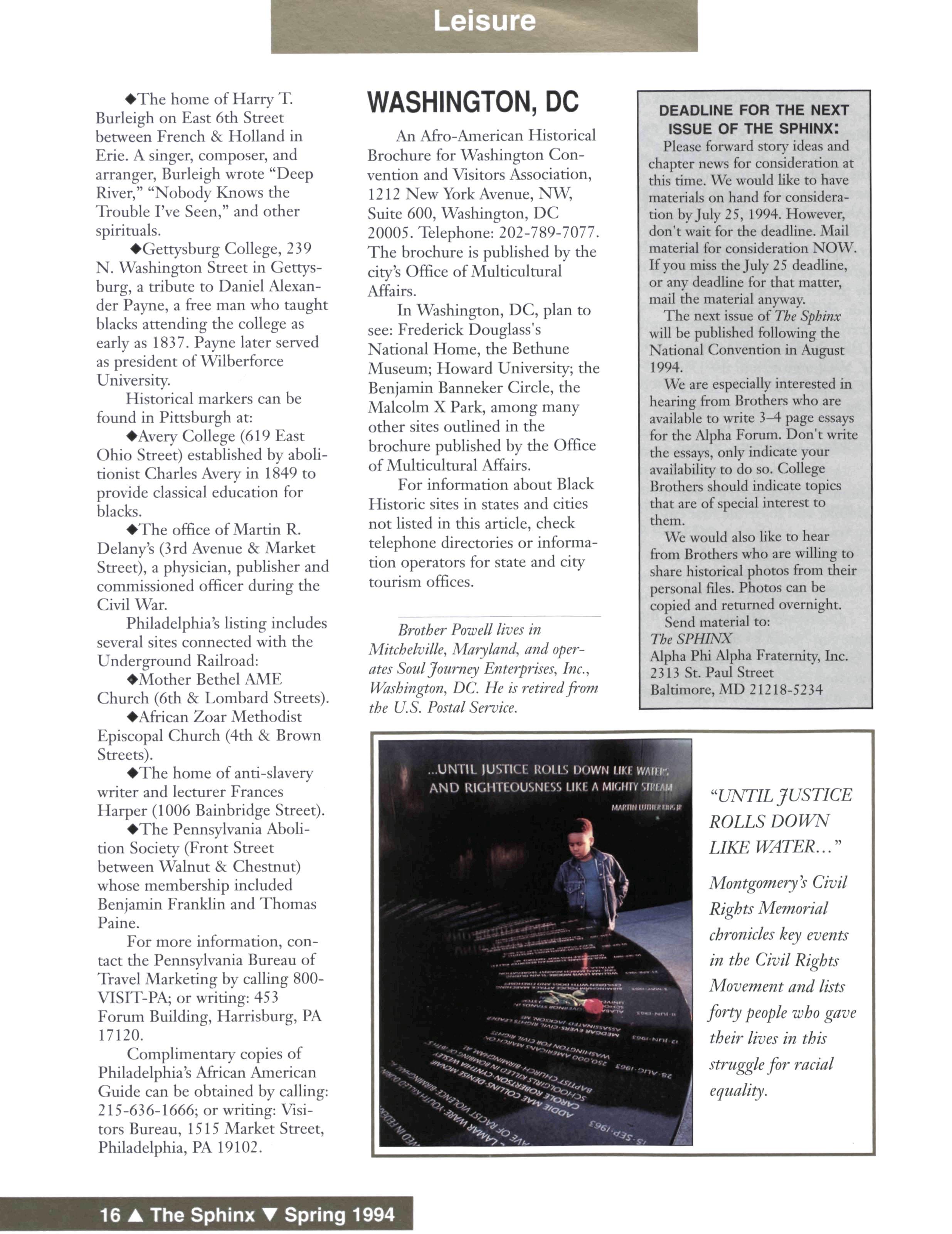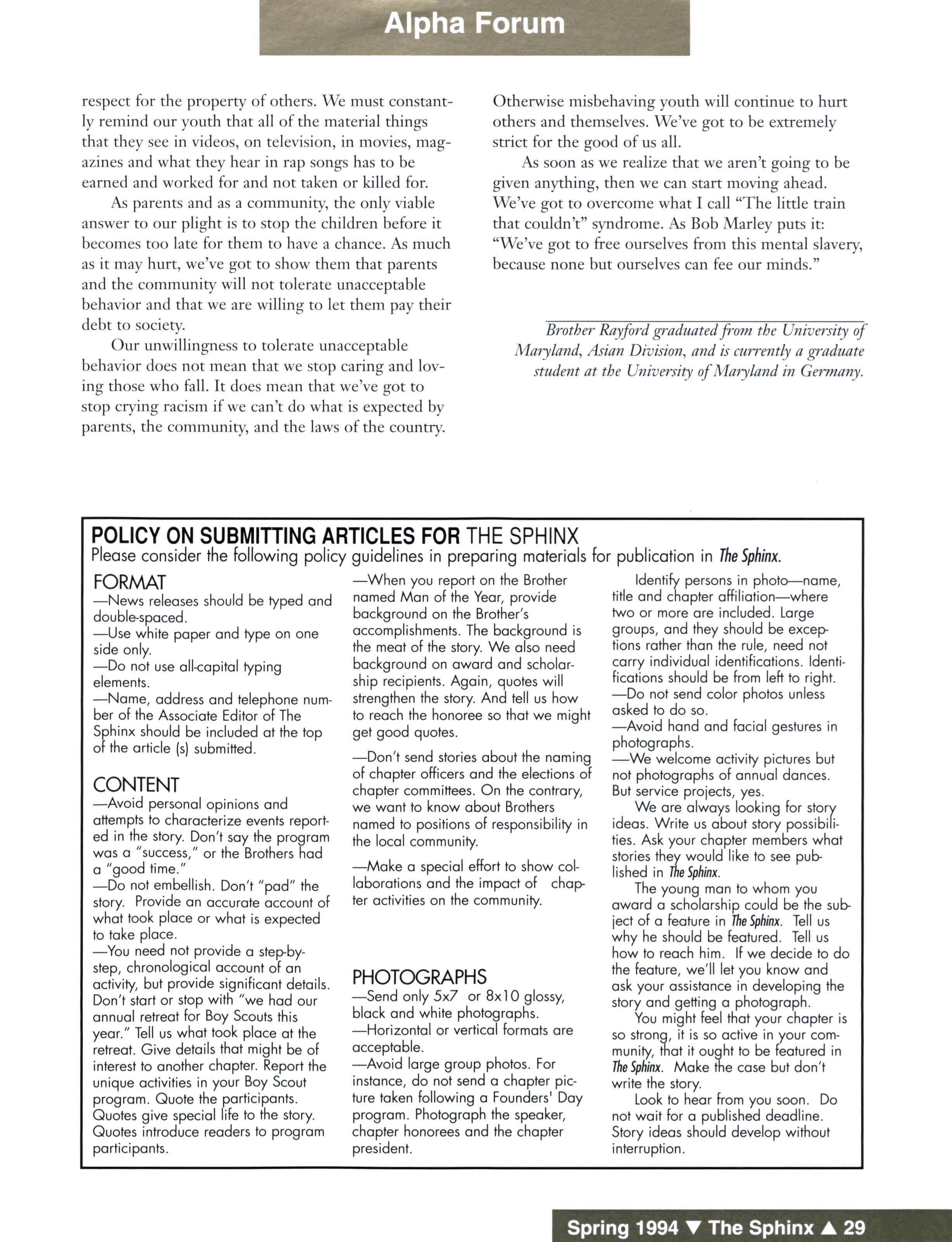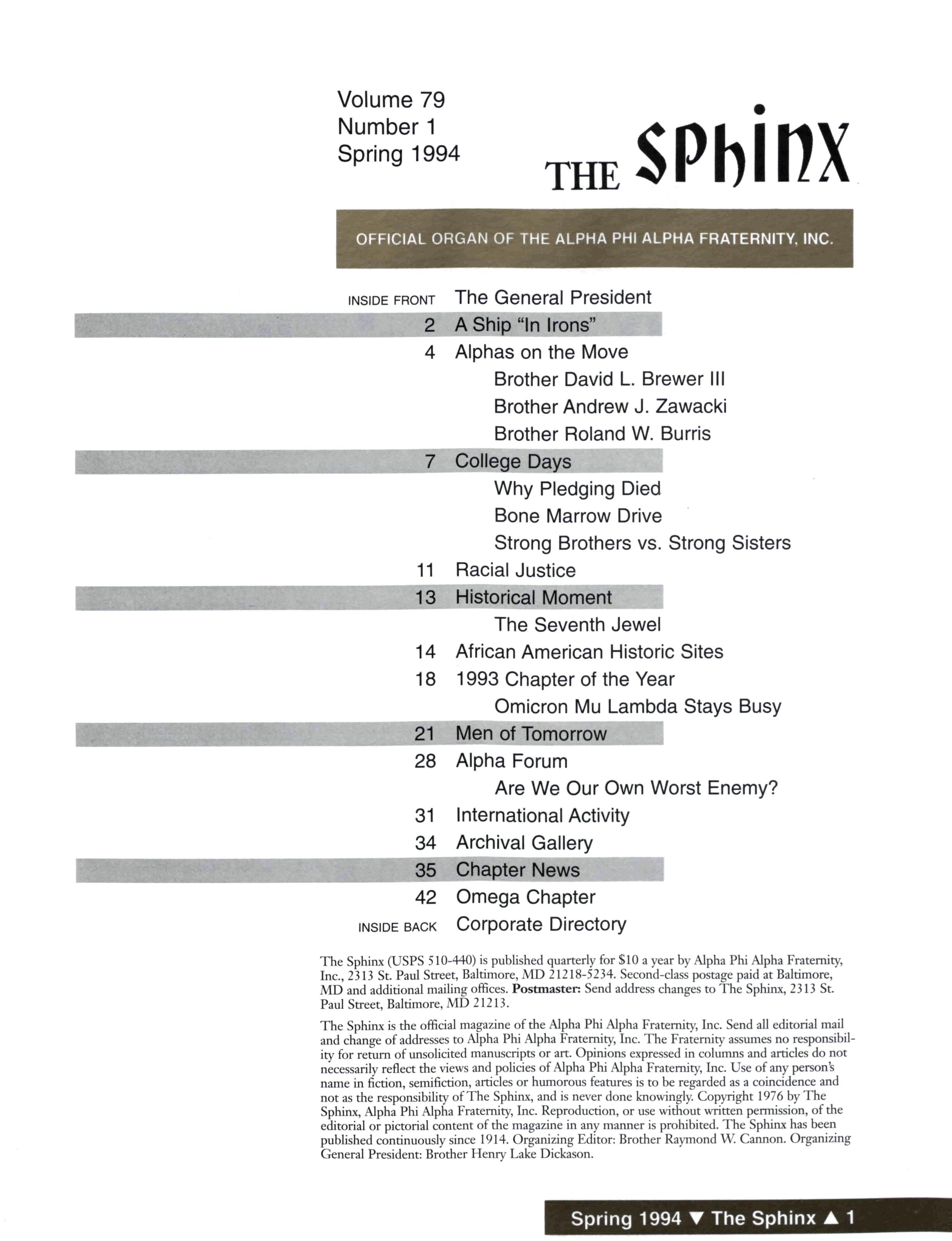 The Sphinx (USPS 510-440) is published quarterly for $10 a year by Alpha Phi Alpha Fraternity, Inc., 2313 St Paul Street, Baltimore, MD 21218-5234 Second-class postage paid at Baltimore, MD and additional mailing offices Postmaster: Send address changes to The Sphinx, 2313 St Paul Street, Baltimore, MD 21213