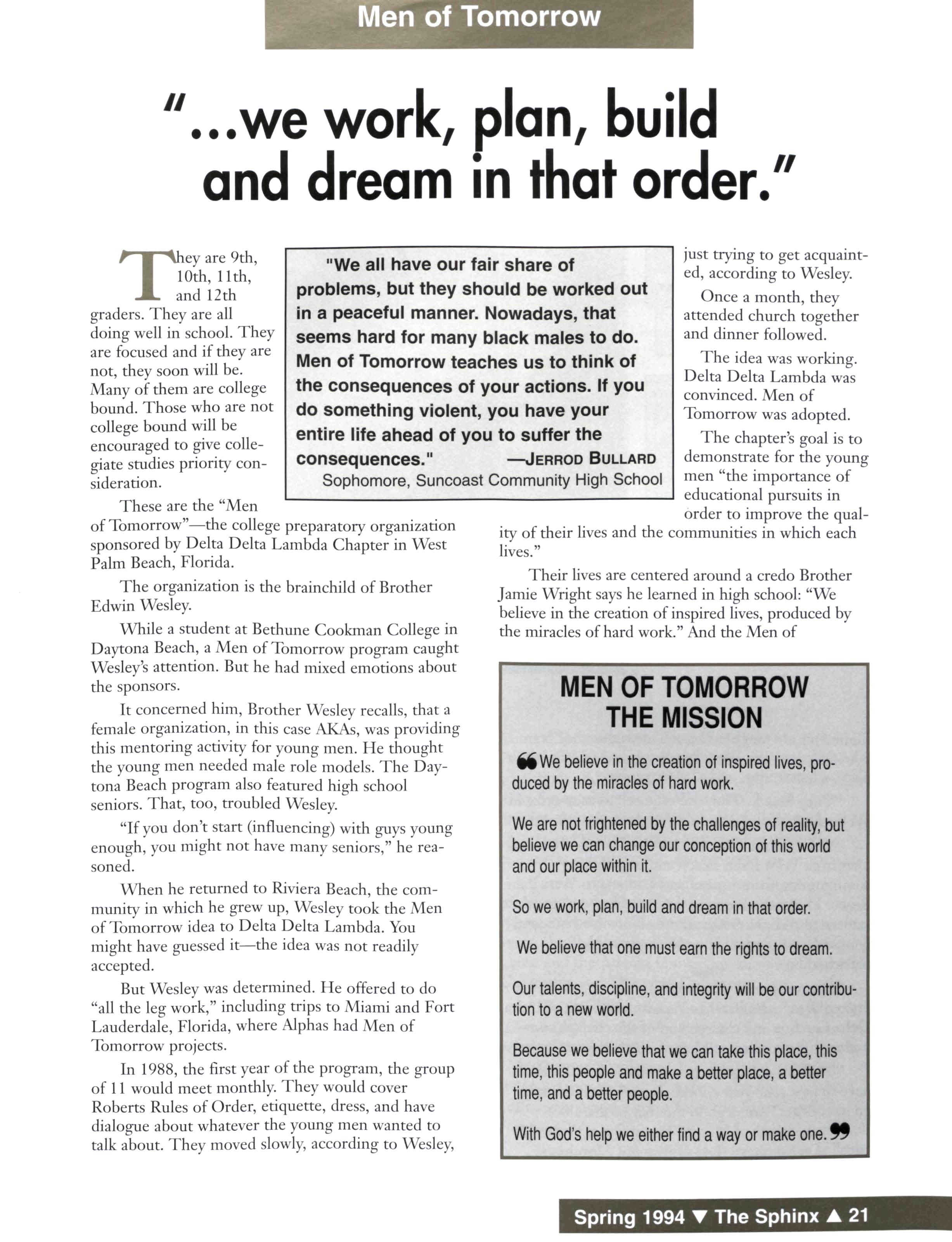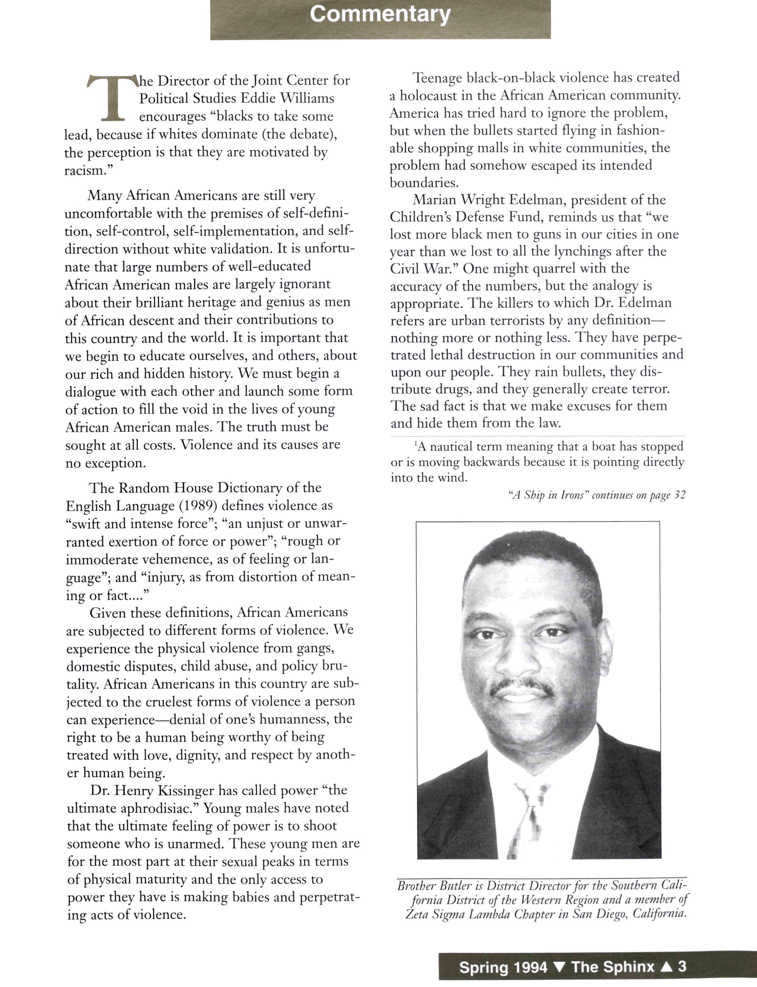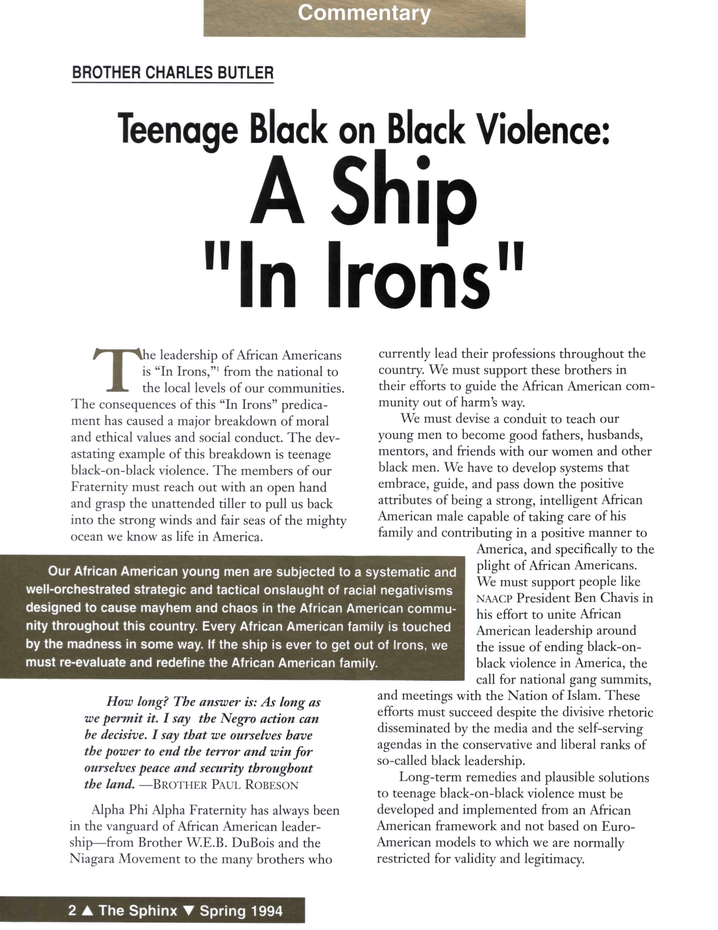 The consequences of this "In Irons" predicament has caused a major breakdown of moral and ethical values and social conduct. The devastating example of this breakdown is teenage black-on-black violence. The members of our Fraternity must reach out with an open hand and grasp the unattended tiller to pull us back into the strong winds and fair seas of the mighty ocean we know as life in America.