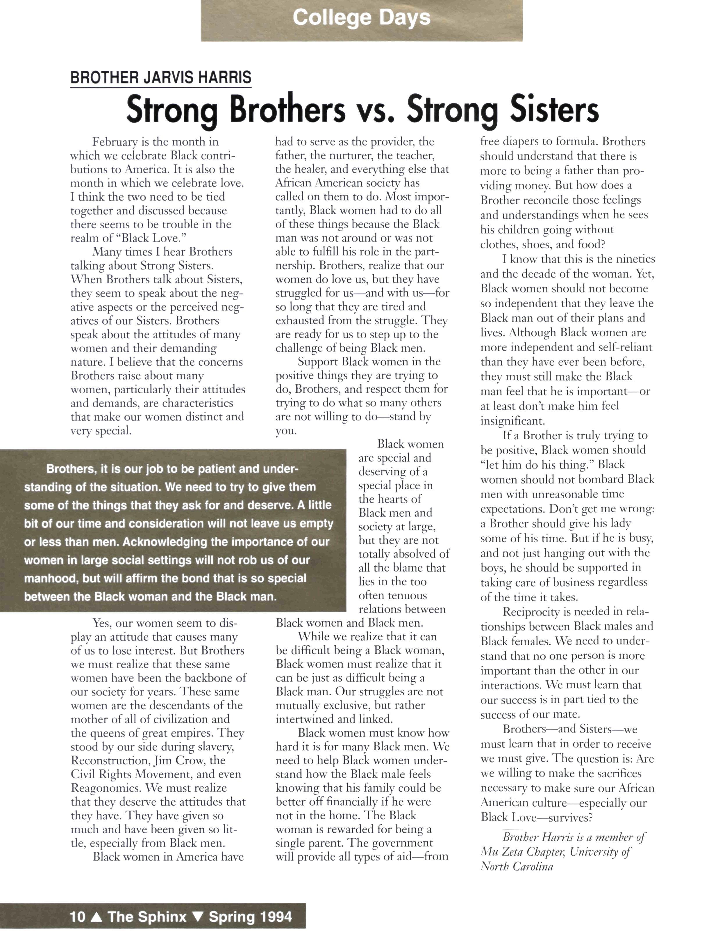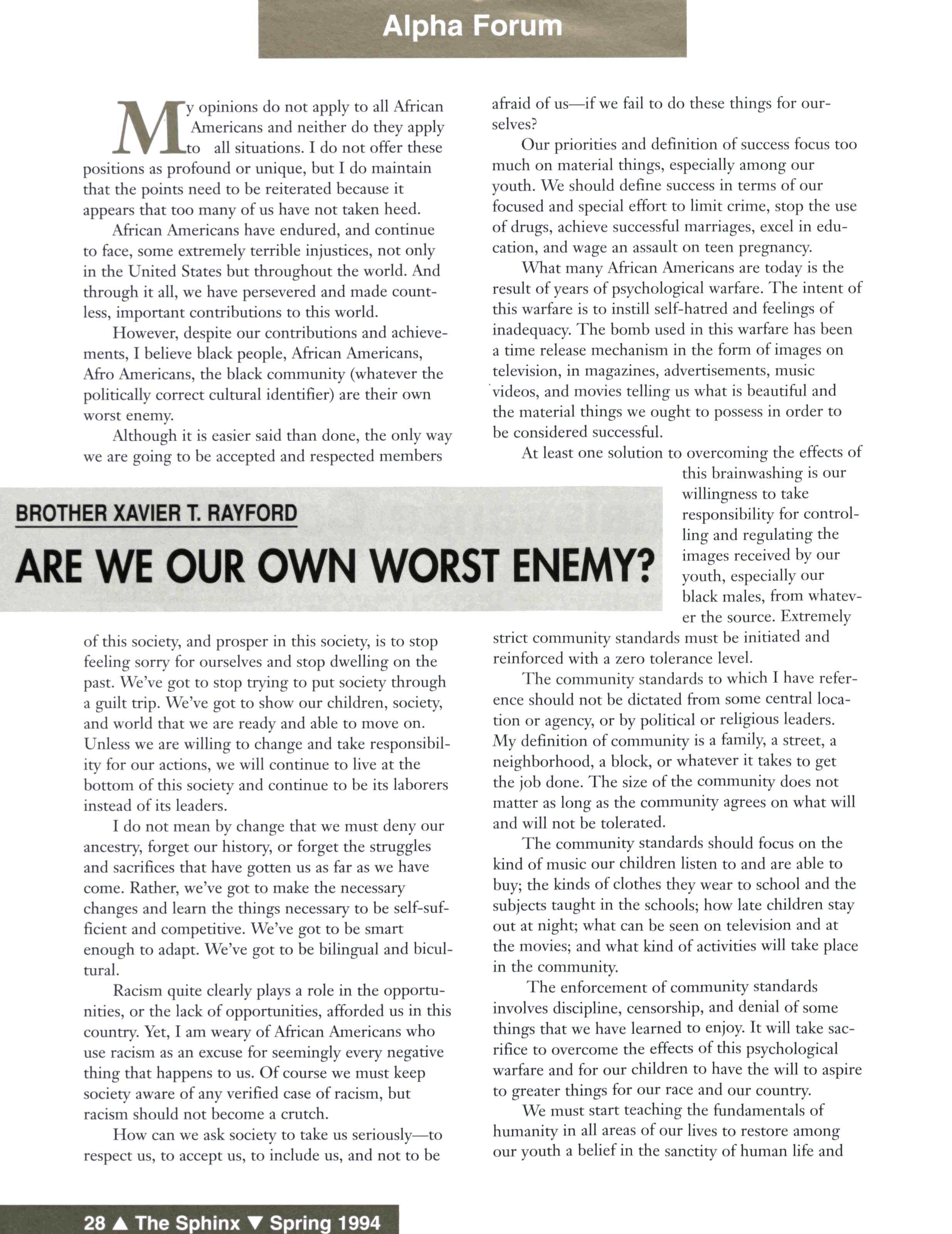 We must devise a conduit to teach our young men to become good fathers, husbands, mentors, and friends with our women and other black men We have to develop systems that embrace, guide, and pass down the positive attributes of being a strong, intelligent African American male capable of taking care of his family and contributing in a positive manner to America, and specifically to the plight of African Americans We must support people like NAACPPresident Ben Chavis in his effort to unite African American leadership around the issue of ending black-onblack violence in America, the call for national gang summits, and meetings with the Nation of Islam These efforts must succeed despite the divisive rhetoric disseminated by the media and the self-serving agendas in the conservative and liberal ranks of so-called black leadership