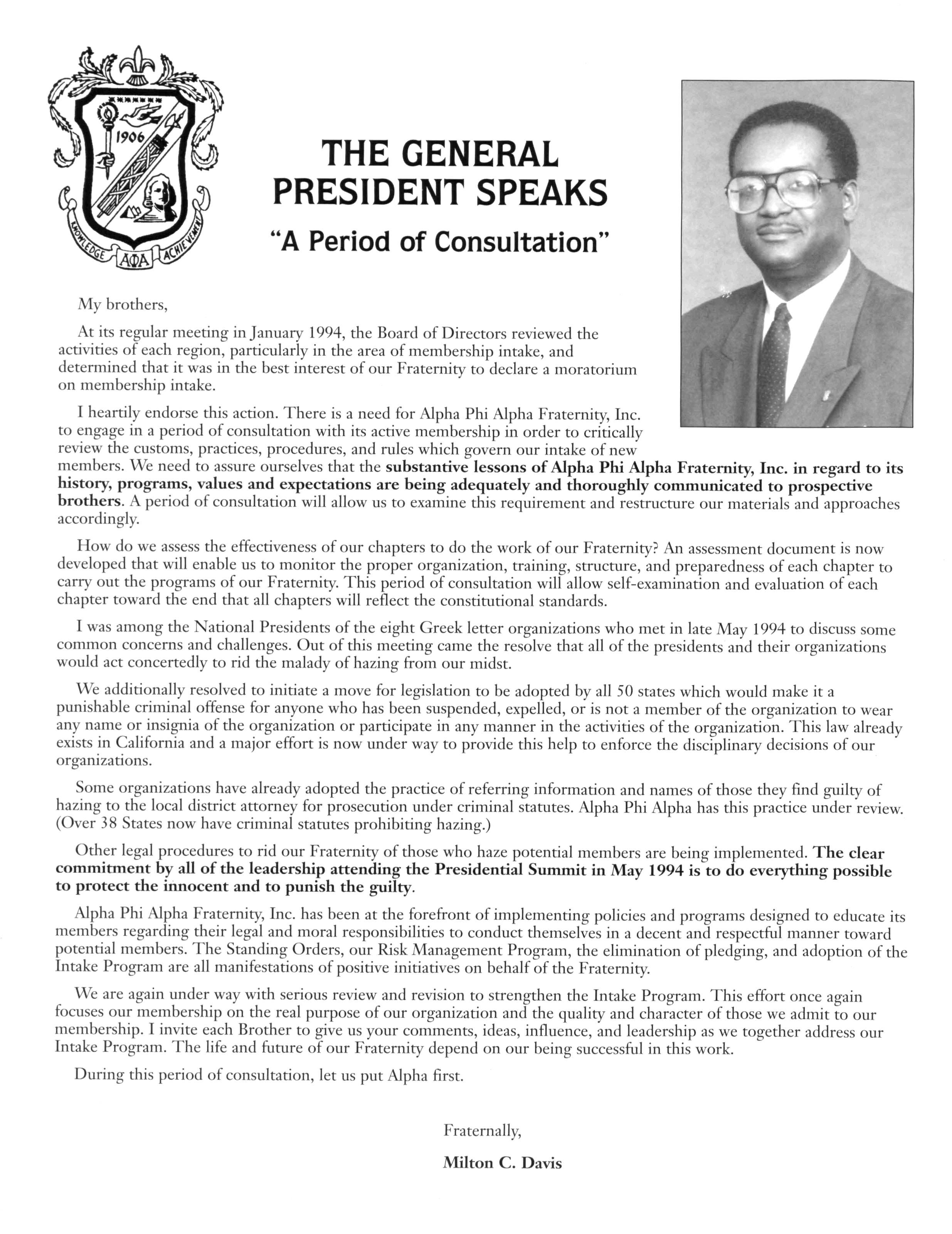 I heartily endorse this action There is a need for Alpha Phi Alpha Fraternity, Inc to engage in a period of consultation with its active membership in order to critically review the customs, practices, procedures, and rules which govern our intake of new members We need to assure ourselves that the substantive lessons of Alpha Phi Alpha Fraternity, Inc. in regard to its history, programs, values and expectations are being adequately and thoroughly communicated to prospective brothers. A period of consultation will allow us to examine this requirement and restructure our materials and approaches accordingly