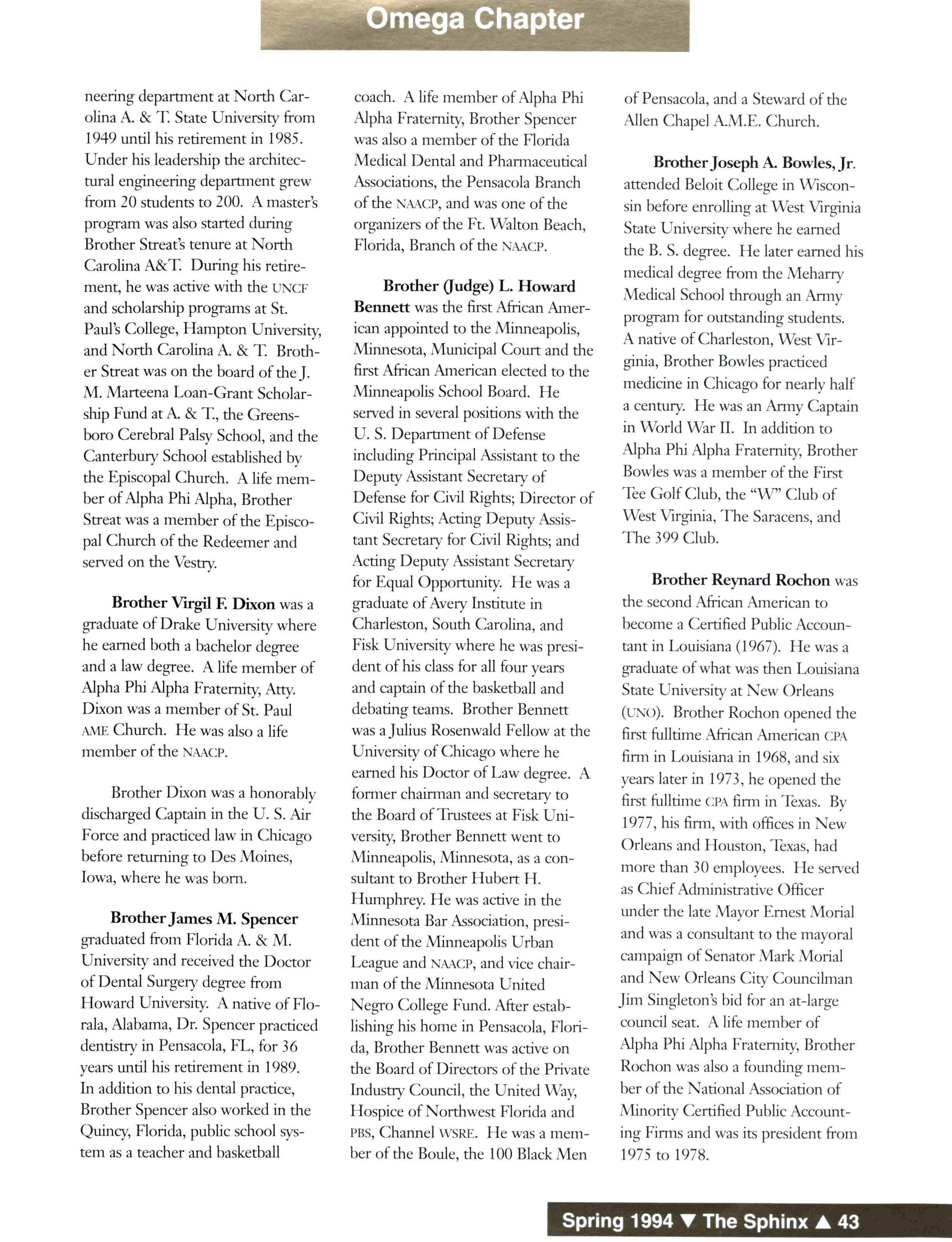 Bennett was the first African American appointed to the Minneapolis, Minnesota, Municipal Court and the first African American elected to the Minneapolis School Board. He served in several positions with the U S Department of Defense including Principal Assistant to the Deputy Assistant Secretary of Defense for Civil Rights; Director of Civil Rights;Acting Deputy Assistant Secretary for Civil Rights; and Acting Deputy Assistant Secretary for Equal Opportunity. He wasa graduate of Avery Institute in Charleston, South Carolina, and Fisk University where he was president of his class for all four years and captain of the basketball and debating teams. Brother Bennett was aJulius Rosenwald Fellow at the University of Chicago where he earned his Doctor of Law degree A former chairman and secretary to the Board of Trustees at Fisk University, Brother Bennett went to Minneapolis, Minnesota, as a consultant to Brother Hubert H. Humphrey. He was active in the Minnesota Bar Association, president of the Minneapolis Urban League and NAACP, and vice chairman of the Minnesota United Negro College Fund After establishing his home in Pensacola, Florida, Brother Bennett was active on the Board of Directors of the Private Industry Council, the United Way, Hospice of Northwest Florida and PBS, Channel WSRE He was a member of the Boule, the 100 Black Men
