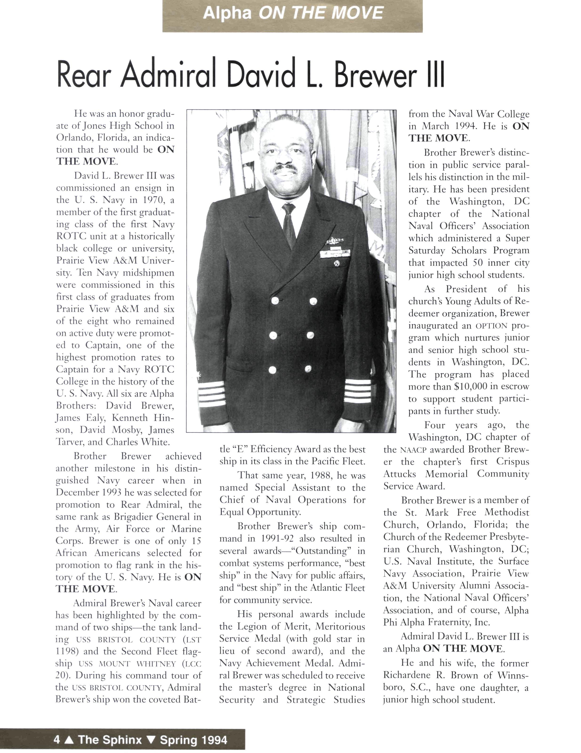Brother Brewer achieved another milestone in his distinguished Navy career when in December 1993 he was selected for promotion to Rear Admiral, the same rank as Brigadier General in the Army, Air Force or Marine Corps Brewer is one of only 15 African Americans selected for promotion to flag rank in the history of the U S Navy He is ON THE MOVE.