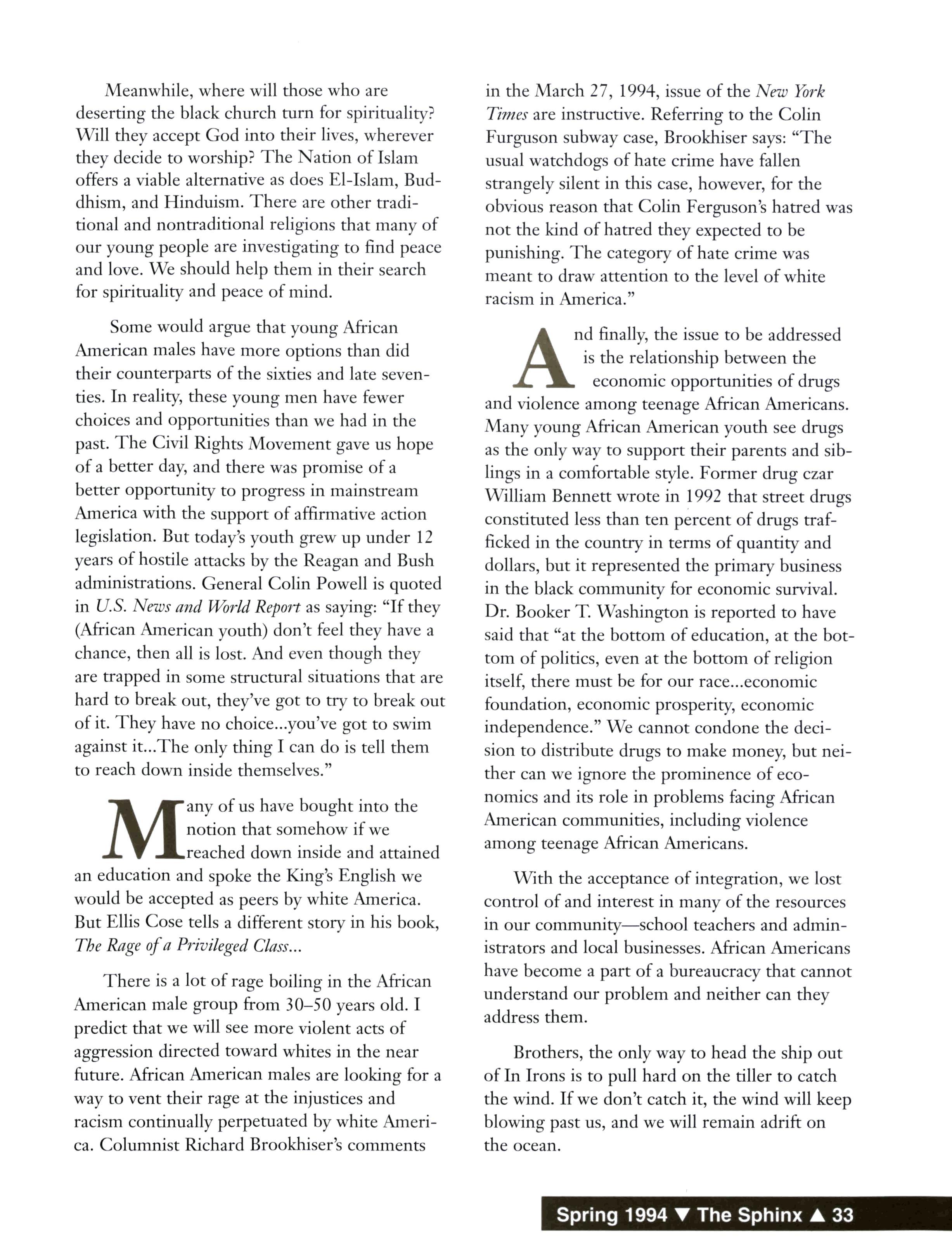 Many African Americans are still very uncomfortable with the premises of self-definition, self-control, self-implementation, and selfdirection without white validation. It is unfortunate that large numbers of well-educated African American males are largely ignorant about their brilliant heritage and genius as men of African descent and their contributions to this country and the world. It is important that we begin to educate ourselves, and others, about our rich and hidden history. We must begin a dialogue with each other and launch some form of action to fill the void in the lives of young African American males The truth must be sought at all costs. Violence and its causes are no exception.