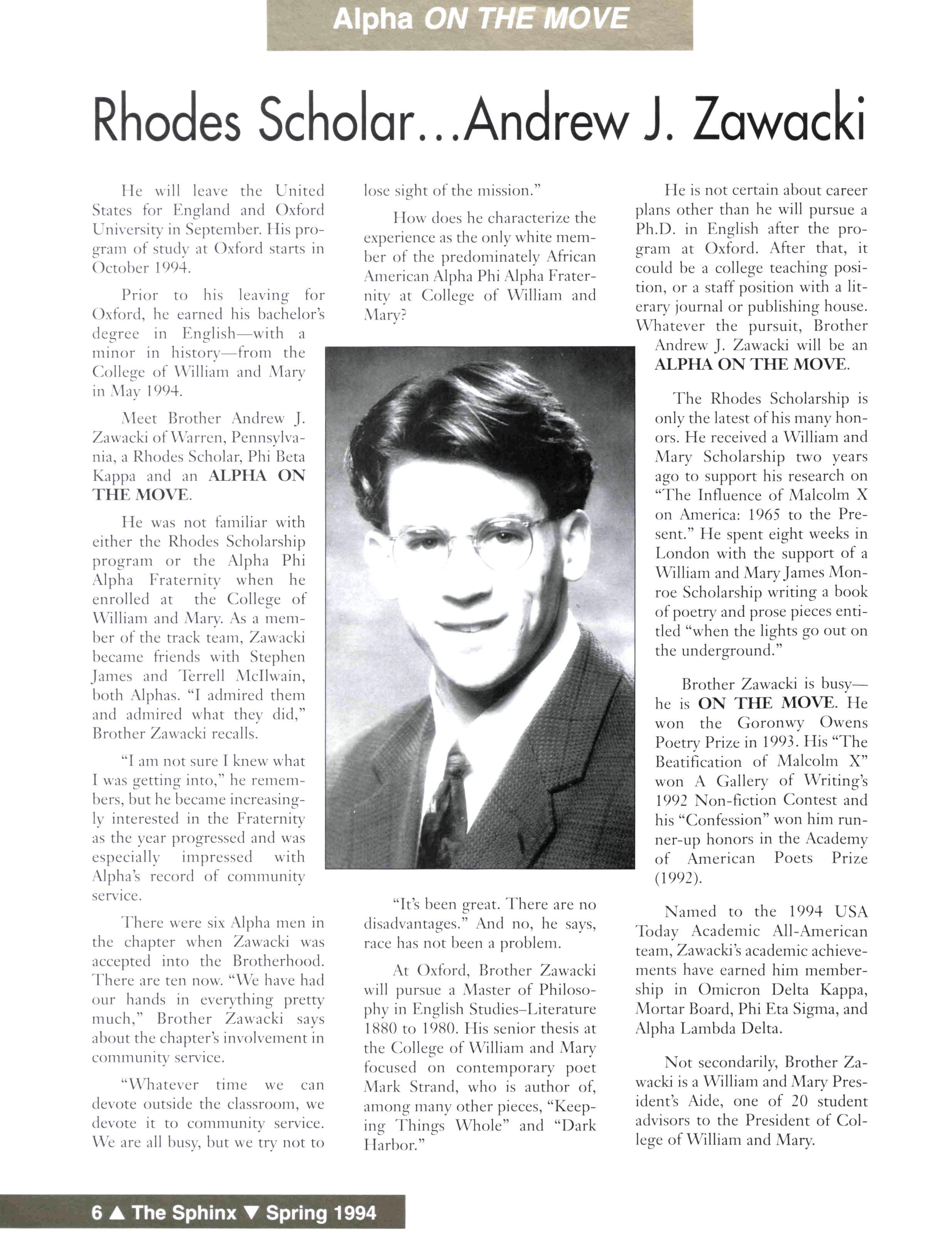 Meet Brother Andrew J. Zawacki of Warren, Pennsylvania, a Rhodes Scholar, Phi Beta Kappa and an ALPHA ON THE MOVE.