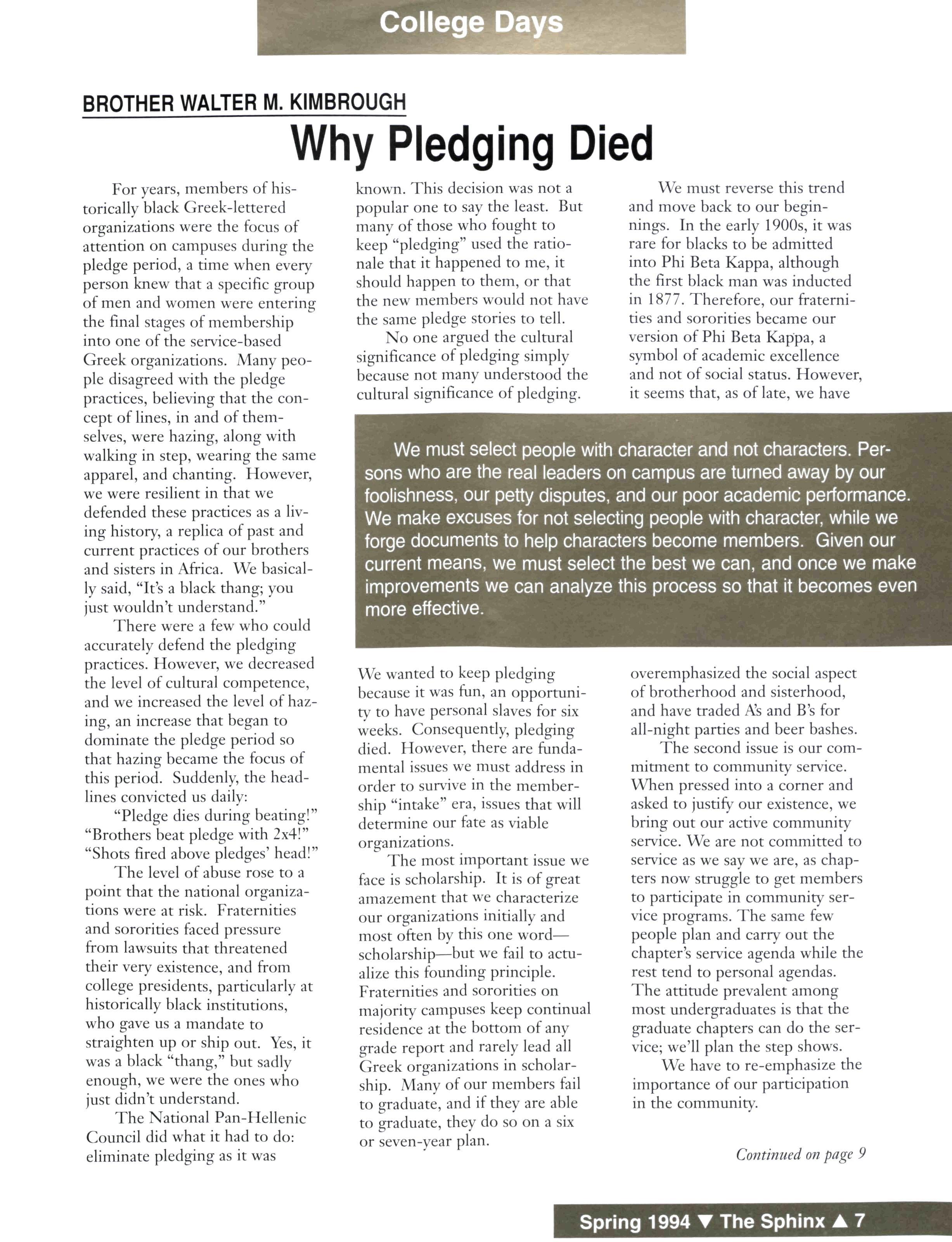 We wanted to keep pledging because it was fun, an opportunity to have personal slaves for six weeks Consequently, pledging died However, there are fundamental issues we must address in order to survive in the membership "intake" era, issues that will determine our fate as viable organizations