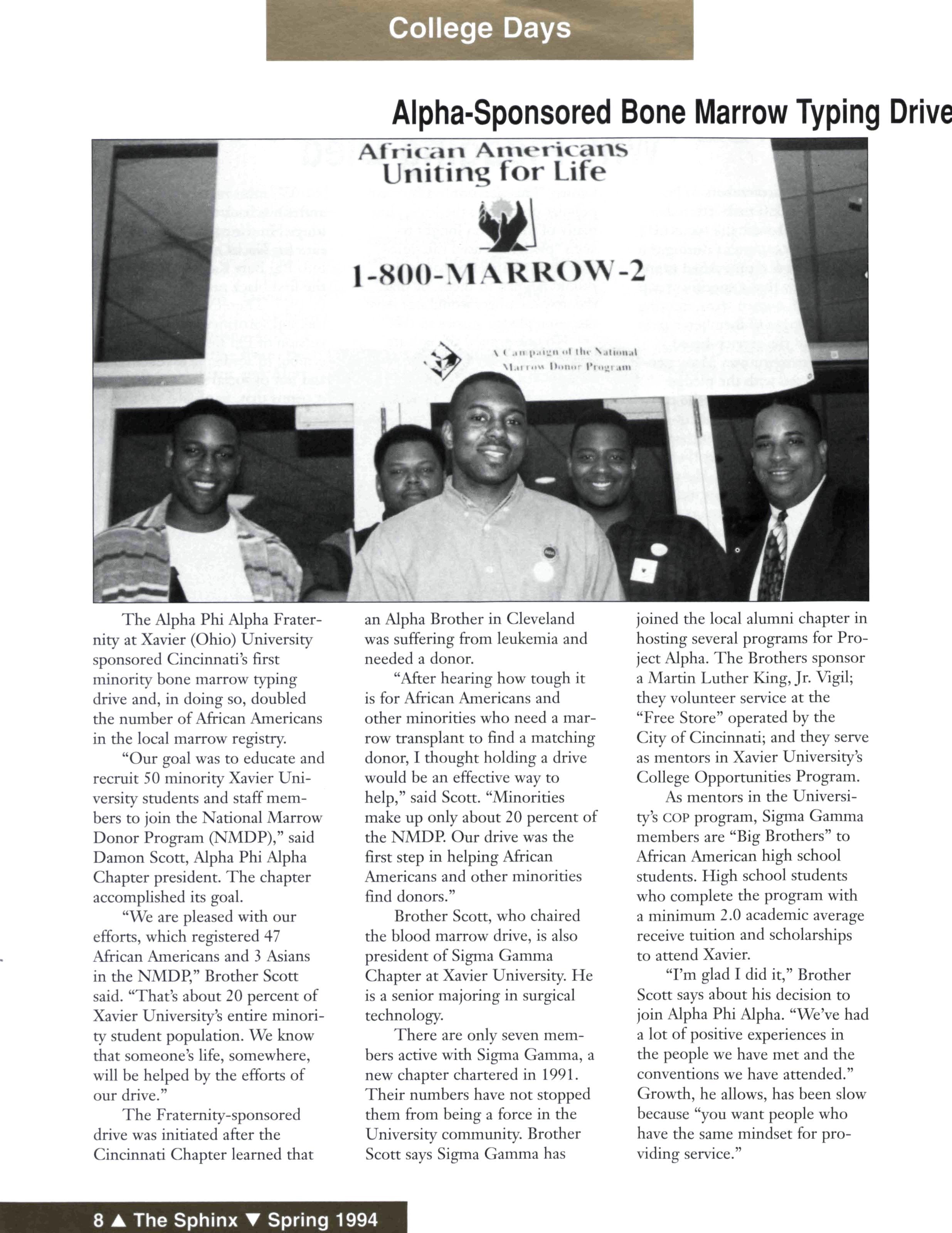 The Alpha Phi Alpha Fraternity at Xavier (Ohio) University sponsored Cincinnati's first minority bone marrow typing drive and, indoing so, doubled the number of African Americans in the local marrow registry