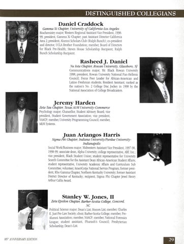 DISTINGUISHED COLLEGIANS Daniel Craddock Gamma Xi Chapter, University of California-Los Angeles Biochemistry major; Western Regional Assistant Vice President, 199899; president, Gamma Xi Chapter; past Assistant Director California Area 2; president, Alumni Scholars Club (Ralph Bunch); co-president and director, UCLA Brother Foundation; member, Board of Directors for Black Pre-Health; Steven House Scholarship Recipient; Ralph Bunch Scholarship Recipient.