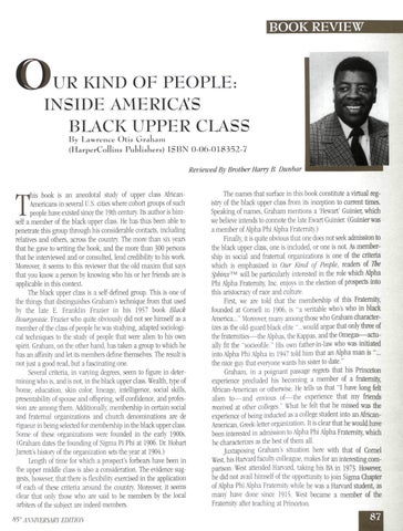 The names that surface in this book constitute a virtual registry of the black upper class from its inception to current times. Speaking of names, Graham mentions a 'Hewart' Guinier, which we believe intends to connote the late Ewart Guinier. (Guinier was a member of Alpha Phi Alpha Fraternity.) Finally, it is quite obvious that one does not seek admission to the black upper class, one is included, or one is not. As membership in social and fraternal organizations is one of the criteria which is emphasized in Our Kind of People, readers of The Sphinx™ will be particularly interested in the role which Alpha Phi Alpha Fraternity, Inc. enjoys in the election of prospects into this aristocracy of race and culture. First, we are told that the membership of this Fraternity, founded at Cornell in 1906, is "a veritable who's who in black America..." Moreover, many among those who Graham characterizes as the old-guard black elite "...would argue that only three of the fraternities—the Alphas, the Kappas, and the Omegas—actually fit the "socieofile." His own father-in-law who was initiated into Alpha Phi Alpha in 1947 told him that an Alpha man is"... the nice guy that everyone wants his sister to date." Graham, in a poignant passage regrets that his Princeton experience precluded his becoming a member of a fraternity, African-American or otherwise. He tells us that "I have long felt alien to—and envious of—the experience that my friends received at other colleges." What he felt that he missed was the experience of being inducted as a college student into an AfricanAmerican, Greek-letter organization. It is clear that he would have been interested in admission to Alpha Phi Alpha Fraternity, which he characterizes as the best of them all. Juxtaposing Graham's situation here with that of Cornel West, his Harvard faculty colleague, makes for an interesting comparison. West attended Harvard, taking his BA in 1973. However, he did not avail himself of the opportunity to join Sigma Chapter of Alpha Phi Alpha Fraternity while he was a Harvard student, as many have done since 1915. West became a member of the Fraternity after teaching at Princeton.