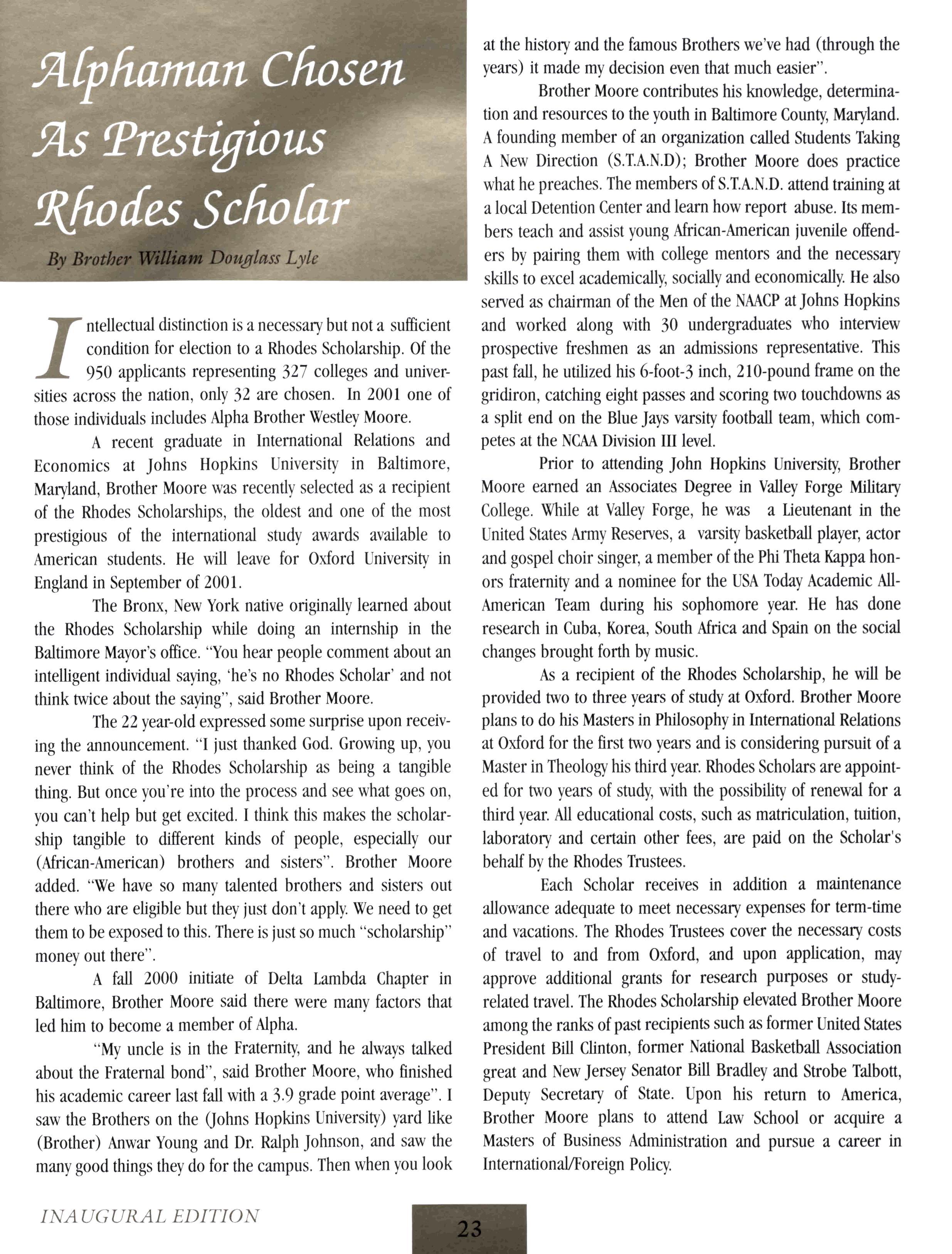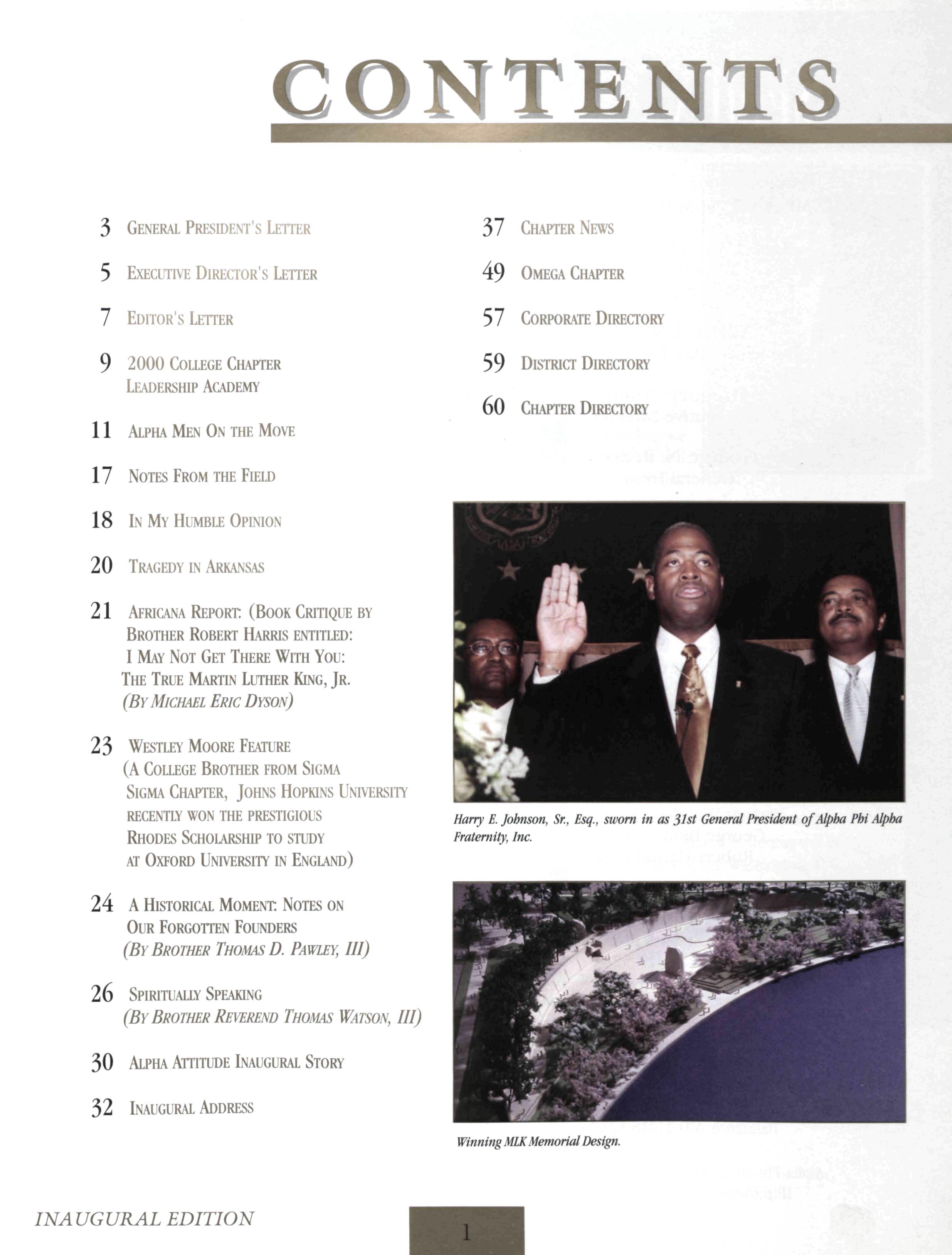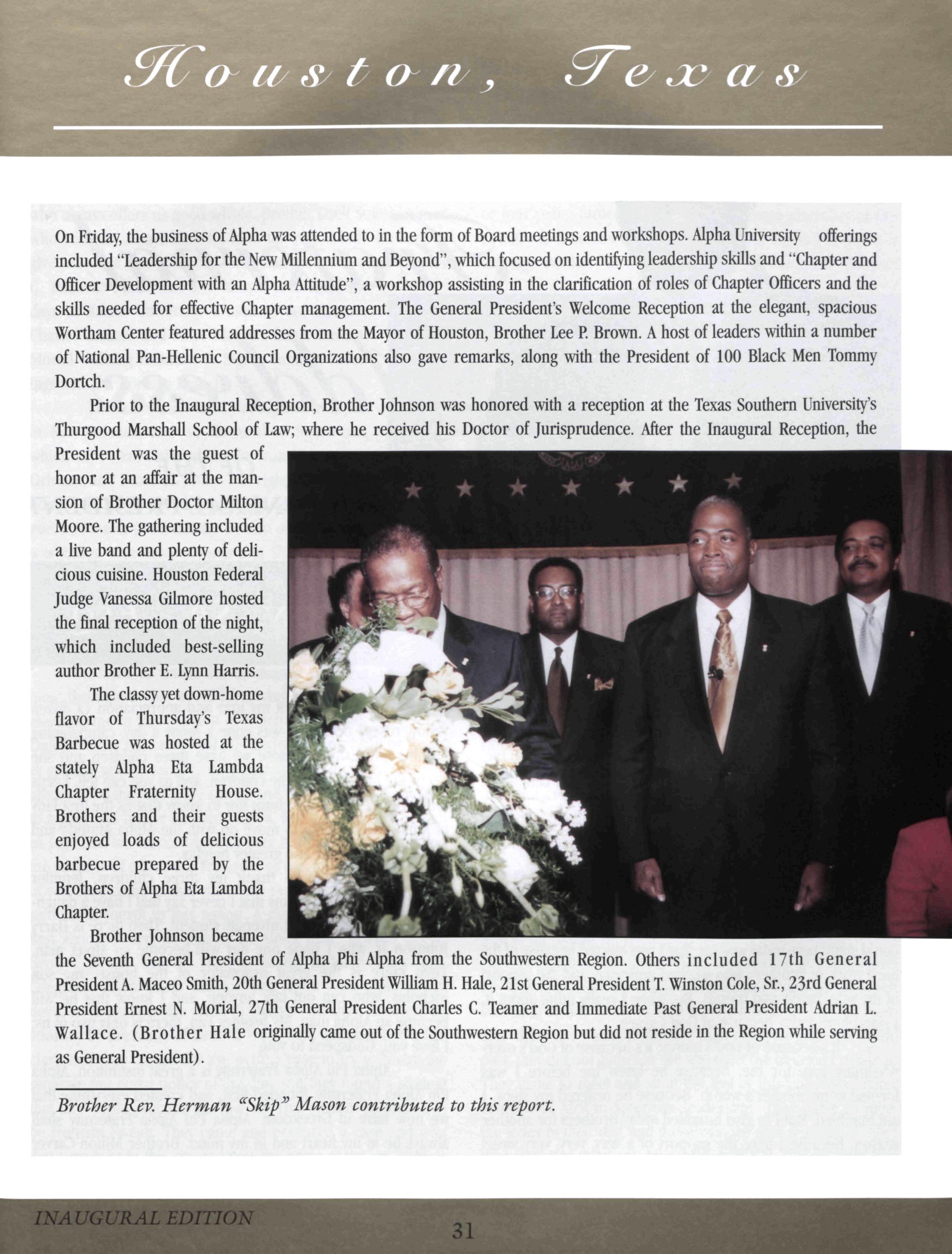 This edition highlights the happenings in Houston, including President Johnson's Inaugural Address. It also offers an introduction to Brother Westley Moore, a Rhodes Scholar recipient and a neophyte member of Delta Lambda Chapter Our National Historian, Brother Dr Robert Harris,Jr., gives the reader a provocative look at renown author Eric Michael Dyson's Book; / Might Not Get There With You: The True Martin Luther King, Jr.
