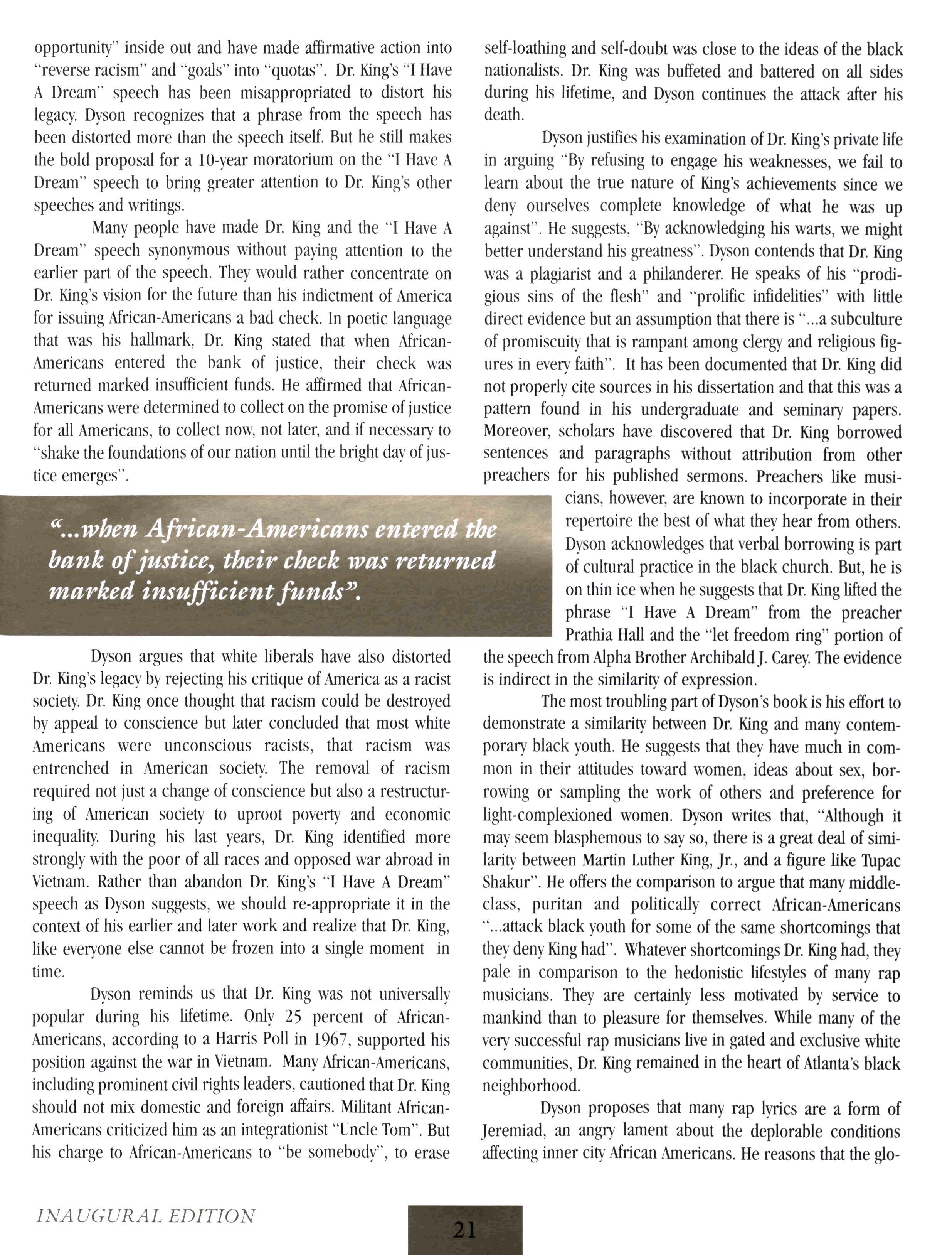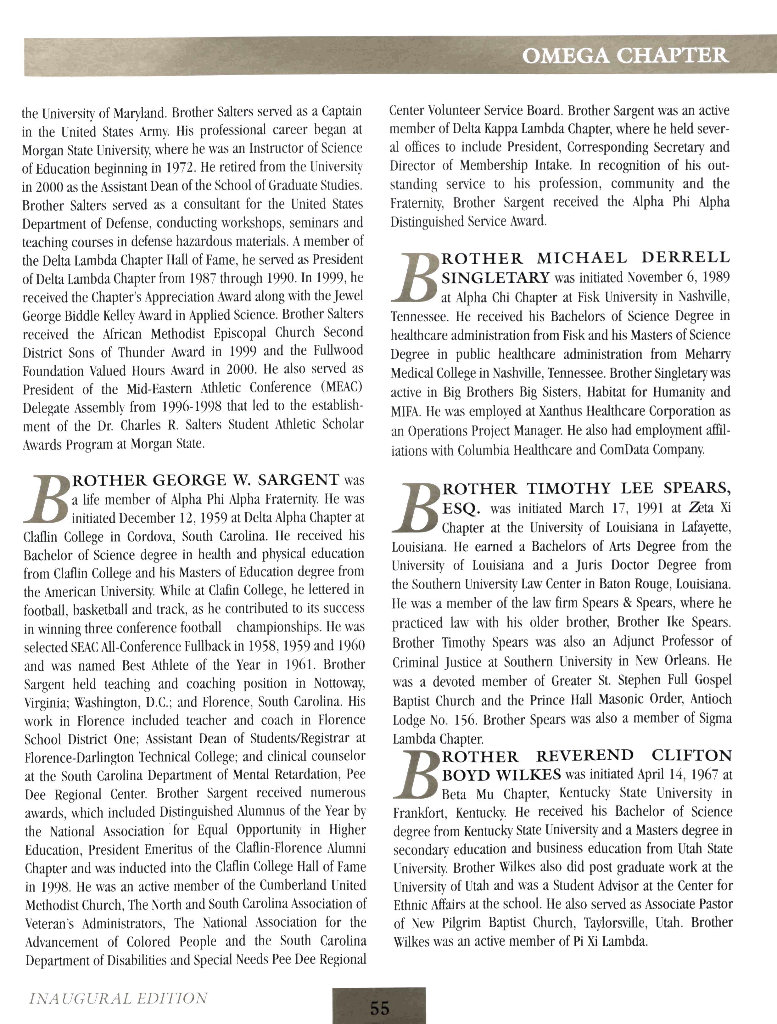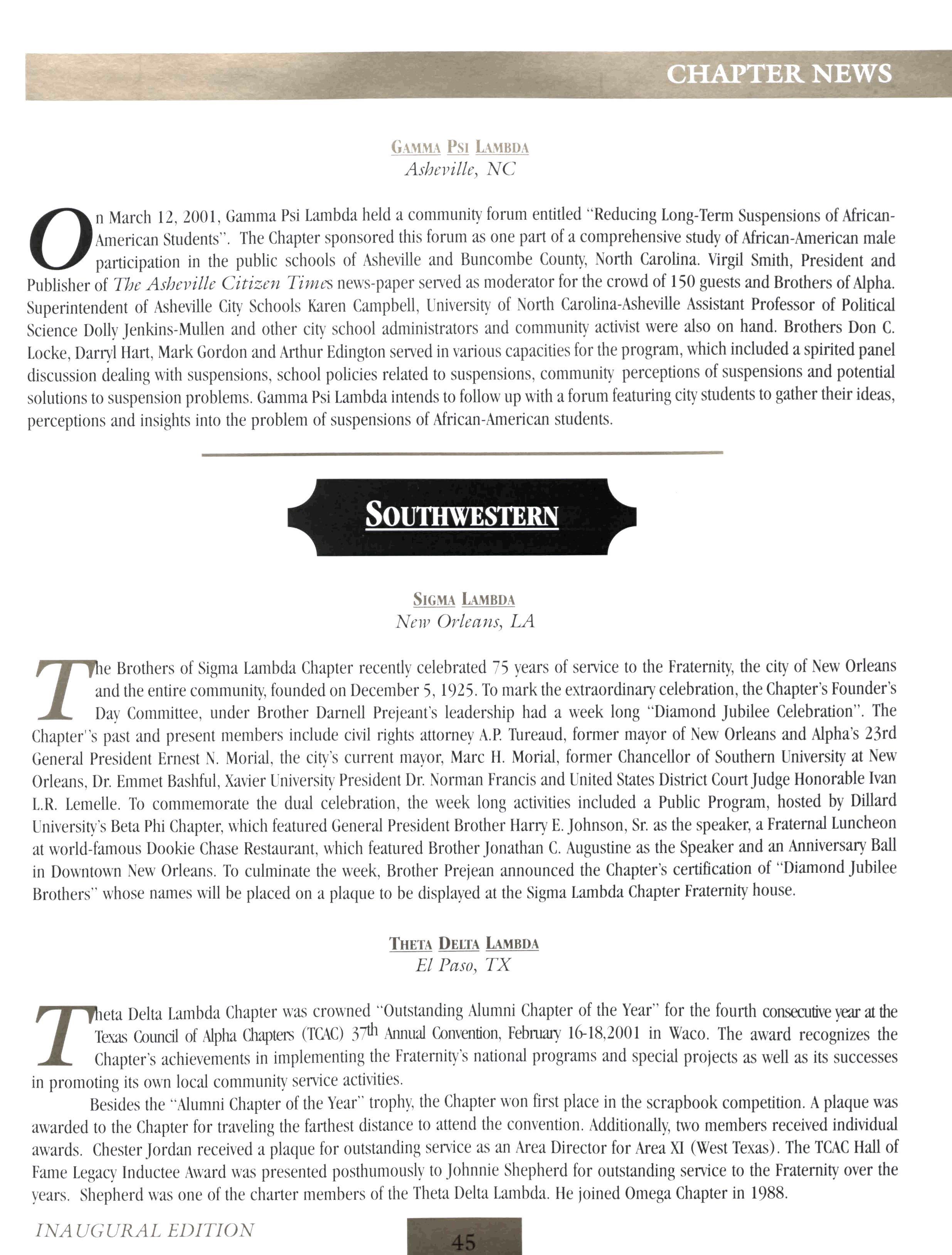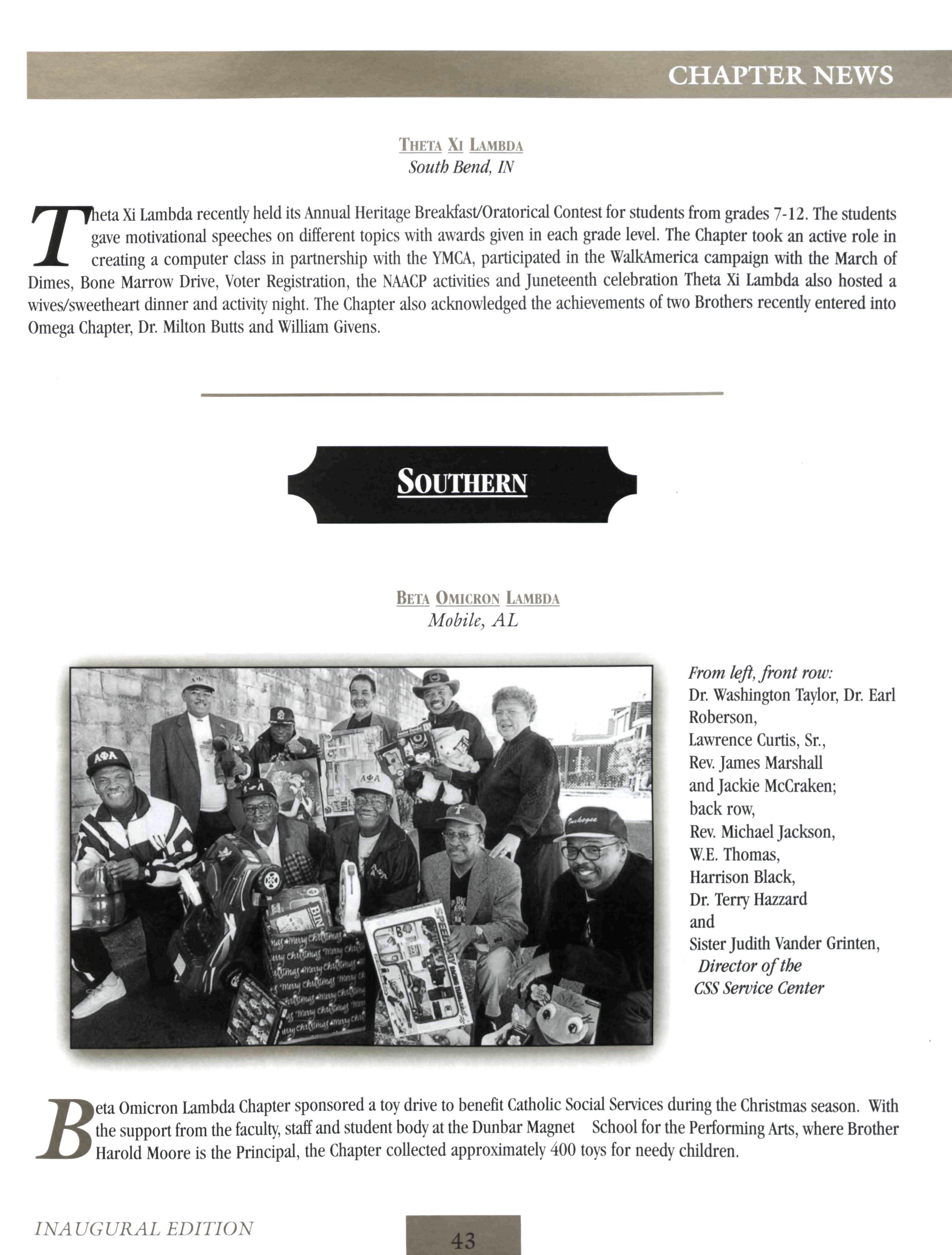 This edition highlights the happenings in Houston, including President Johnson's Inaugural Address. It also offers an introduction to Brother Westley Moore, a Rhodes Scholar recipient and a neophyte member of Delta Lambda Chapter Our National Historian, Brother Dr Robert Harris,Jr., gives the reader a provocative look at renown author Eric Michael Dyson's Book; / Might Not Get There With You: The True Martin Luther King, Jr.